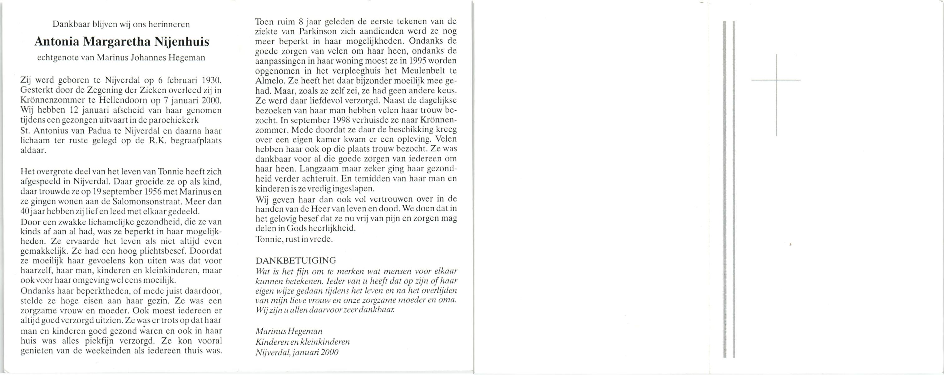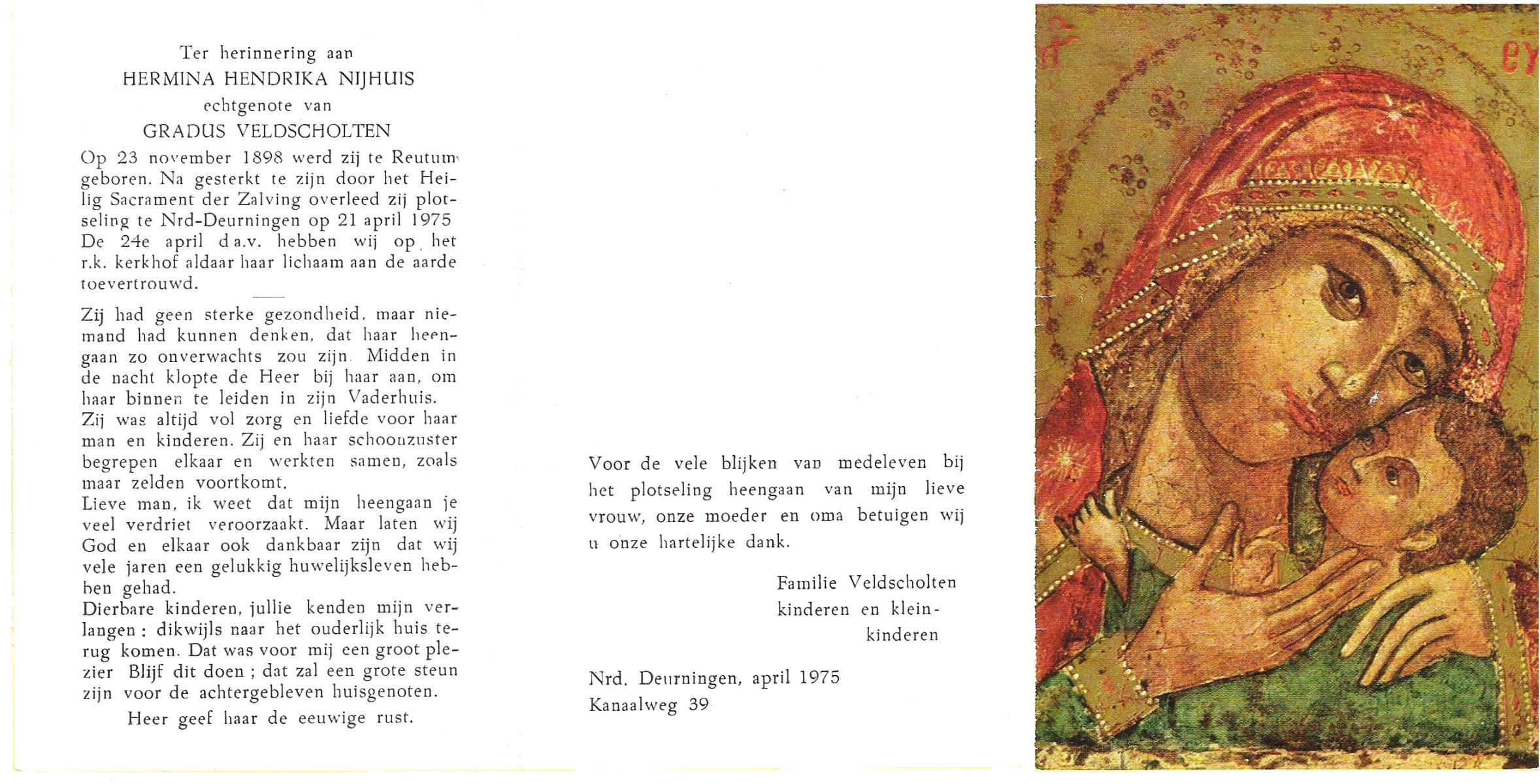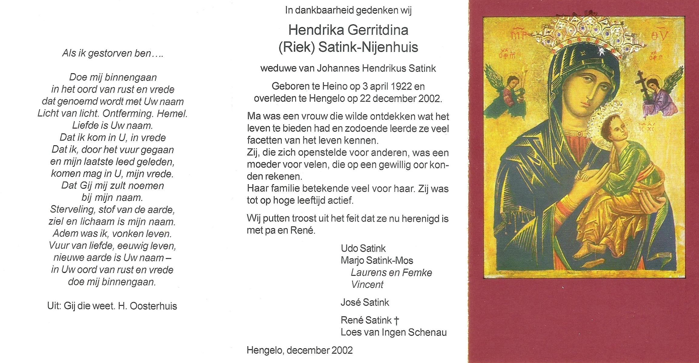 NIJHUIS, , Hendrika Maria, geboren op 1-1-1924 te Langeveen, overleden op 27-12-1999 te Almelo op 75-jarige leeftijd, begraven op 30-12-1999 te Almelo, rk.