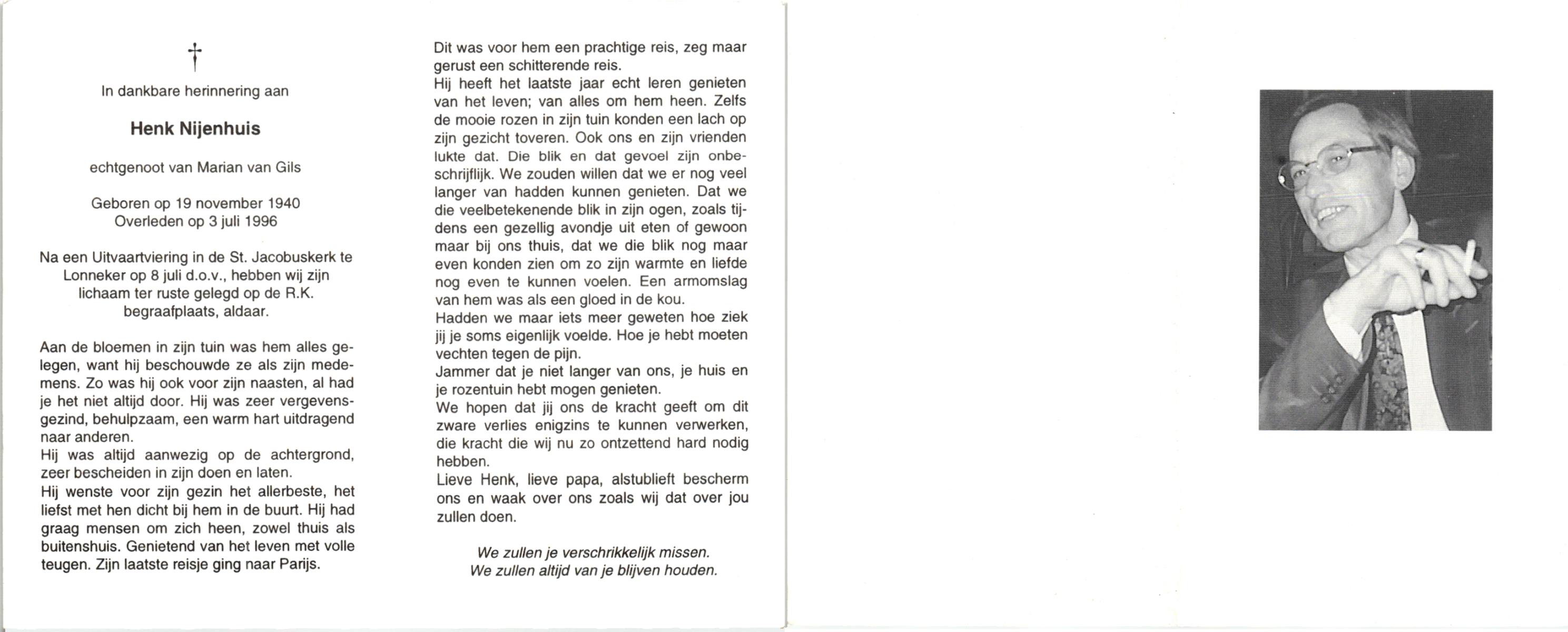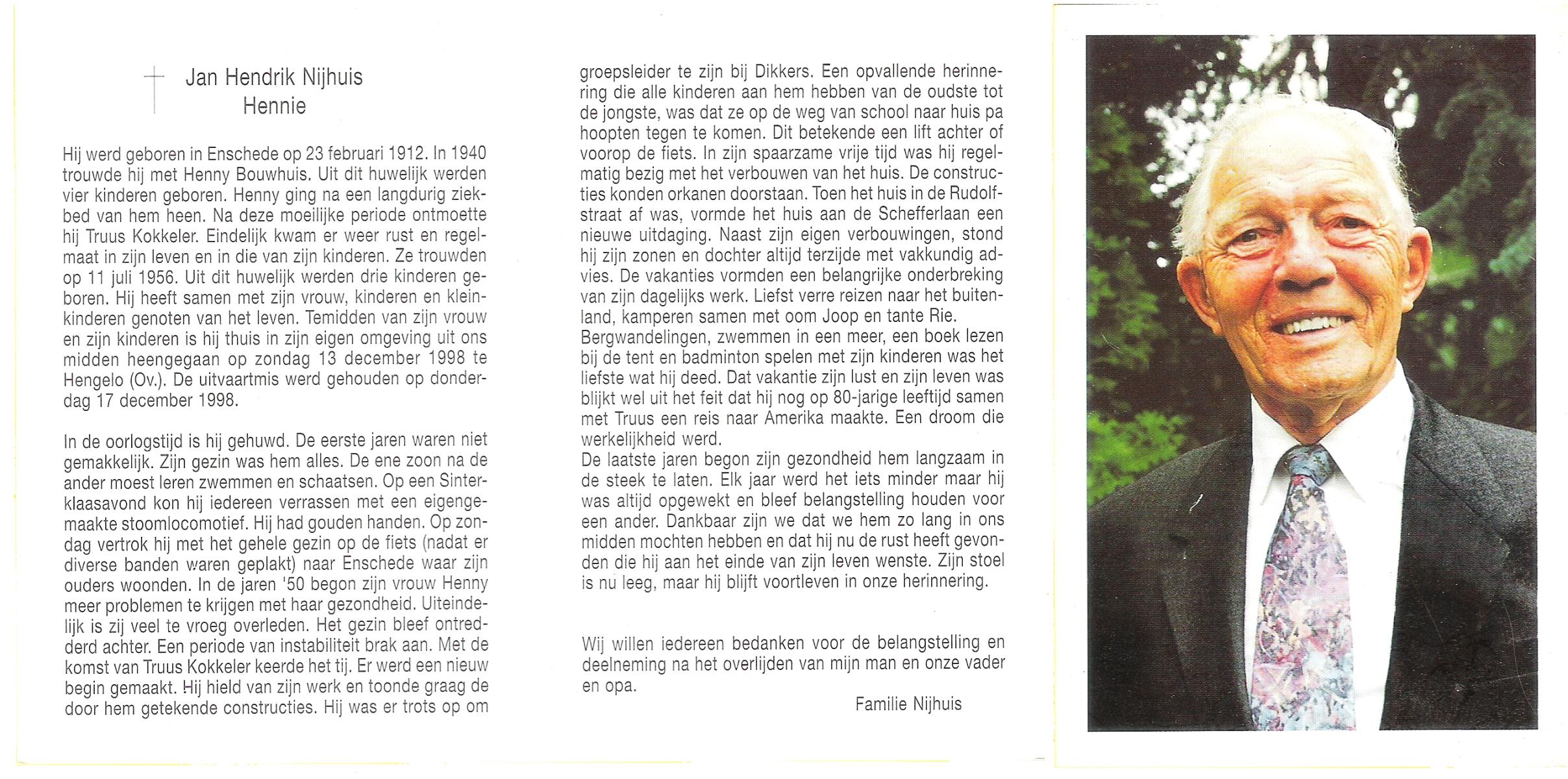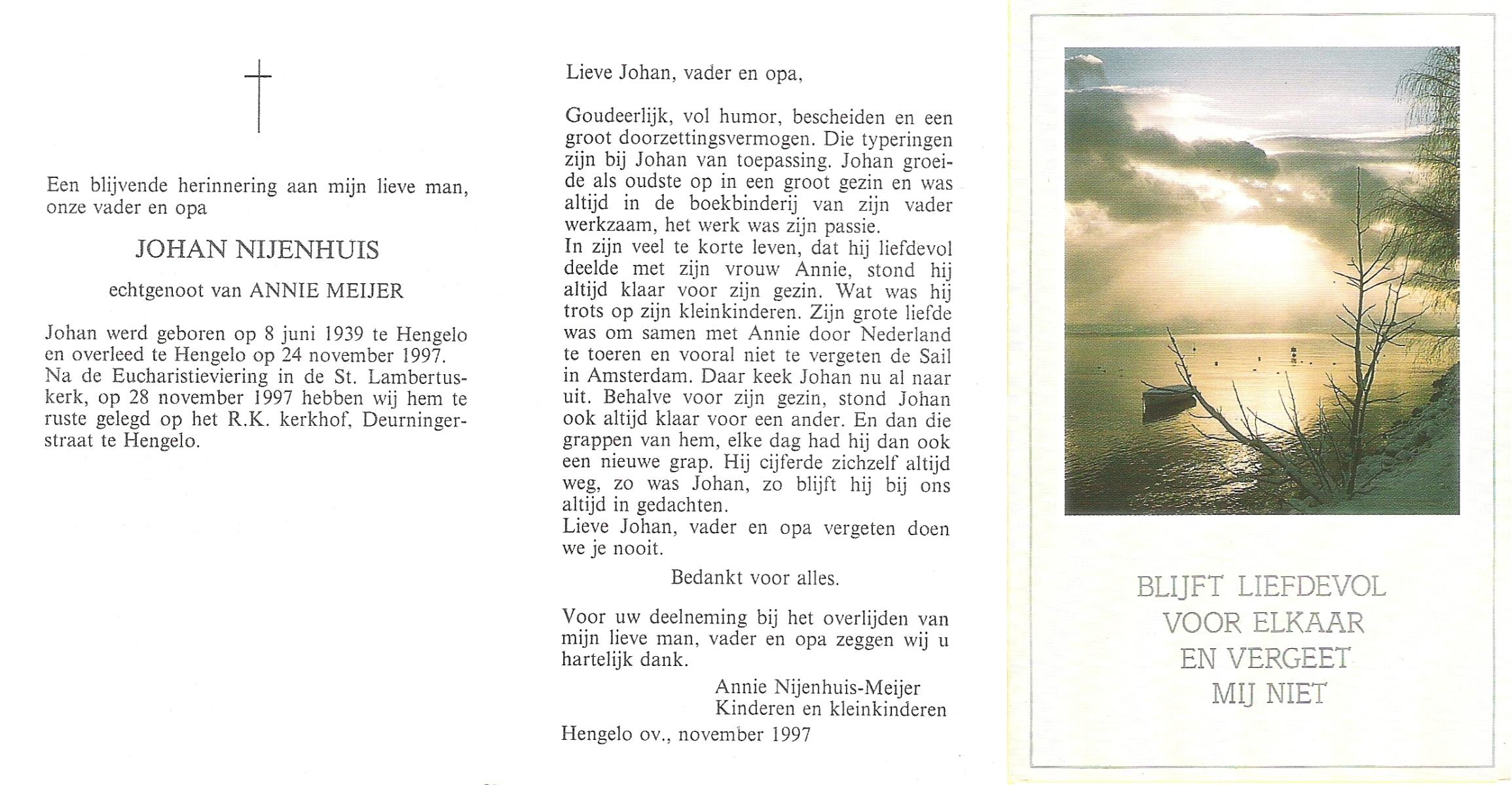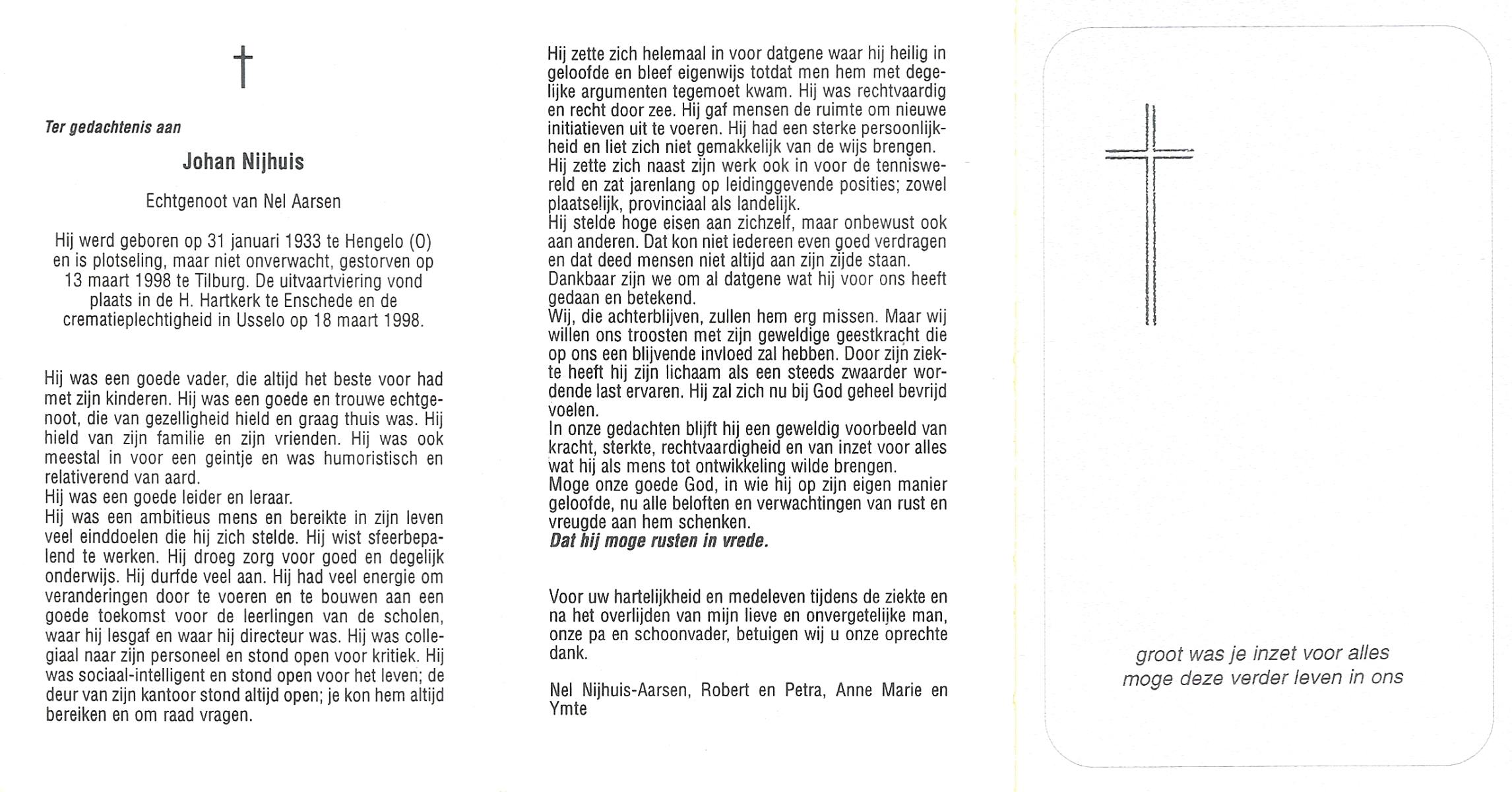 NIJHUIS, Johan, geboren op 31-1-1933 te Hengelo (O), overleden op 13-3-1998 te Tilburg op 65-jarige leeftijd, gecremeerd op 18-3-1998 te Usselo.