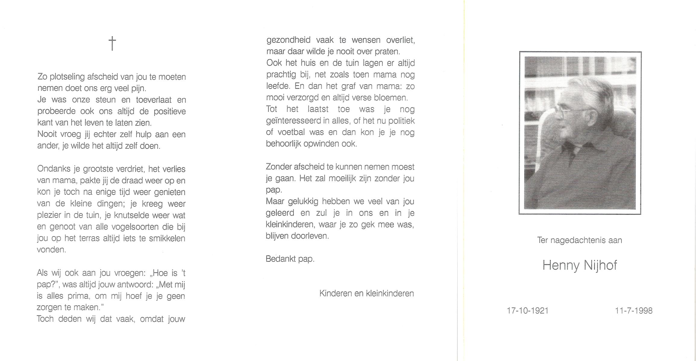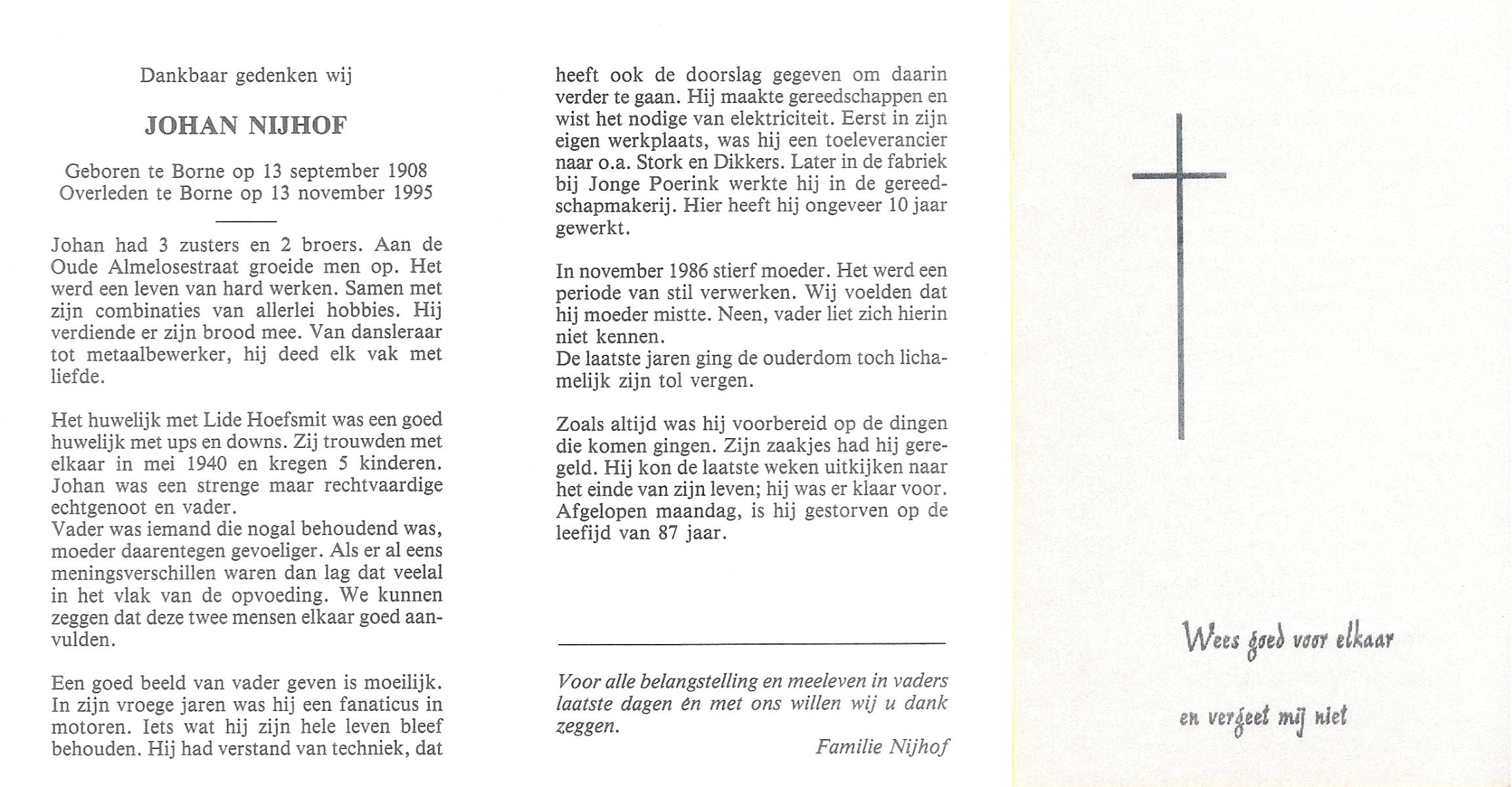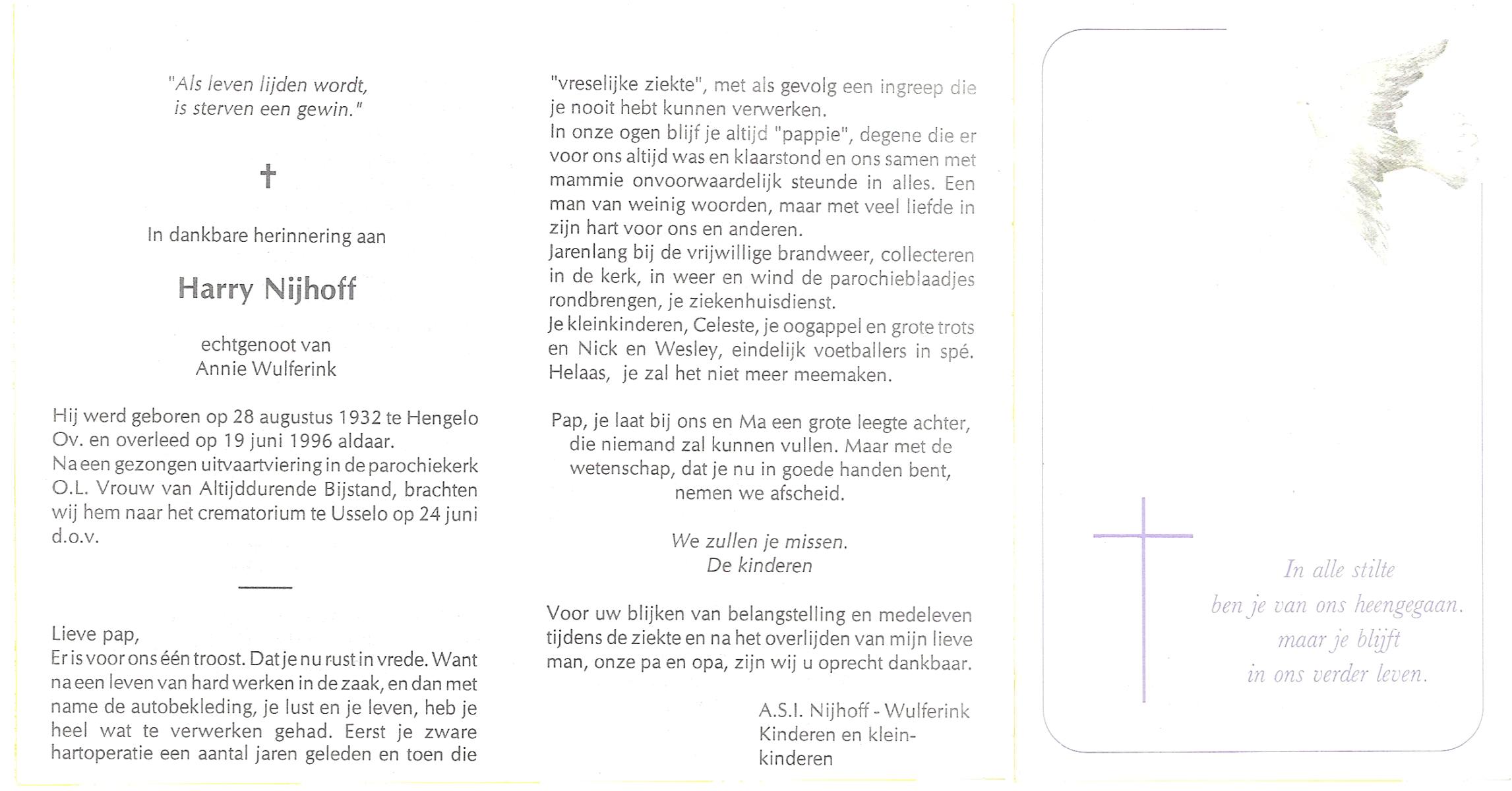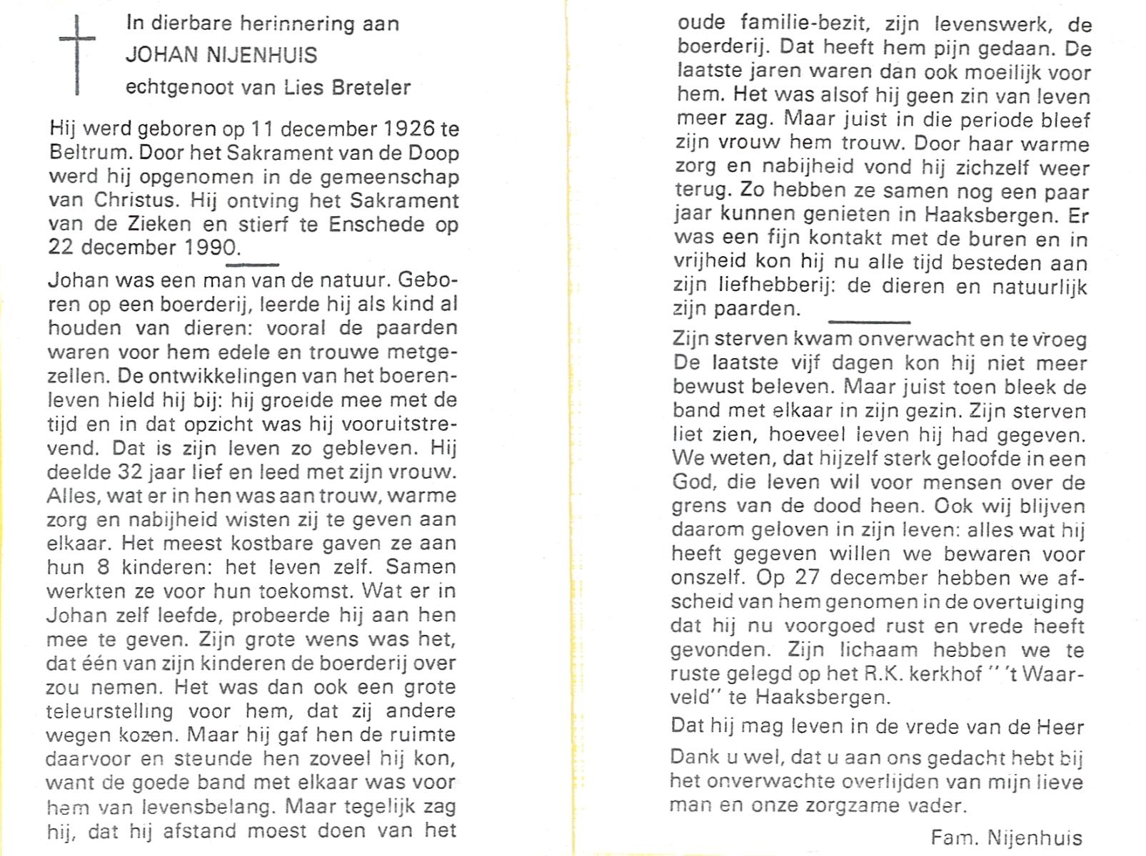 NIJHUIS, Johan, geboren op 31-1-1933 te Hengelo (O), overleden op 13-3-1998 te Tilburg op 65-jarige leeftijd, gecremeerd op 18-3-1998 te Usselo.