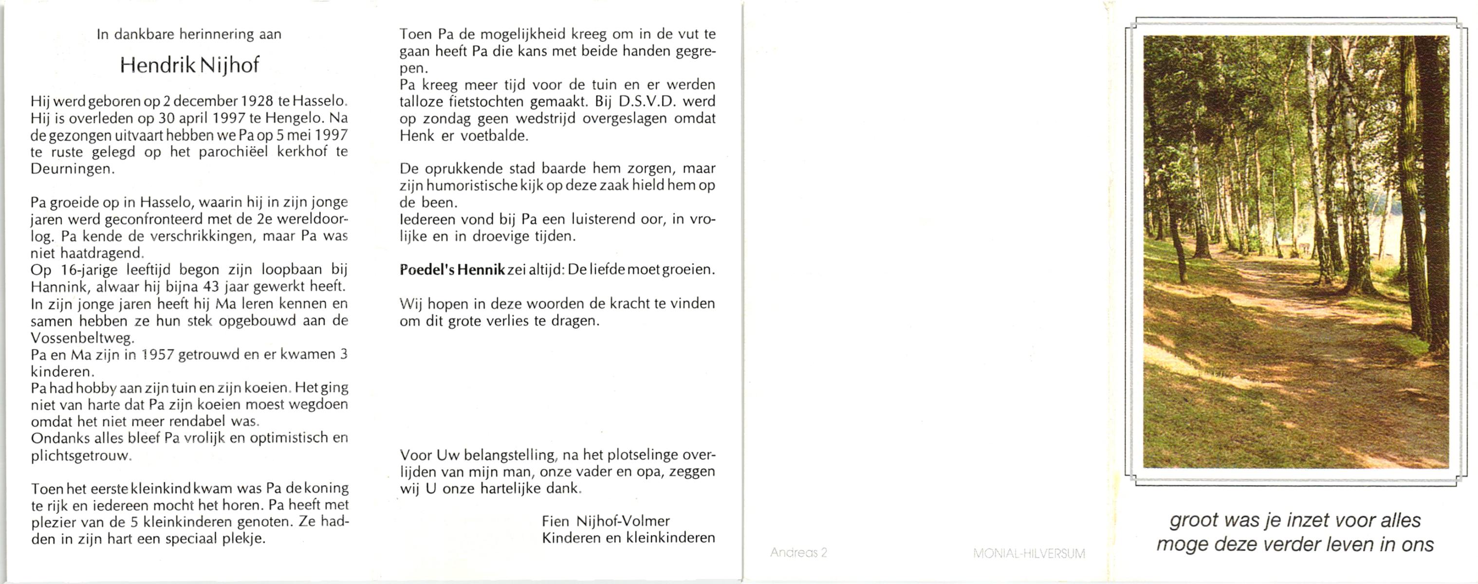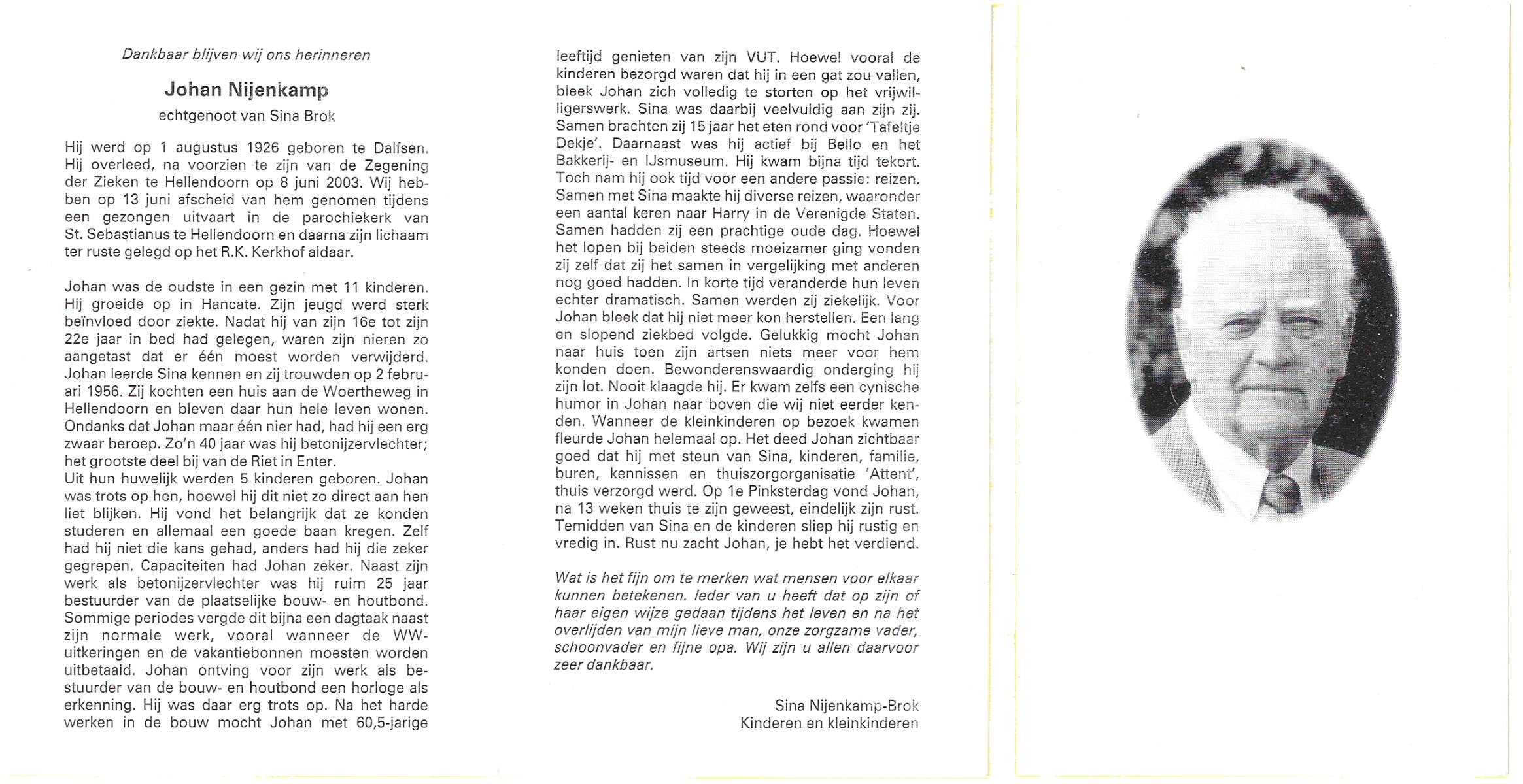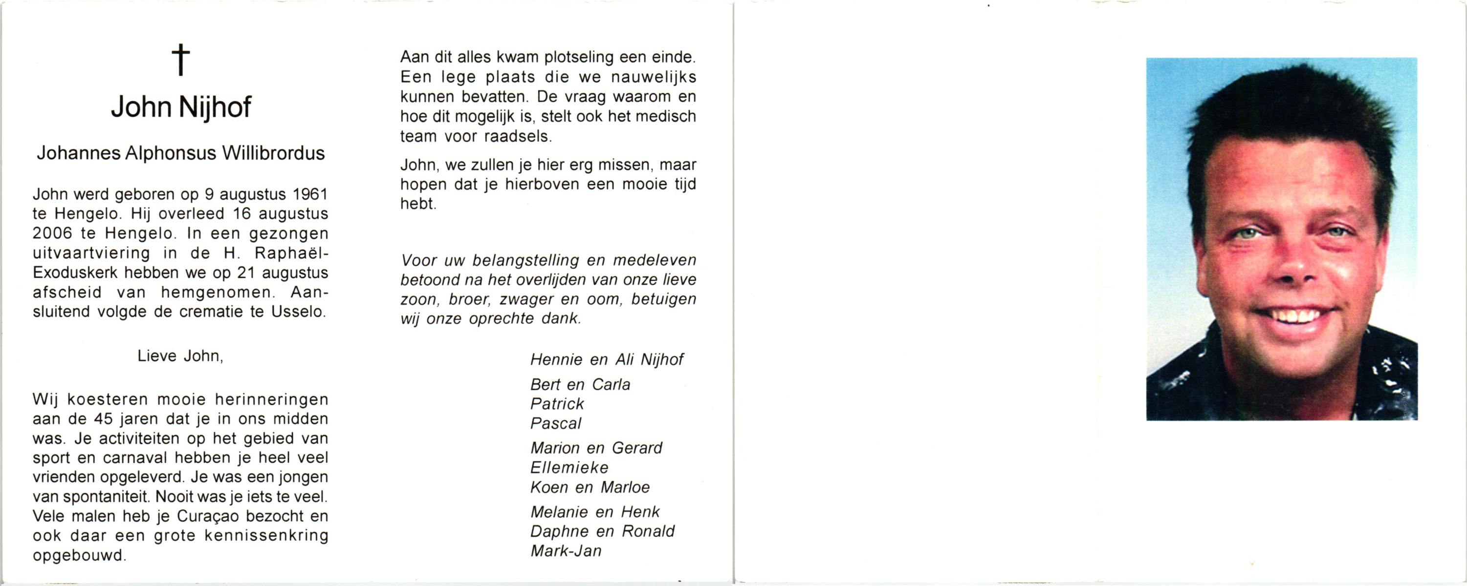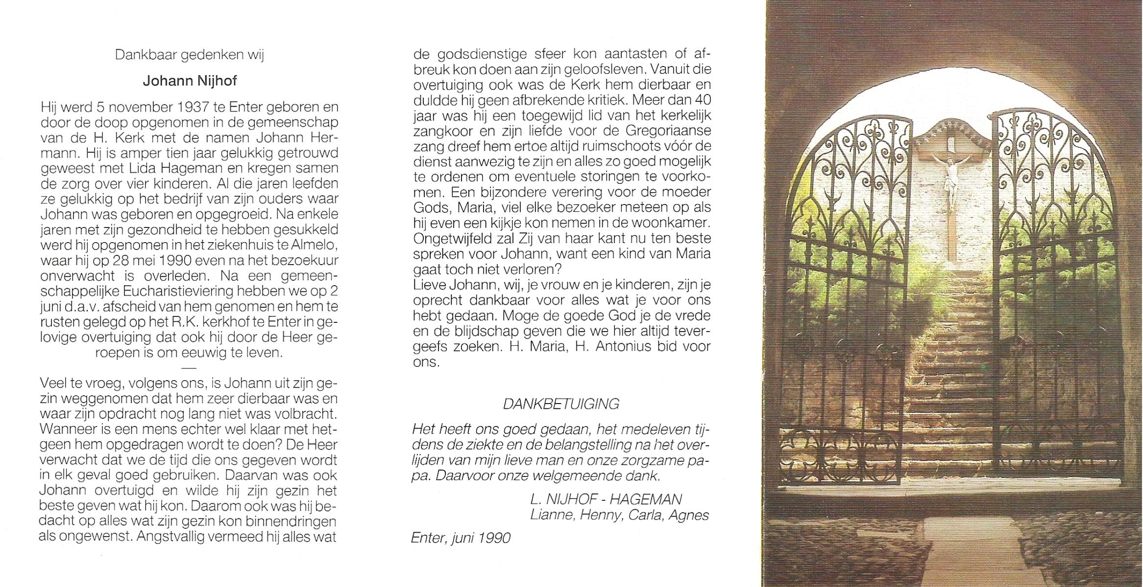 NIJHUIS, Johan, geboren op 31-1-1933 te Hengelo (O), overleden op 13-3-1998 te Tilburg op 65-jarige leeftijd, gecremeerd op 18-3-1998 te Usselo.