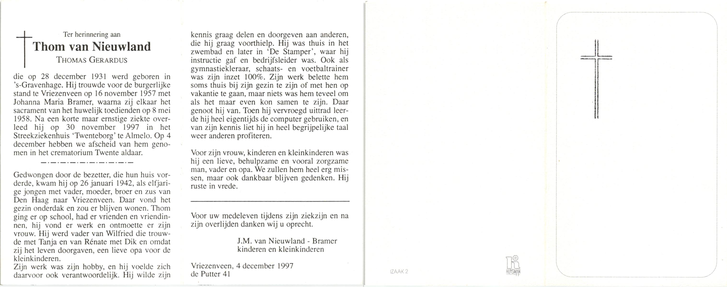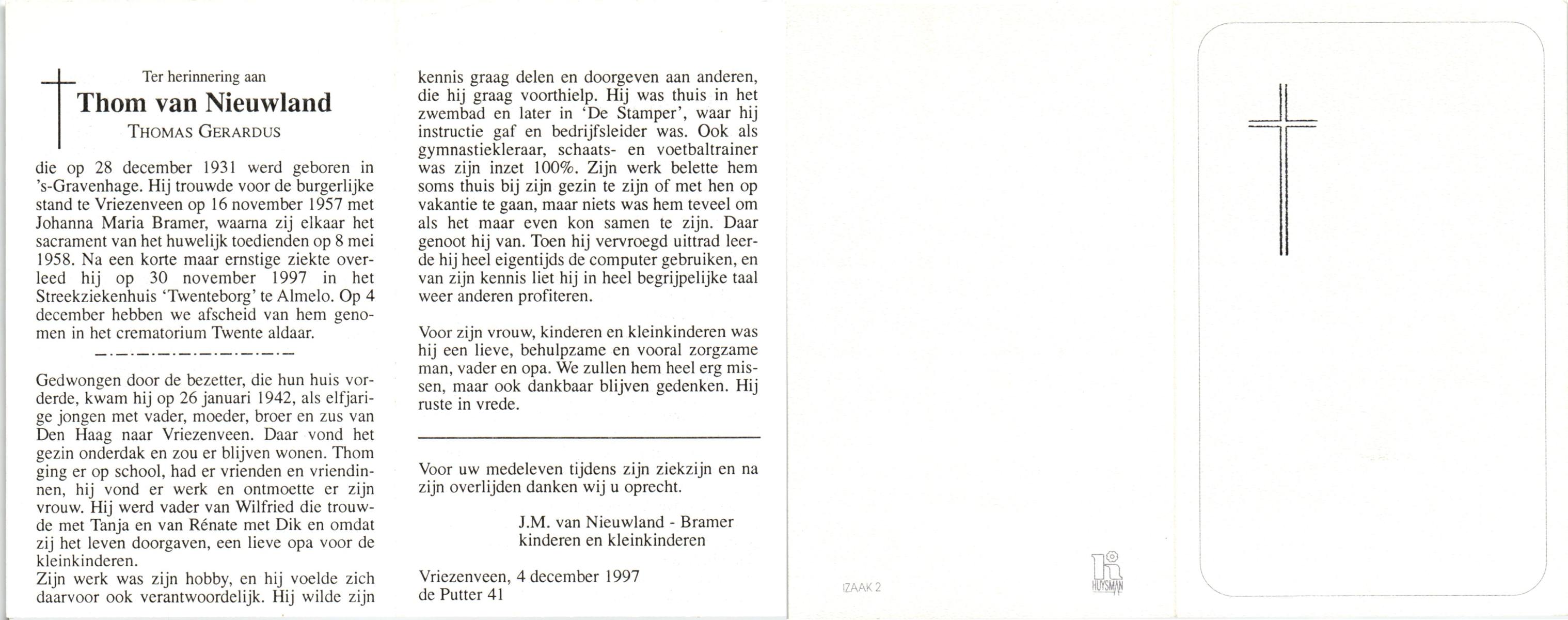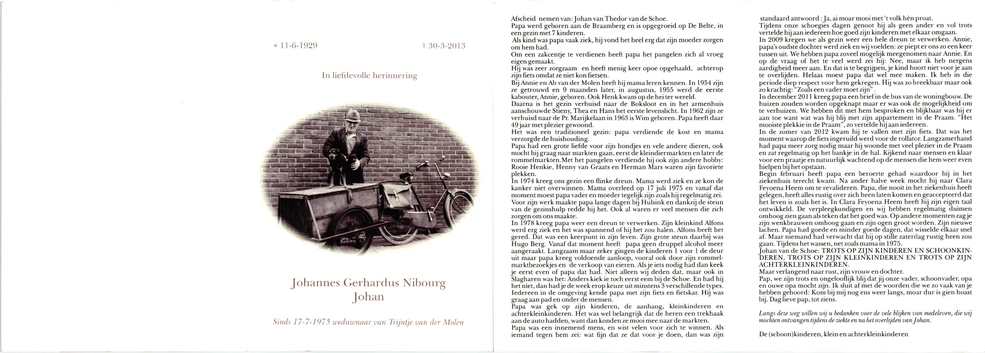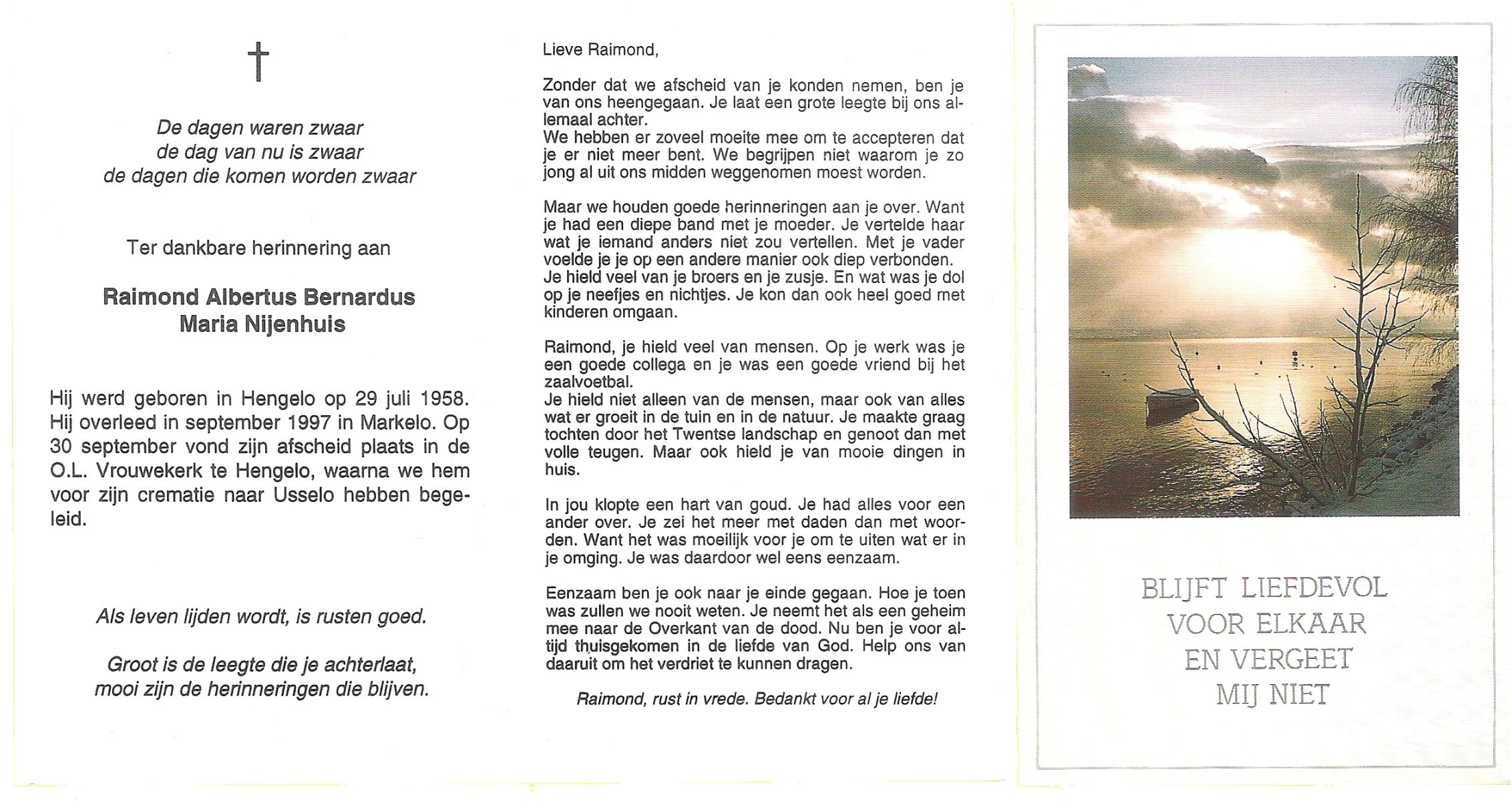 NIJHUIS, Johan, geboren op 31-1-1933 te Hengelo (O), overleden op 13-3-1998 te Tilburg op 65-jarige leeftijd, gecremeerd op 18-3-1998 te Usselo.