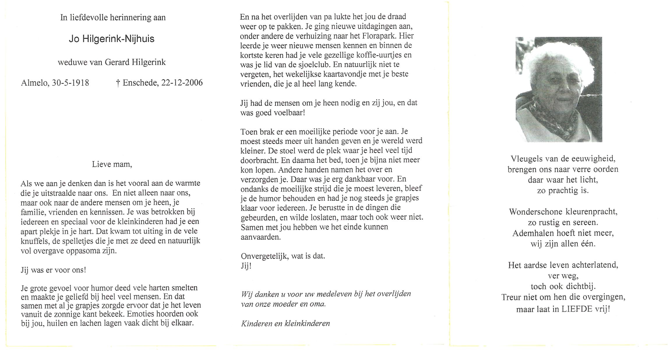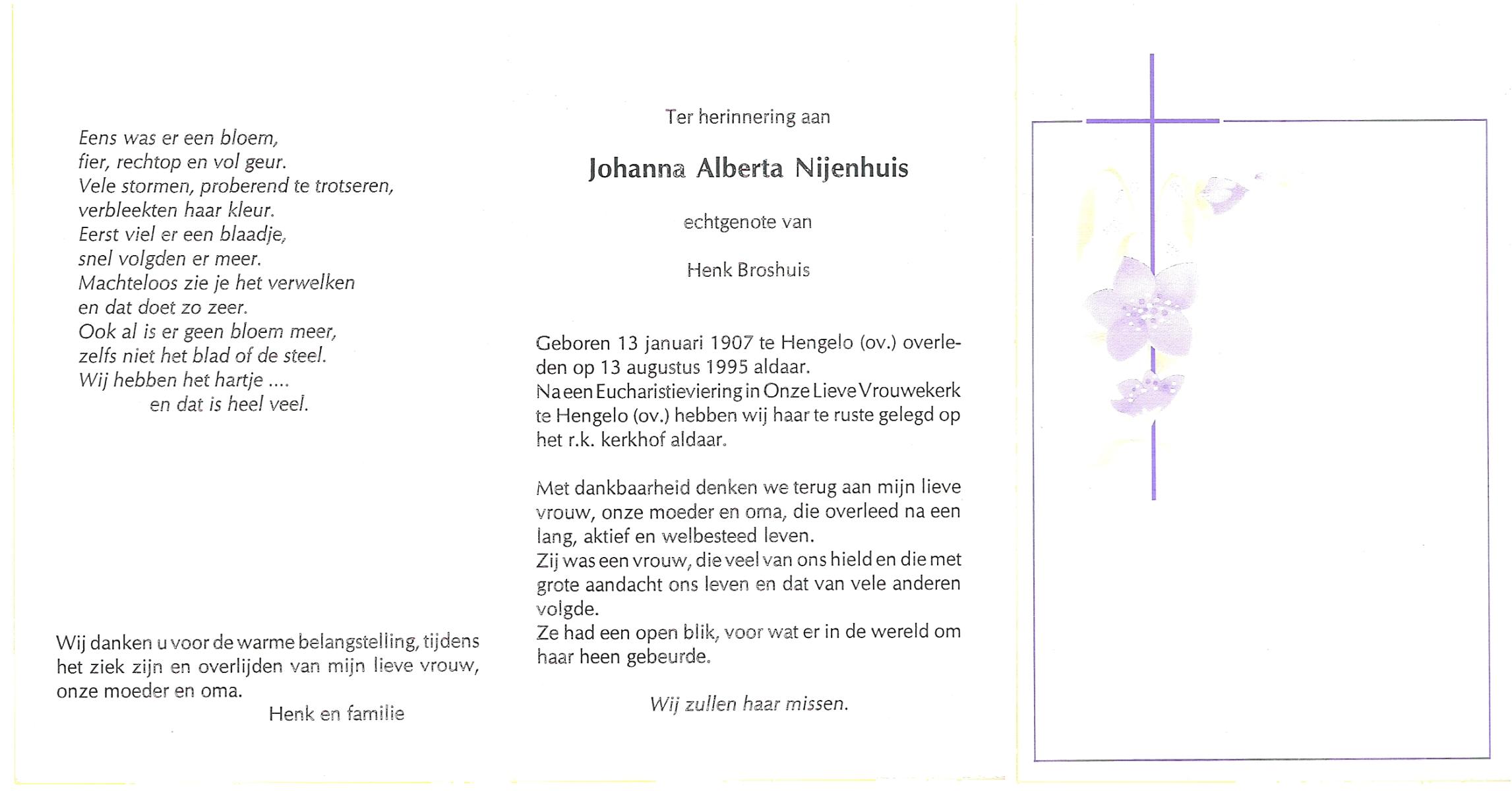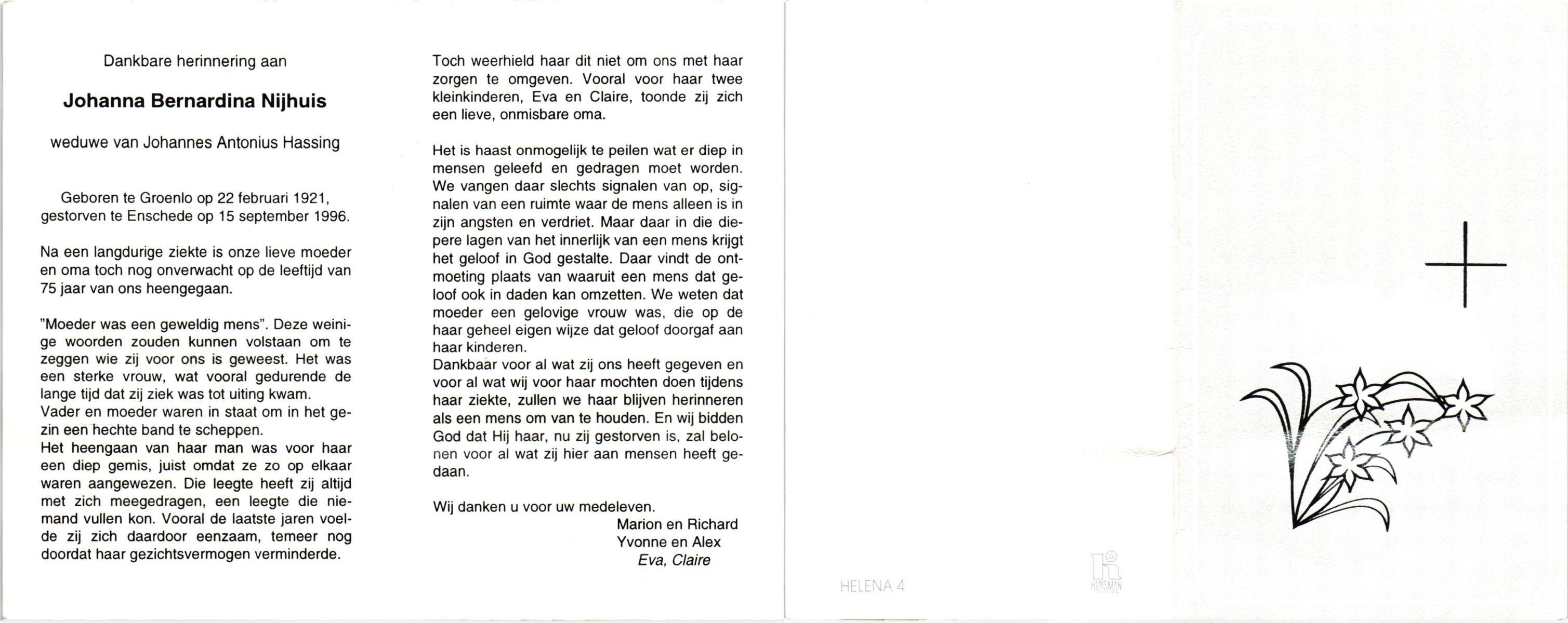 NIJHUIS, Johanna Bernardina, geboren op 22-2-1921 te Groenlo, overleden op 15-9-1996 te Enschede op 75-jarige leeftijd.