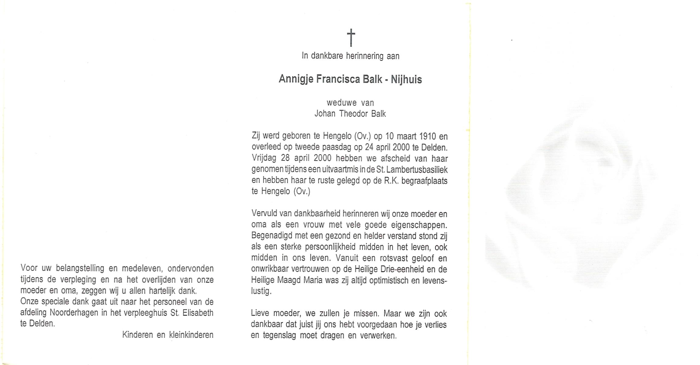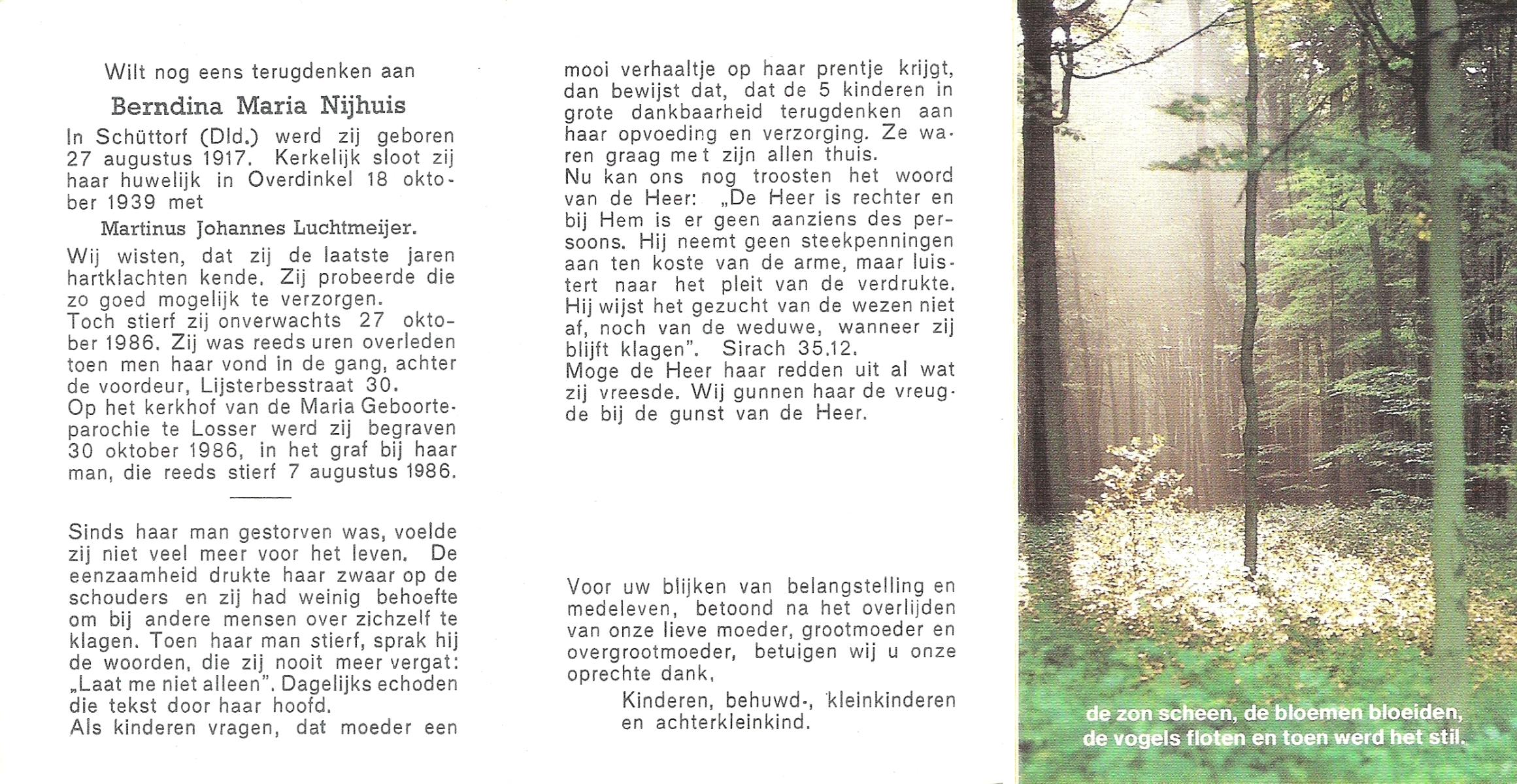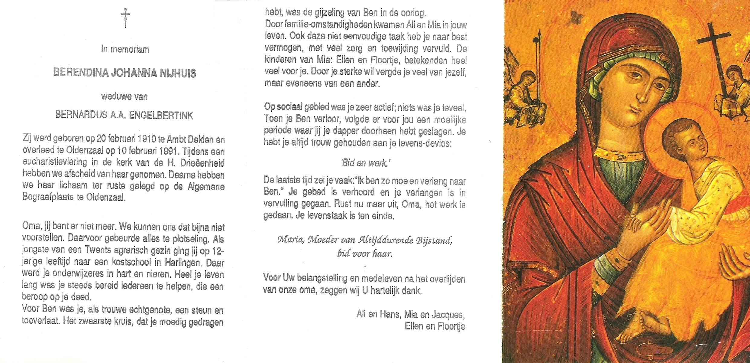 NIJHUIS, Johanna Bernardina, geboren op 22-2-1921 te Groenlo, overleden op 15-9-1996 te Enschede op 75-jarige leeftijd.