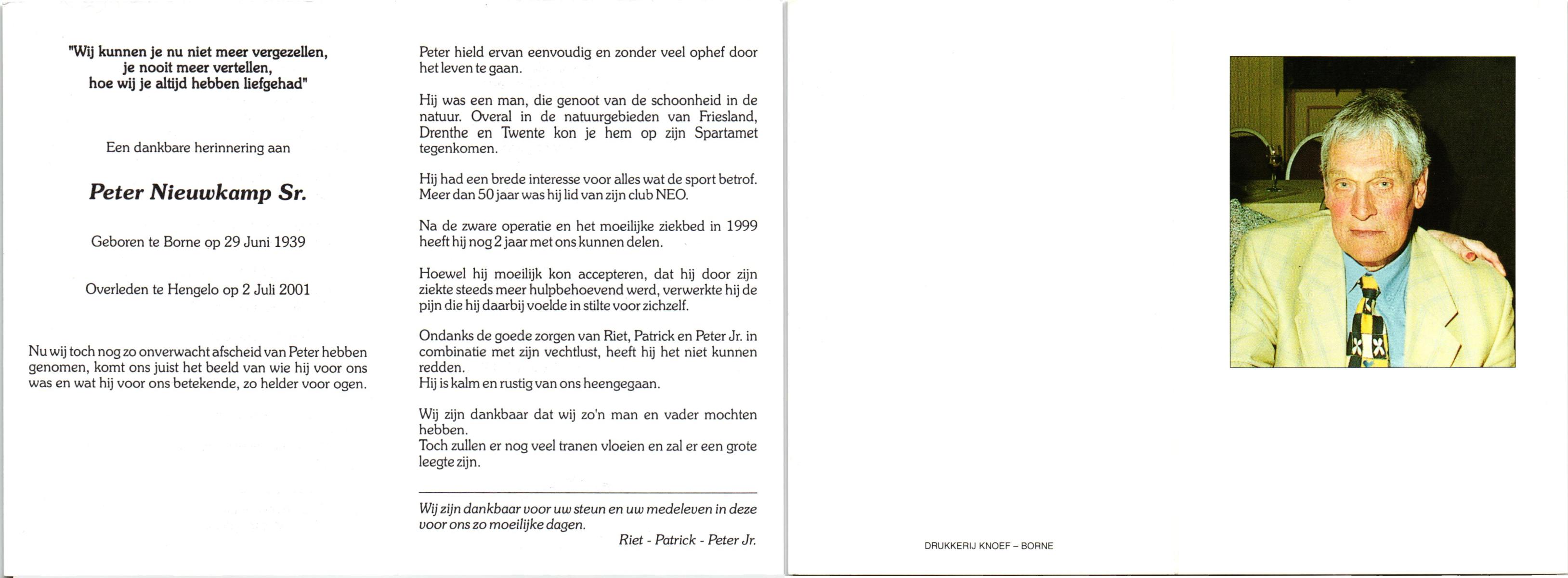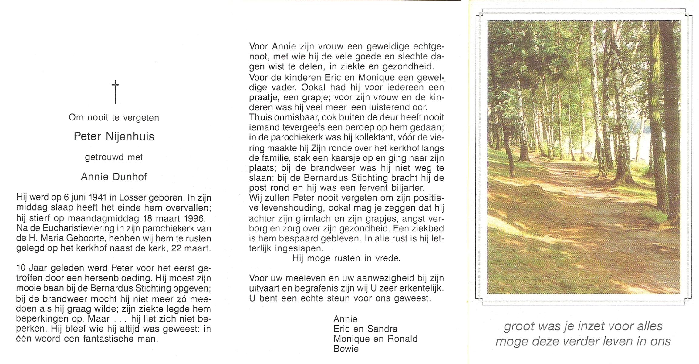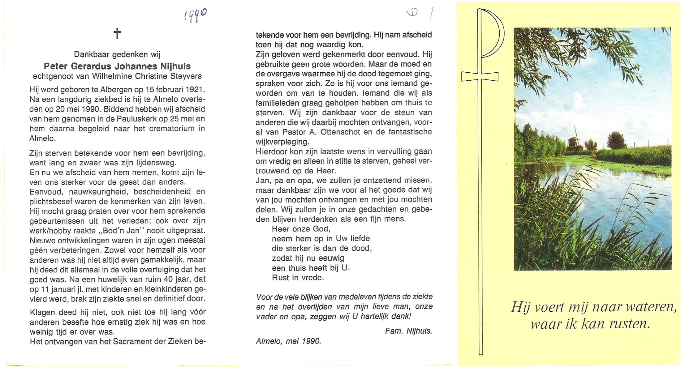 NIJHUIS, Peter Gerardus Johannes, geboren op 15-2-1921 te Albergen, overleden op 20-5-1990 te Almelo op 69-jarige leeftijd, gecremeerd op 25-5-1990 te Almelo.