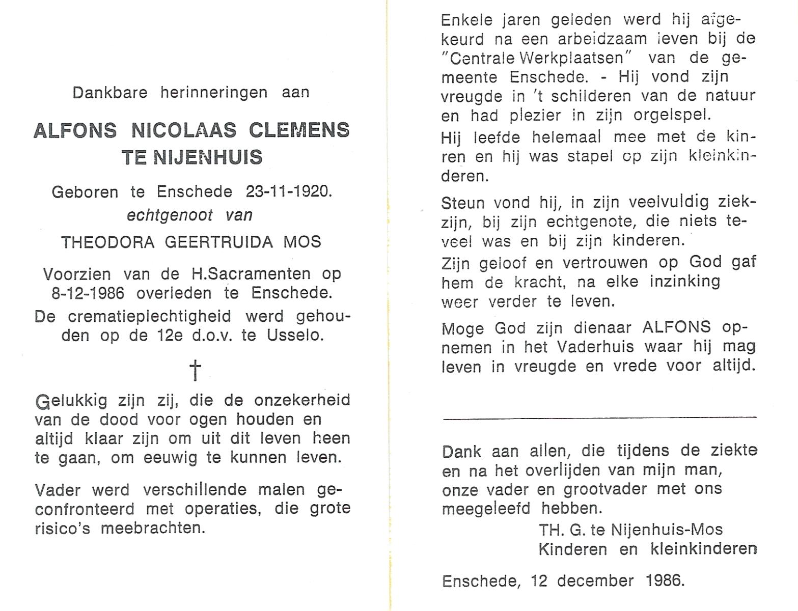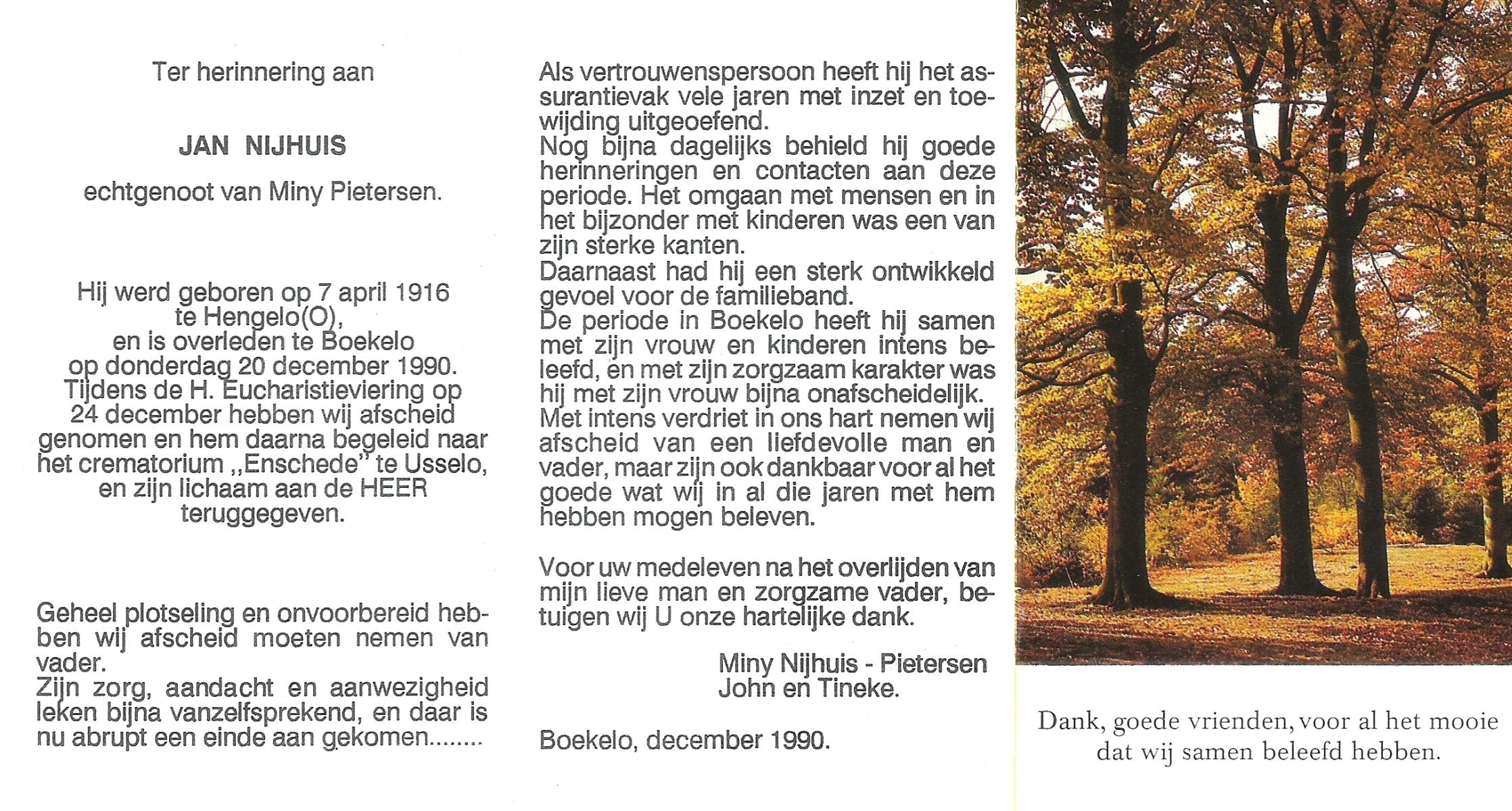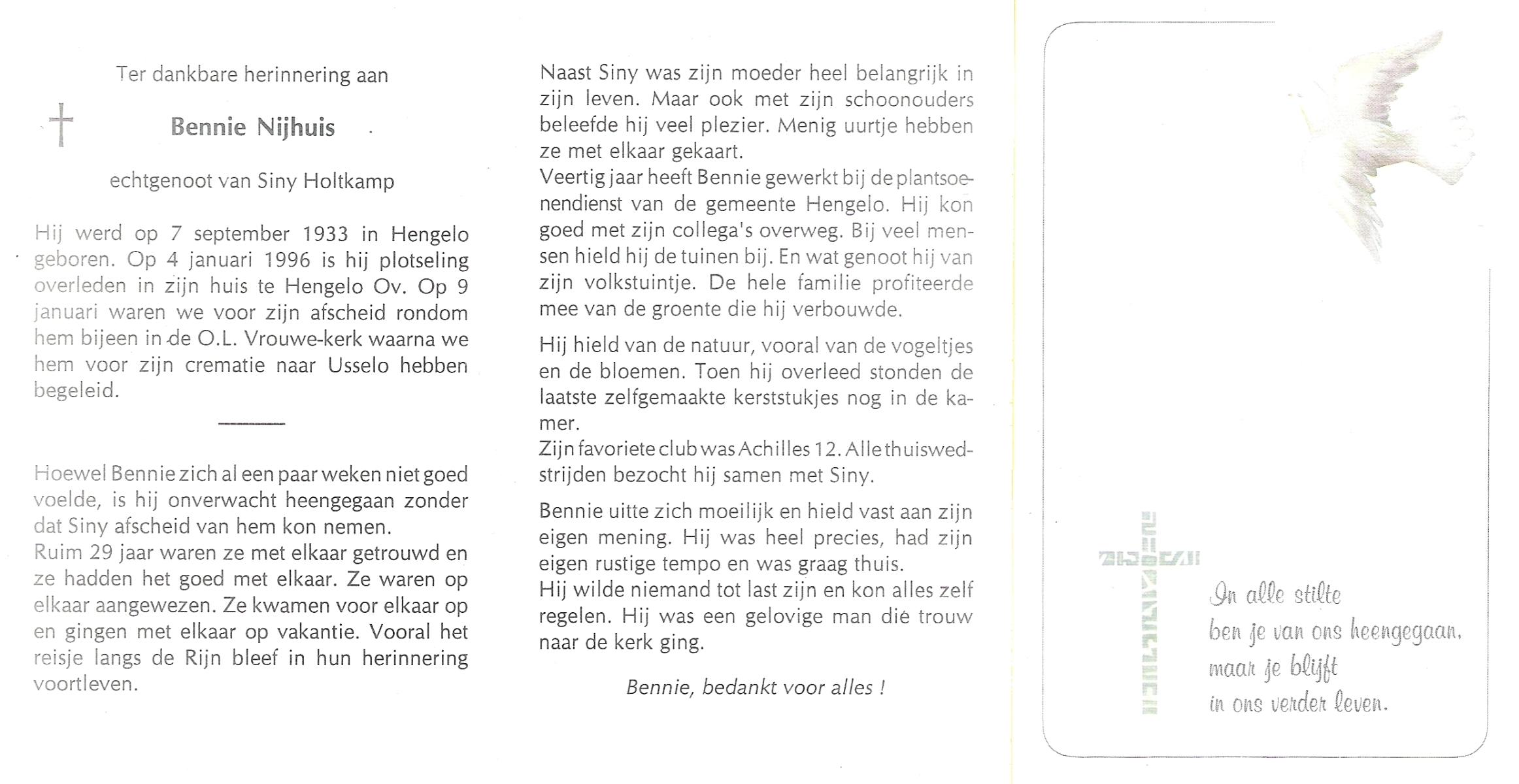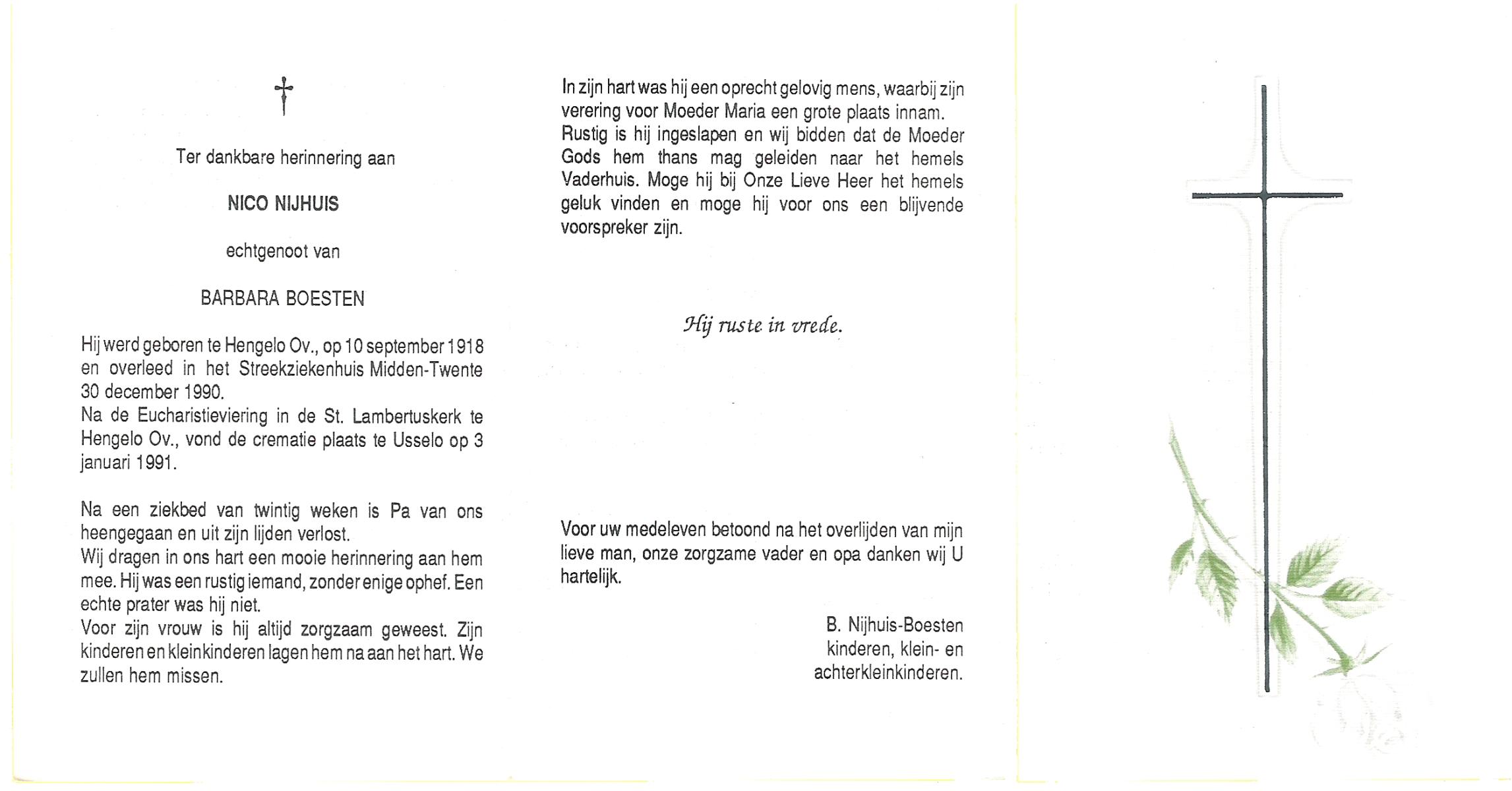 NIJHUIS, Nico, geboren op 10-9-1918 te Hengelo (O), overleden op 30-12-1990 te Hengelo (Ov.) op 72-jarige leeftijd, gecremeerd op 3-1-1991 te Usselo.
