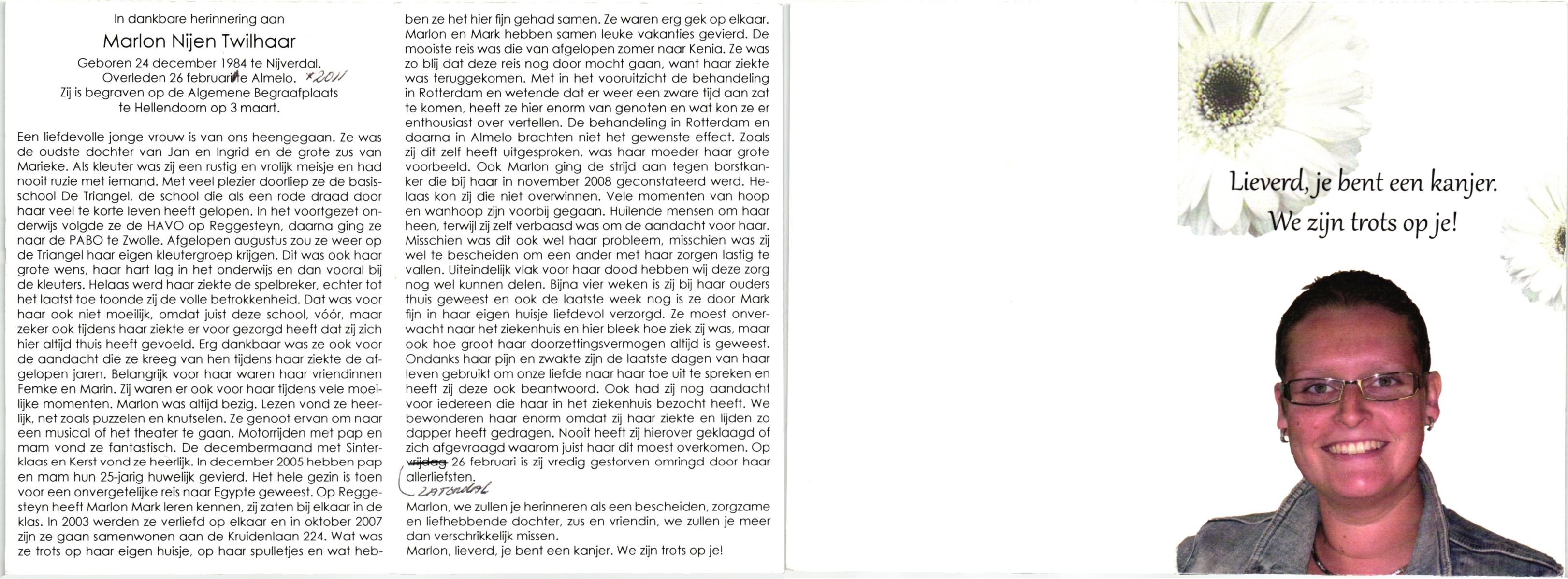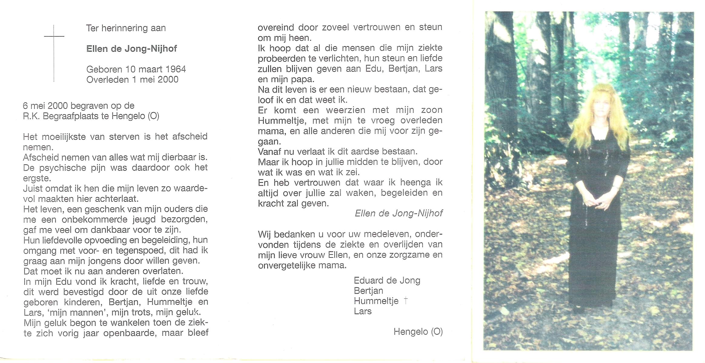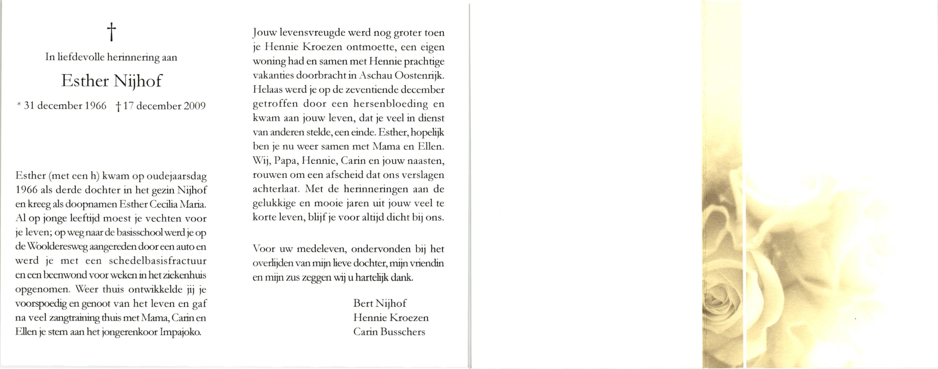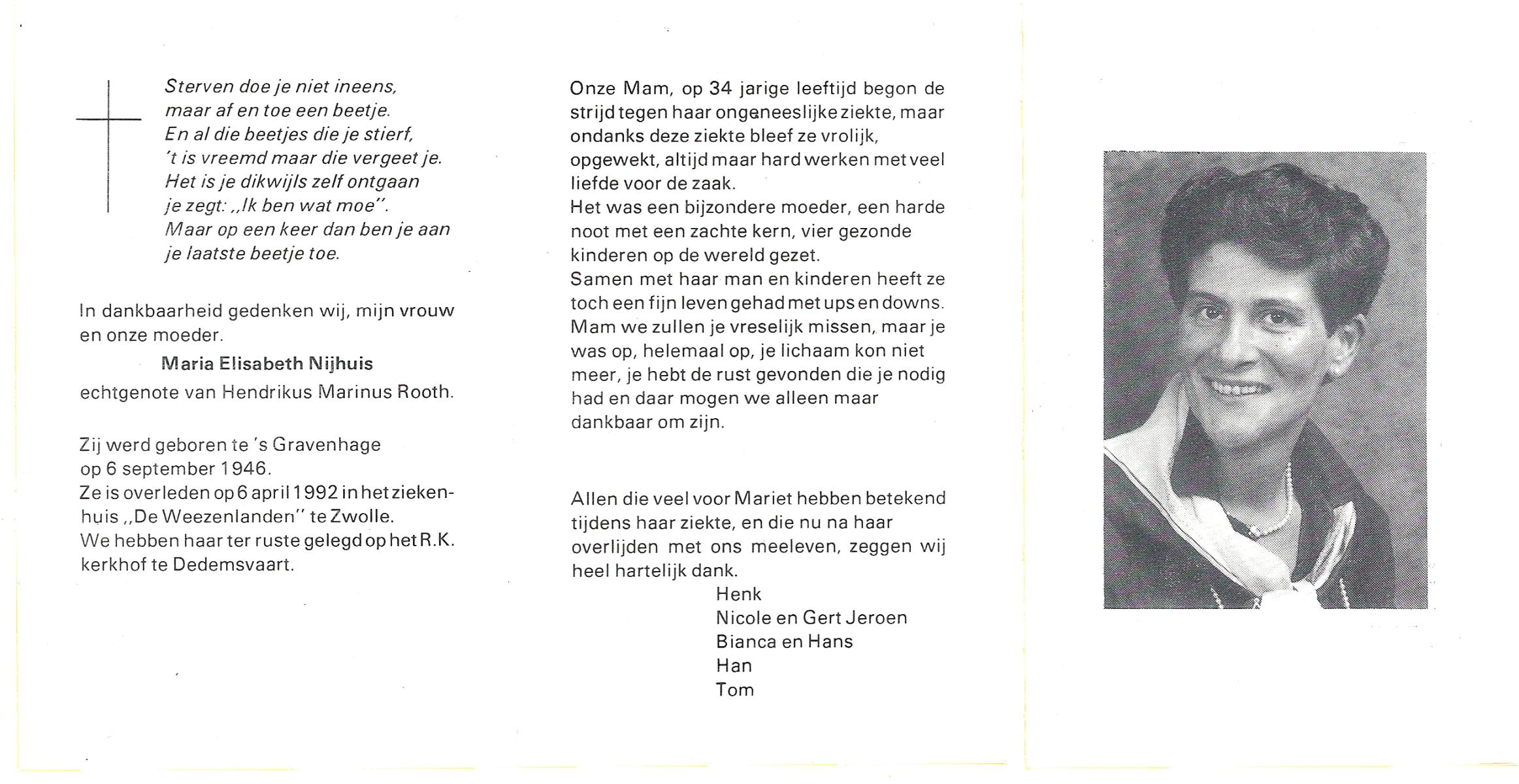 NIJHUIS, Maria Elisabeth, geboren op 6-9-1946 te 's Gravenhage, overleden op 6-4-1992 te Zwolle op 45-jarige leeftijd, begraven te Dedemsvaart.