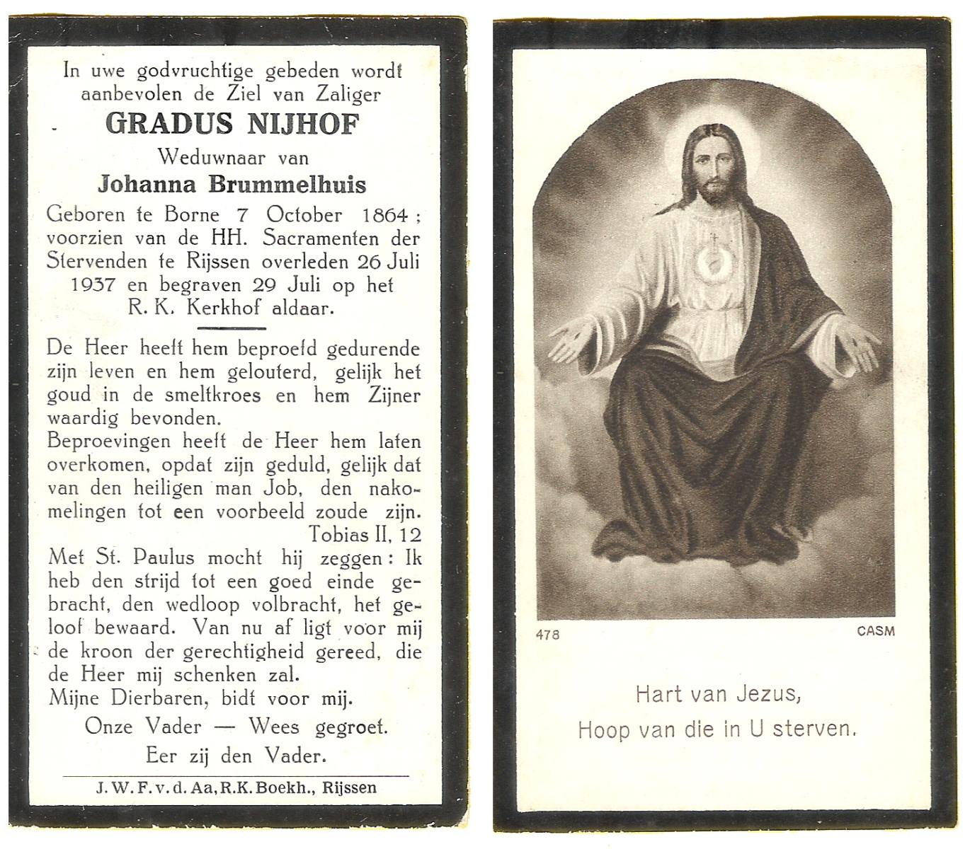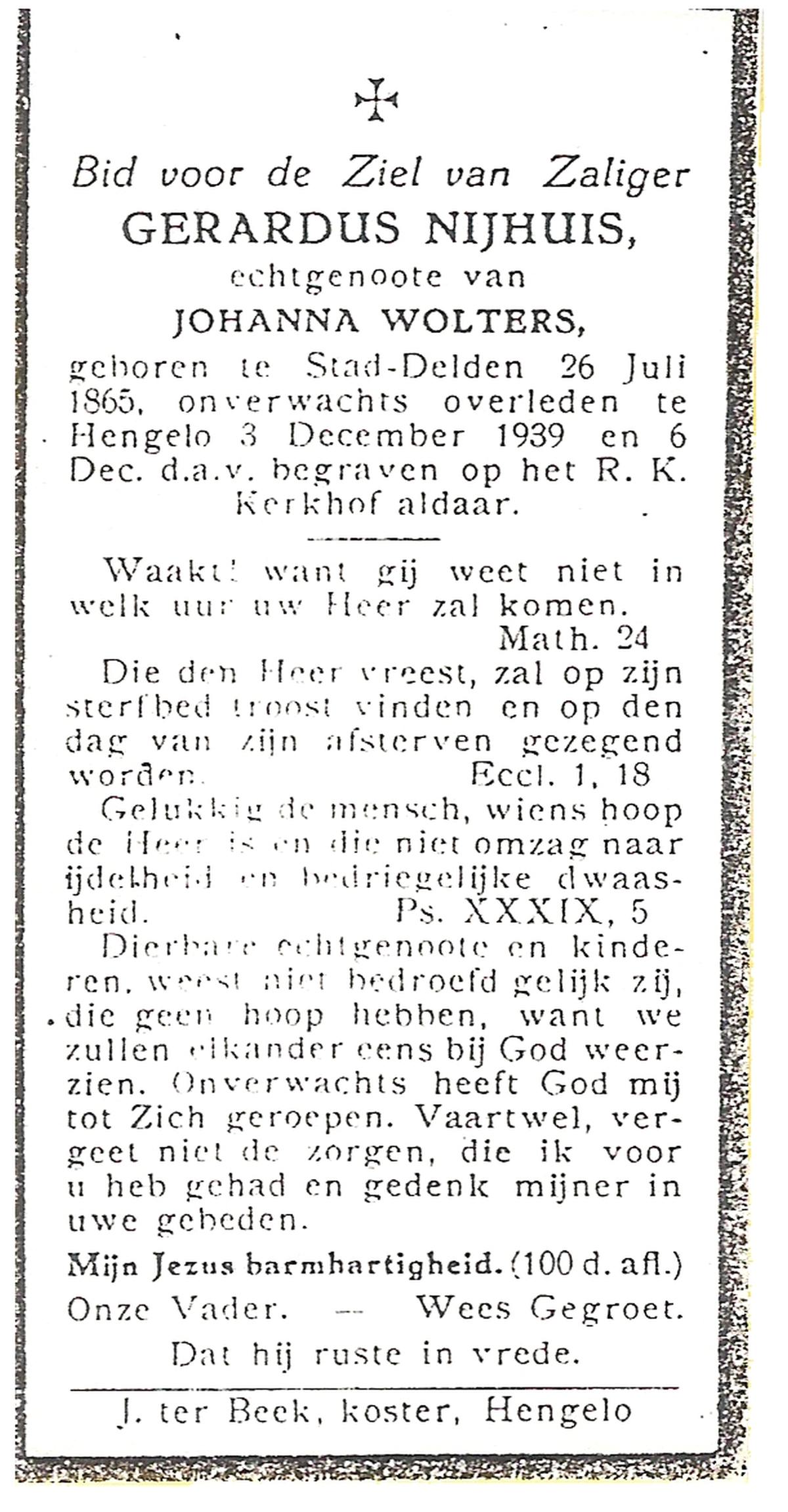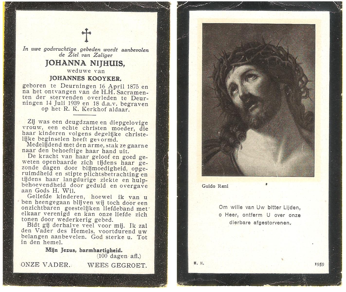 NIJHUIS, Johanna, geboren op 16-04-1875 te Deurningen, overleden op 14-7-1939 te Deurningen op 64-jarige leeftijd, begraven op 18-7-1939 te Deurningen.