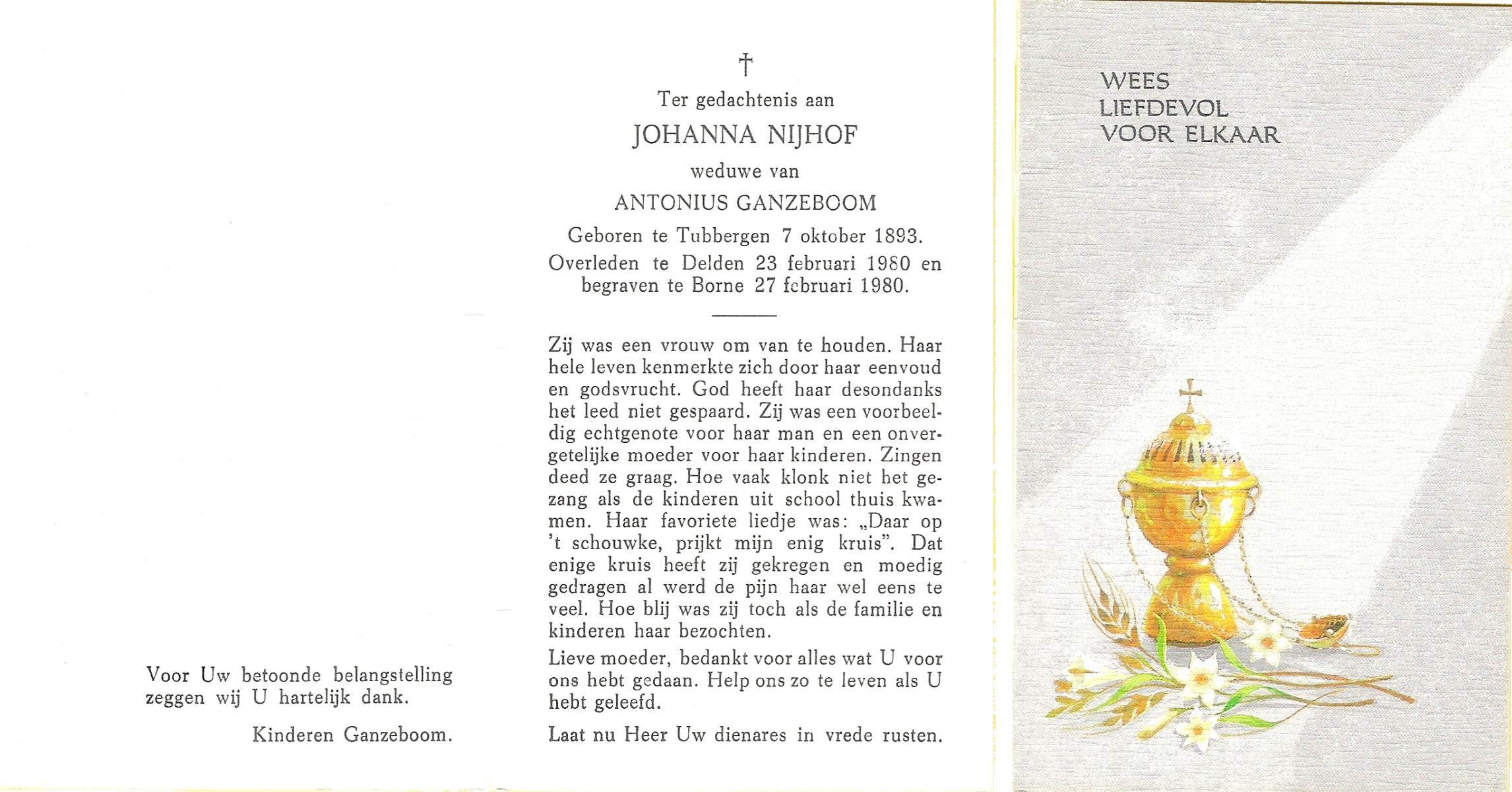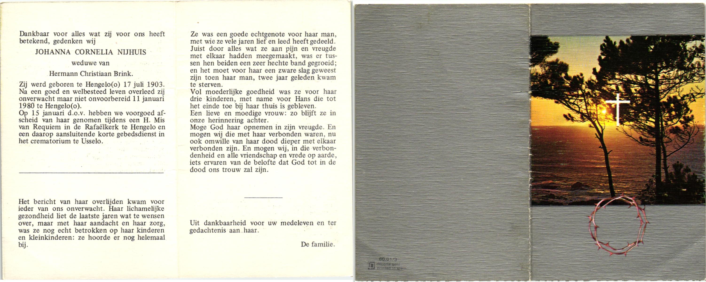 NIJHUIS, , Johanna Cornelia, geboren op 17-7-1903 te Hengelo (O), overleden op 11-1-1980 te Hengelo (O) op 76-jarige leeftijd, gecremeerd op 15-1-1980 te Usselo.