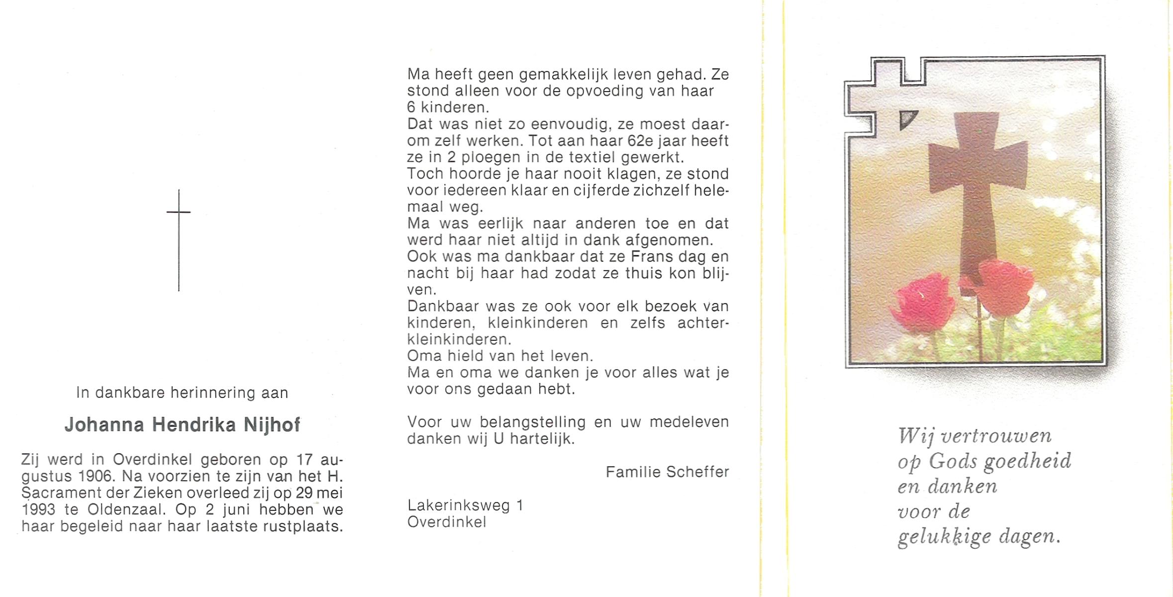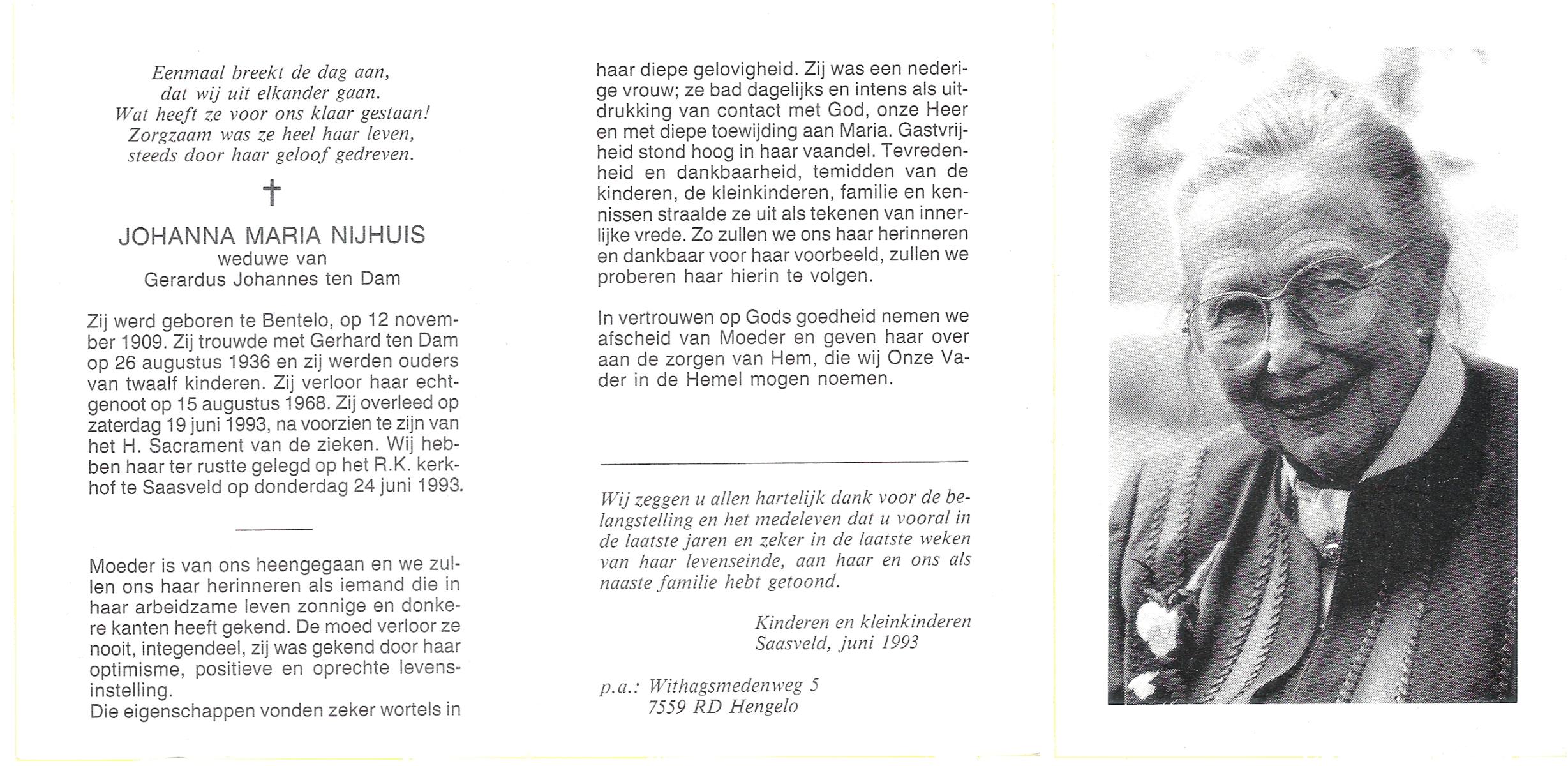 NIJHUIS, Johanna Maria, geboren op 12-11-1909 te Bentelo, overleden op 19-6-1993 op 83-jarige leeftijd, begraven op 24-6-1993 te Saasveld.