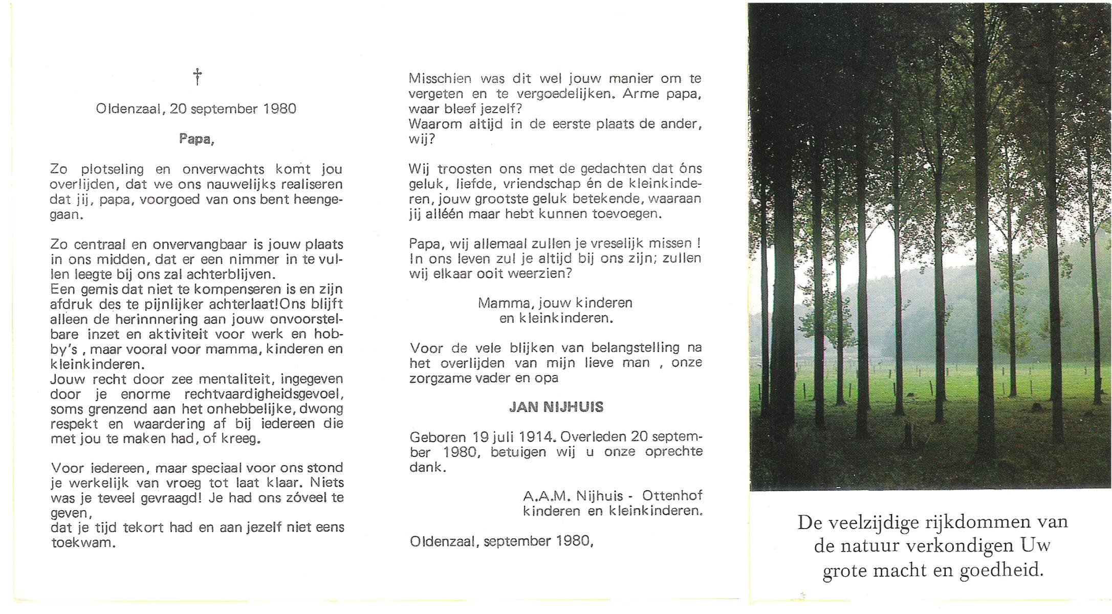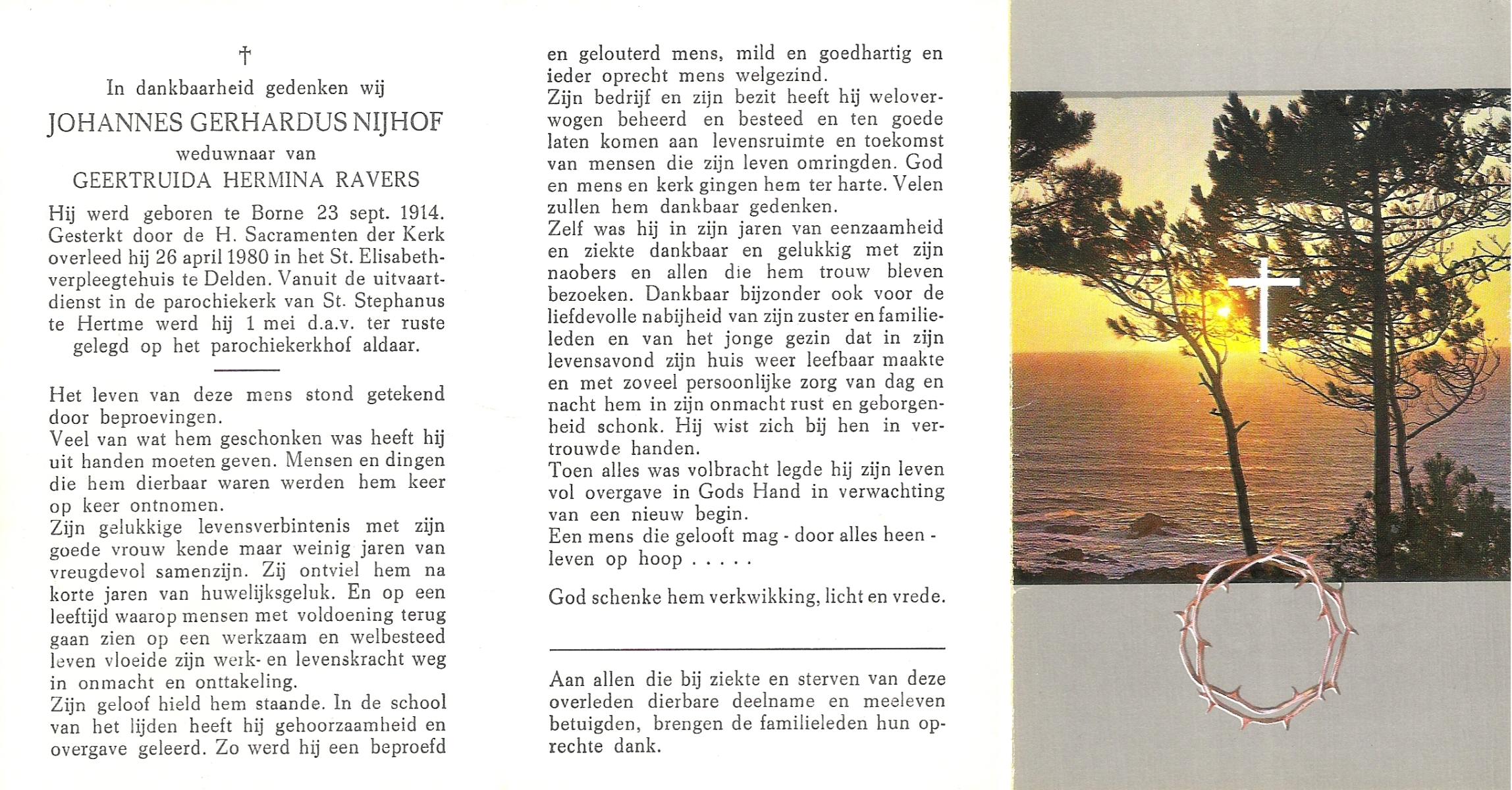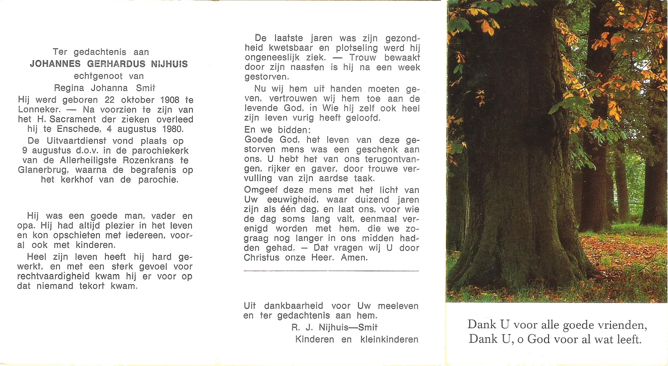 NIJHUIS, Johannes Gerhardus, geboren op 22-10-1908 te Lonneker, overleden op 4-8-1980 te Enschede op 71-jarige leeftijd, begraven op 9-8-1980 te Glanerbrug.