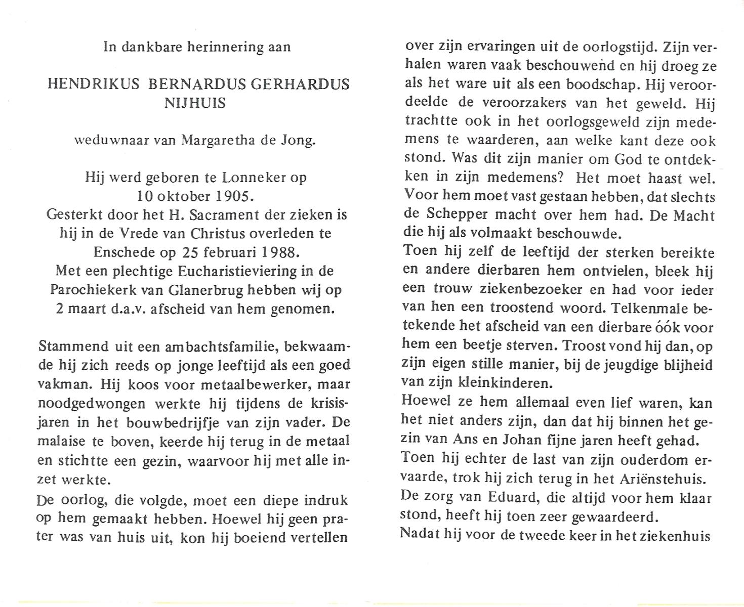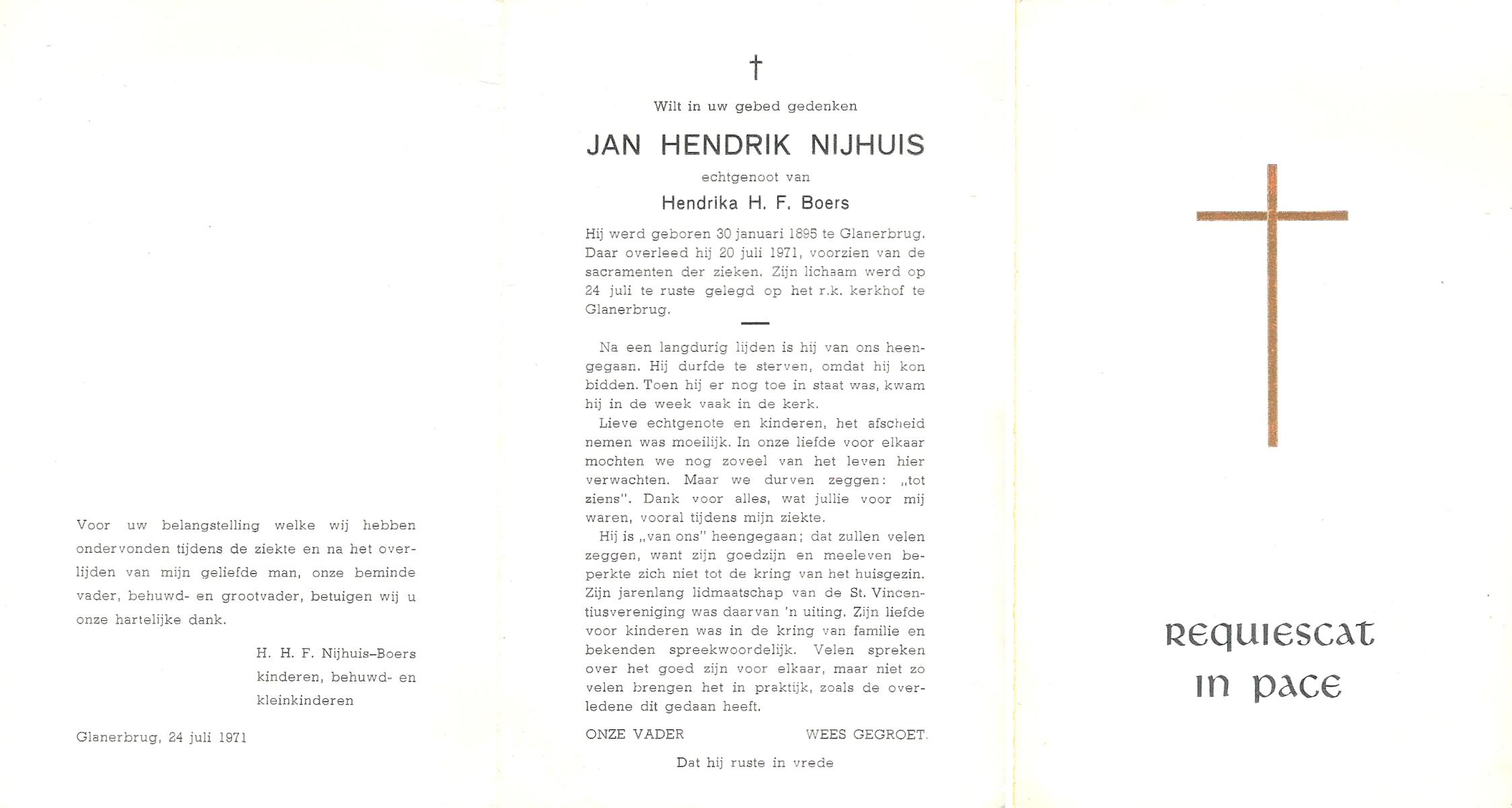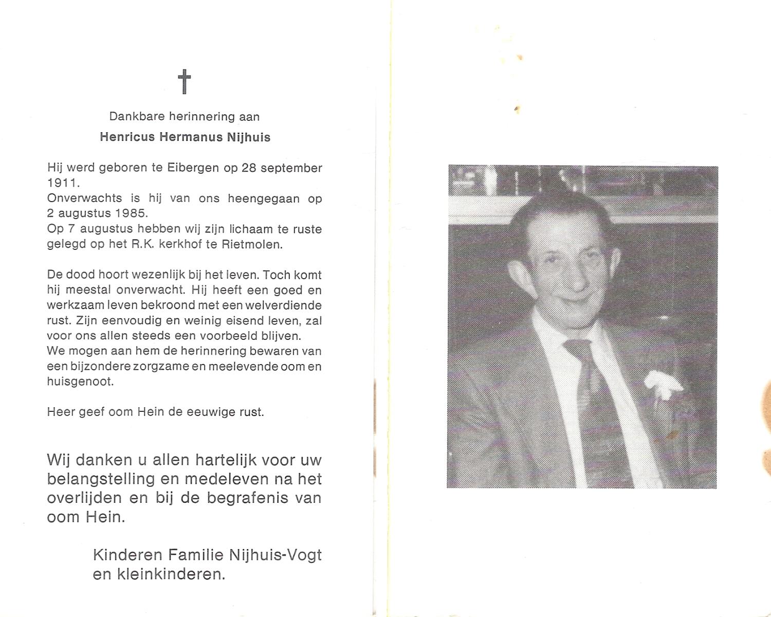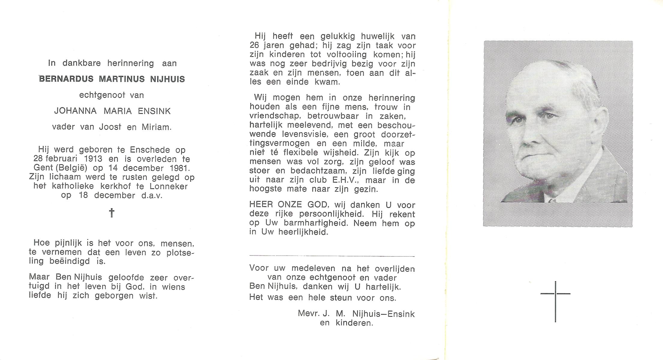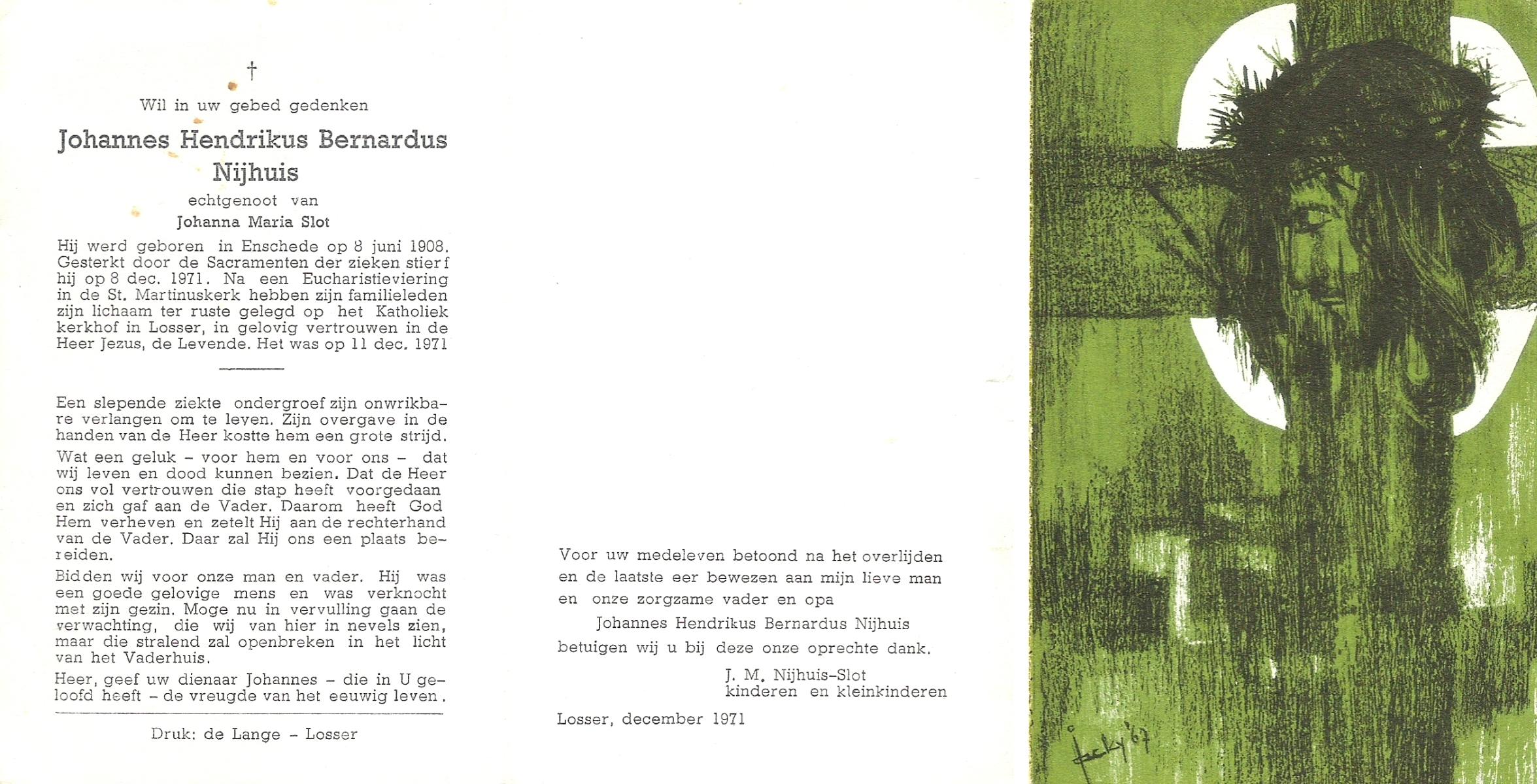NIJHUIS, Johannes Hendrikus Bernardus, geboren op 8-6-1908 te Enschede, overleden op 8-12-1971 op 63-jarige leeftijd, begraven op 11-12-1971 te Losser.