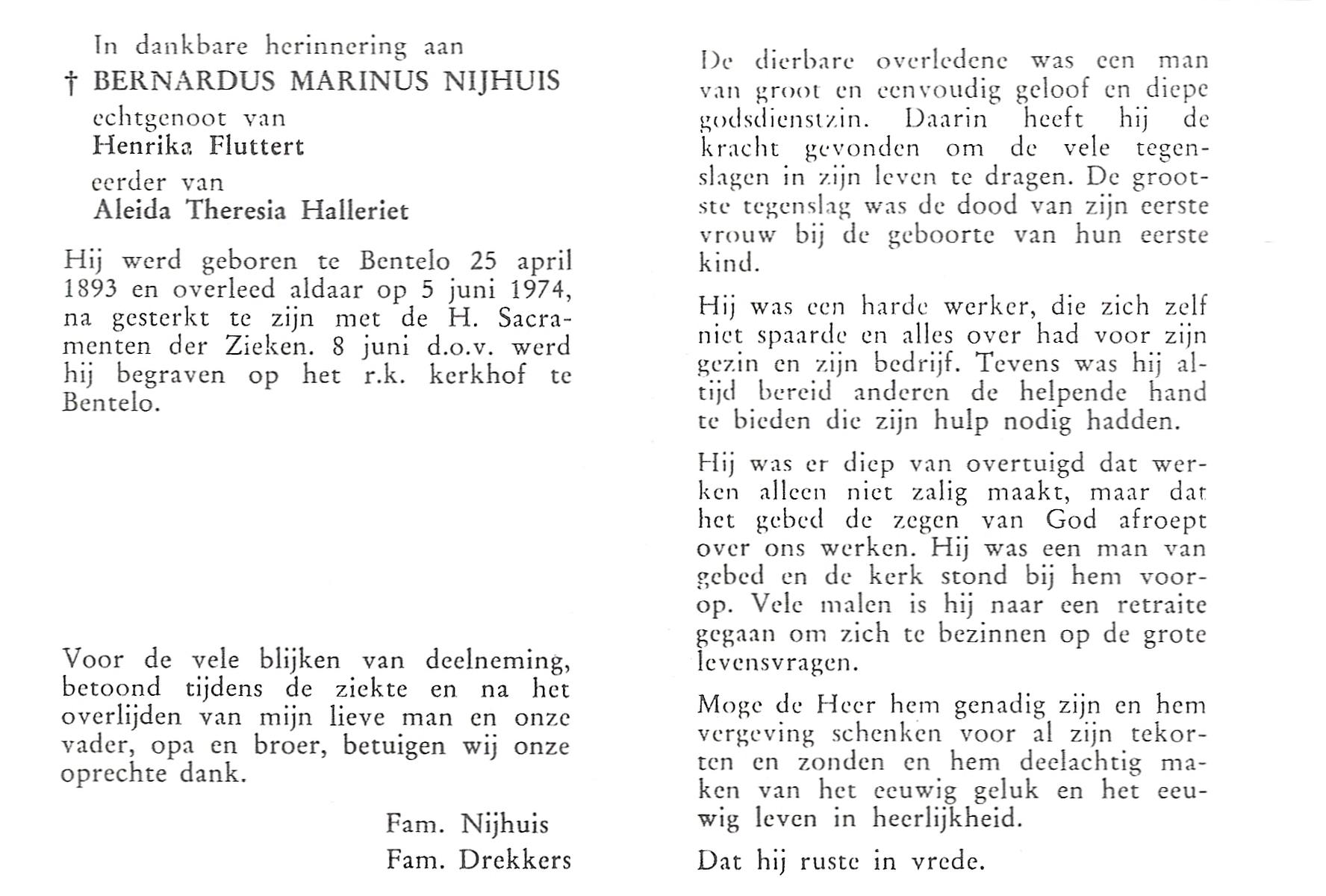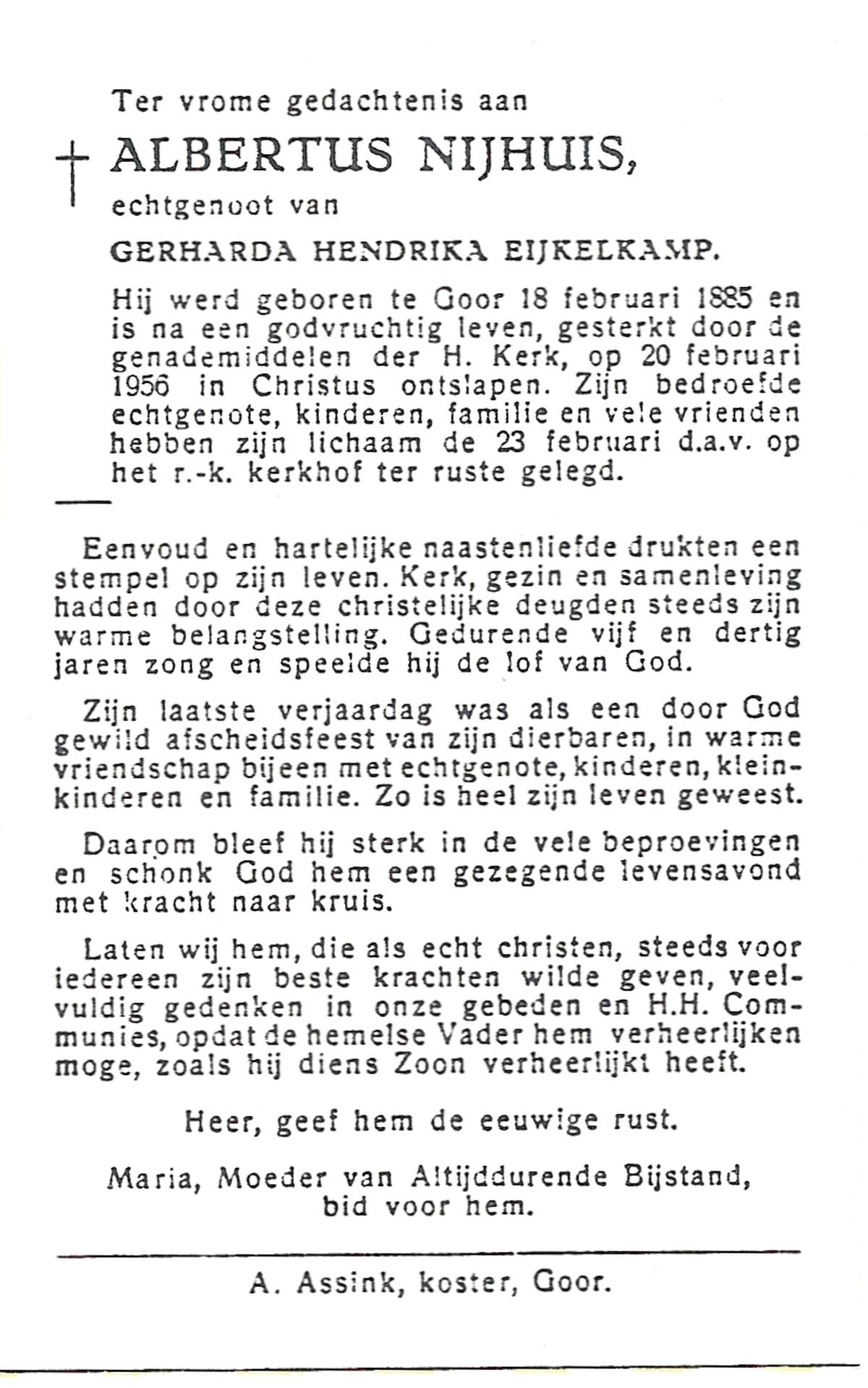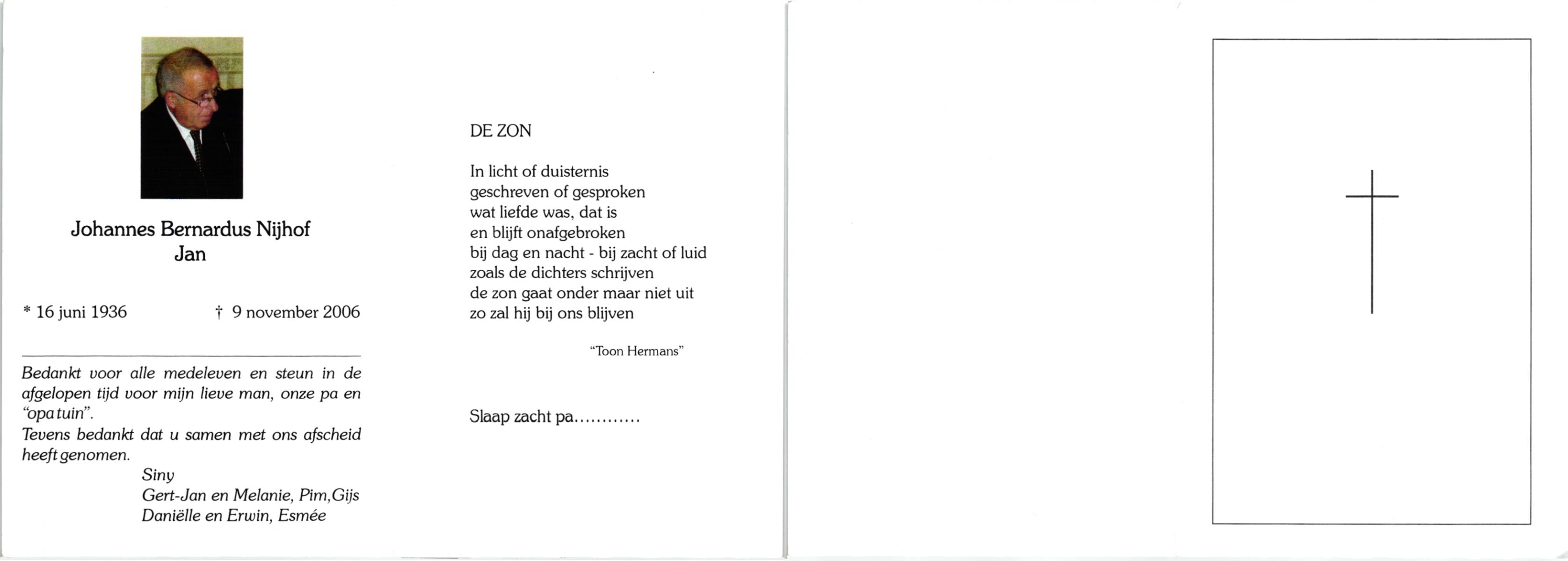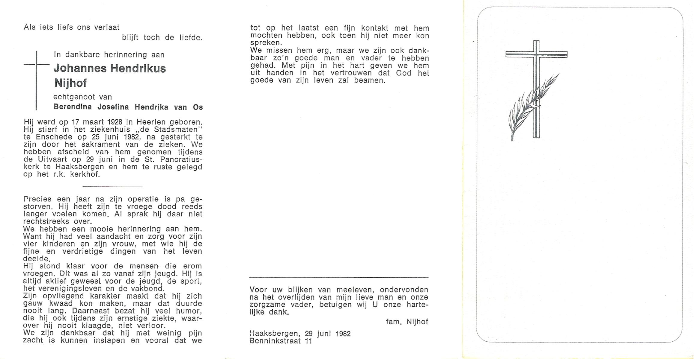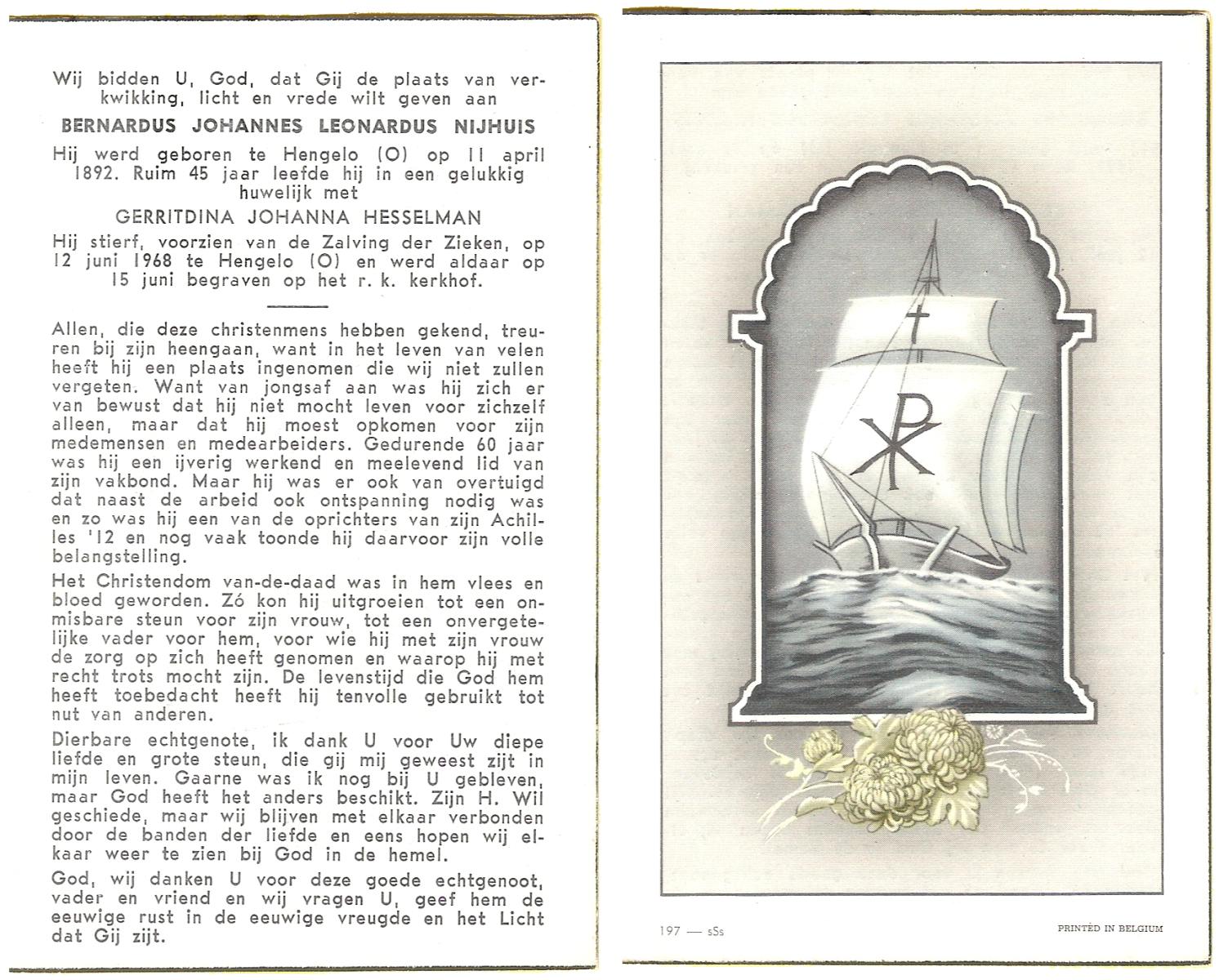 NIJHUIS, Johannes Hendrikus Bernardus, geboren op 8-6-1908 te Enschede, overleden op 8-12-1971 op 63-jarige leeftijd, begraven op 11-12-1971 te Losser.