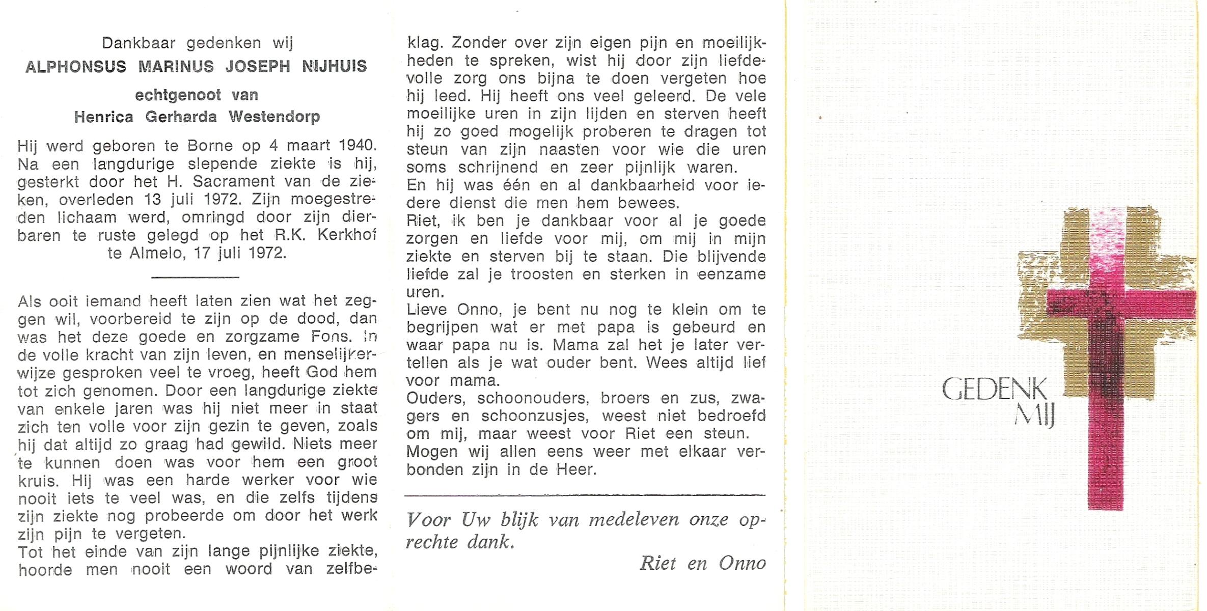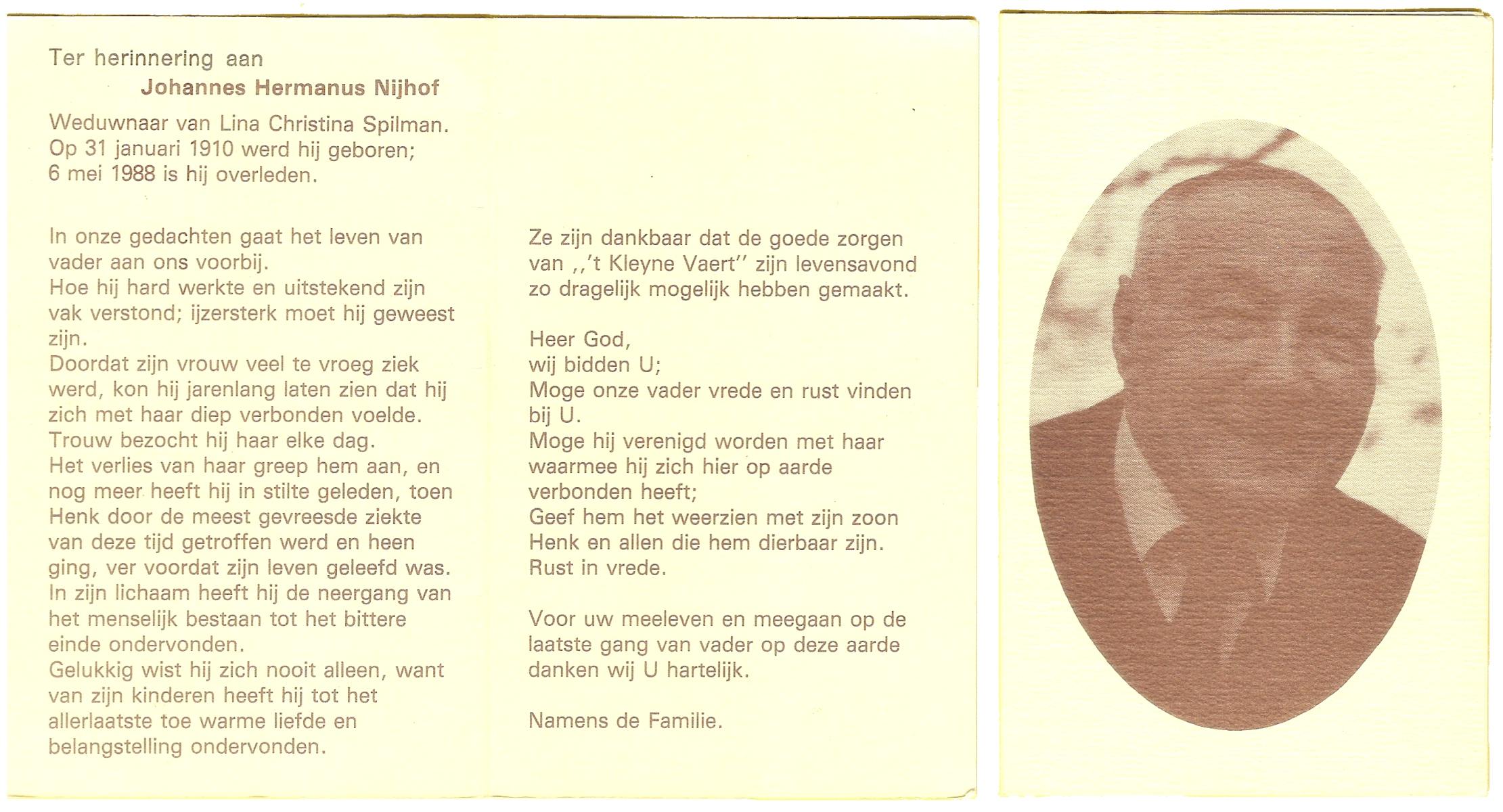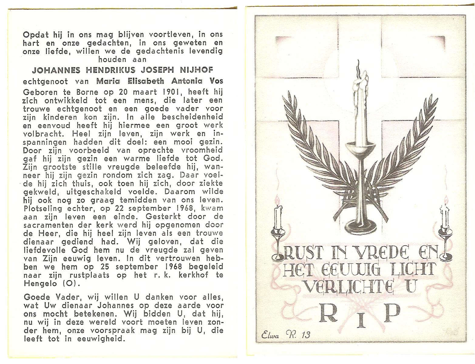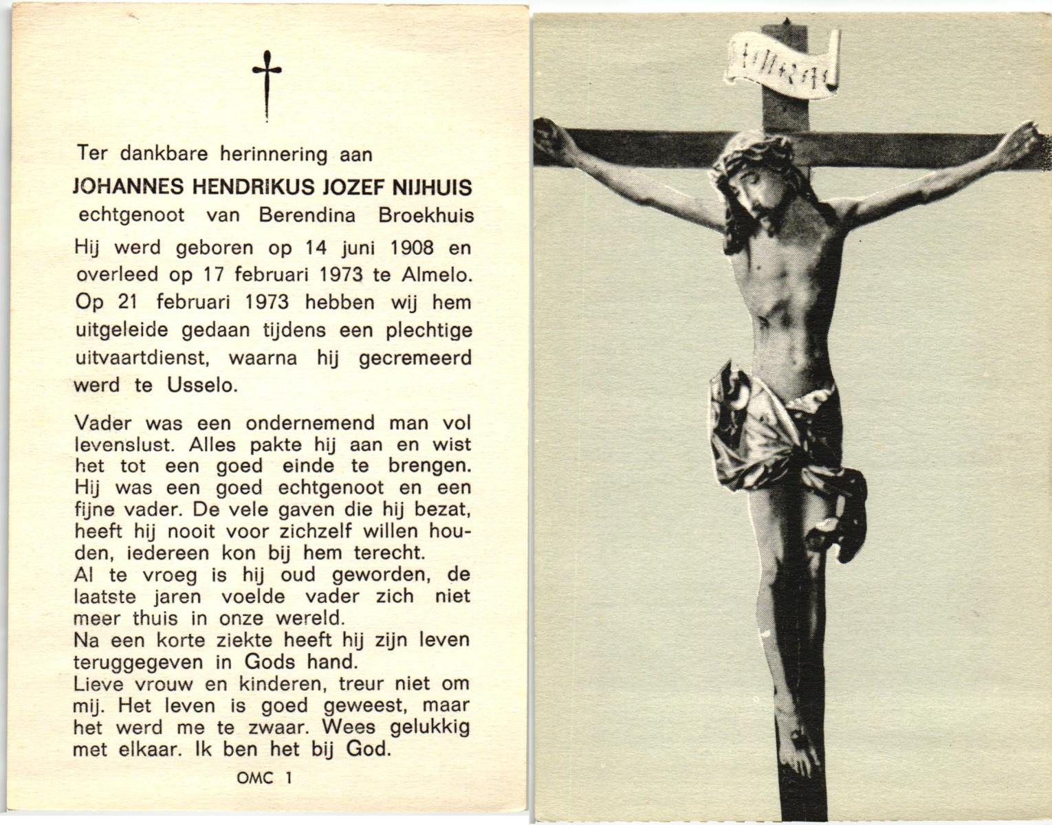 NIJHUIS, Johannes Hendrikus Jozef, geboren op 14-6-1908 te Almelo, overleden op 17-2-1973 te Almelo op 64-jarige leeftijd, gecremeerd op 21-2-1973 te Usselo.