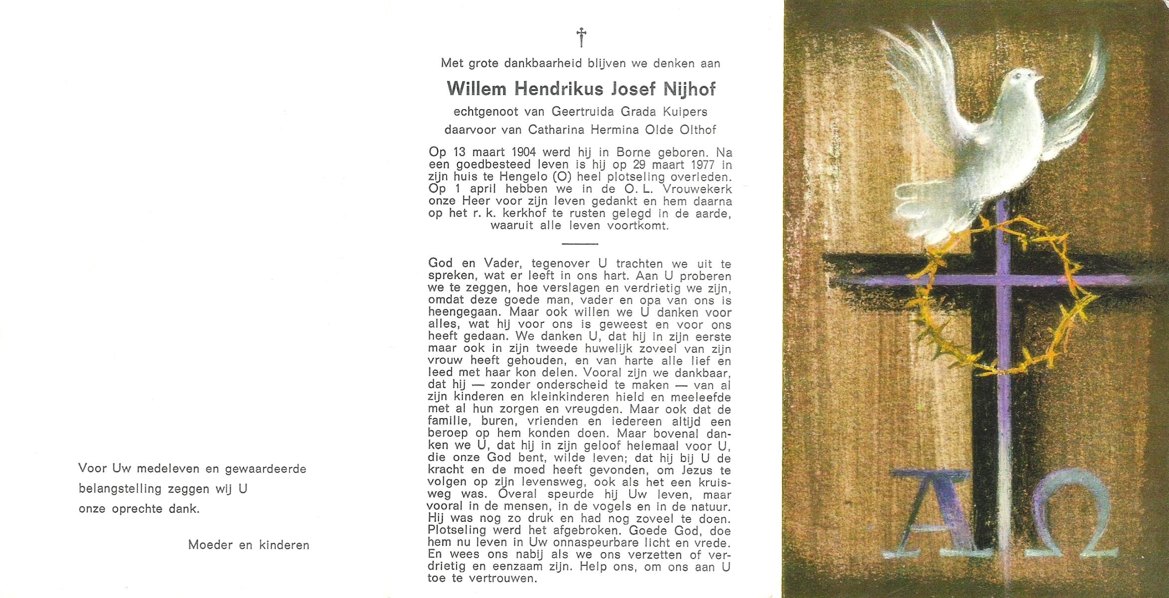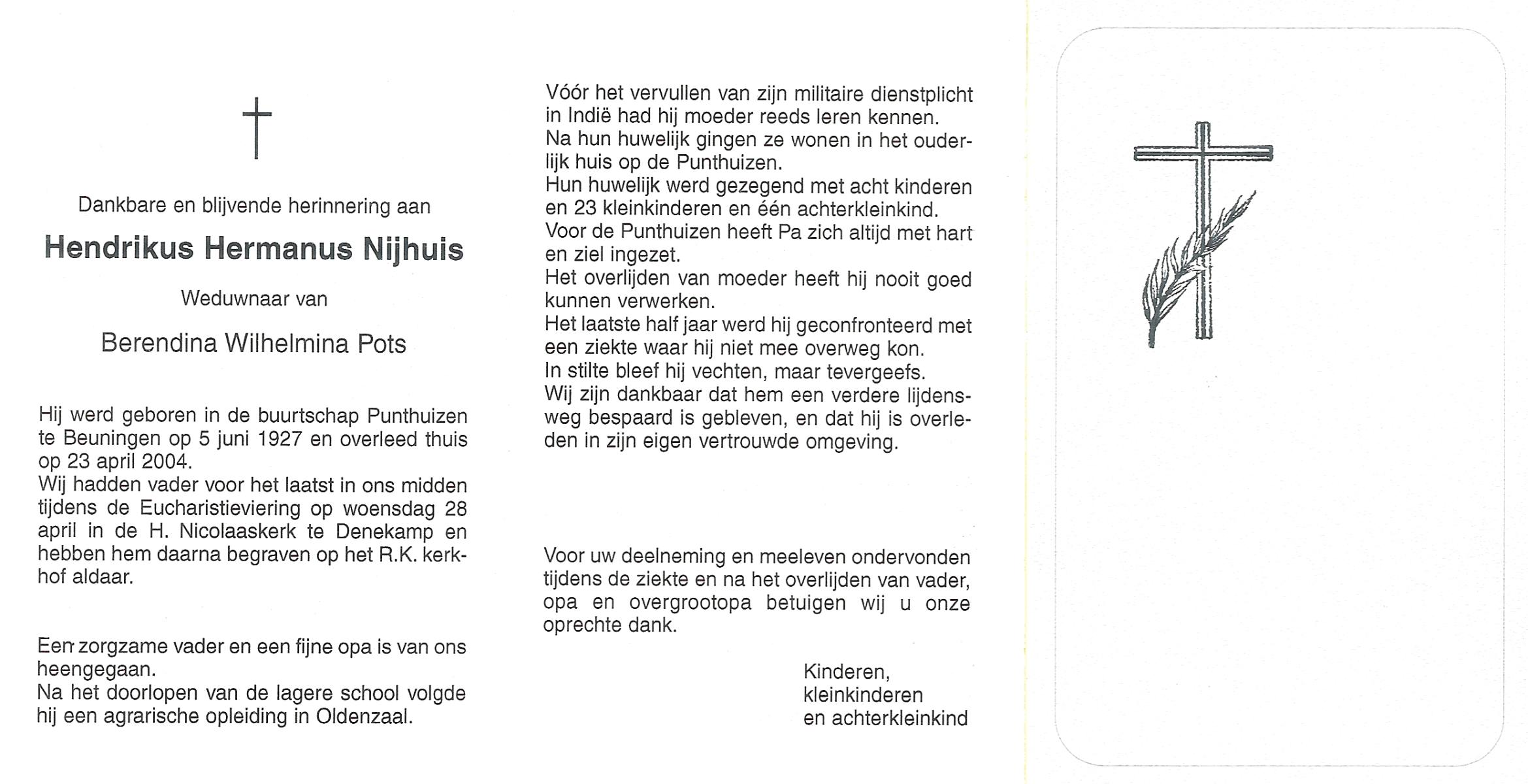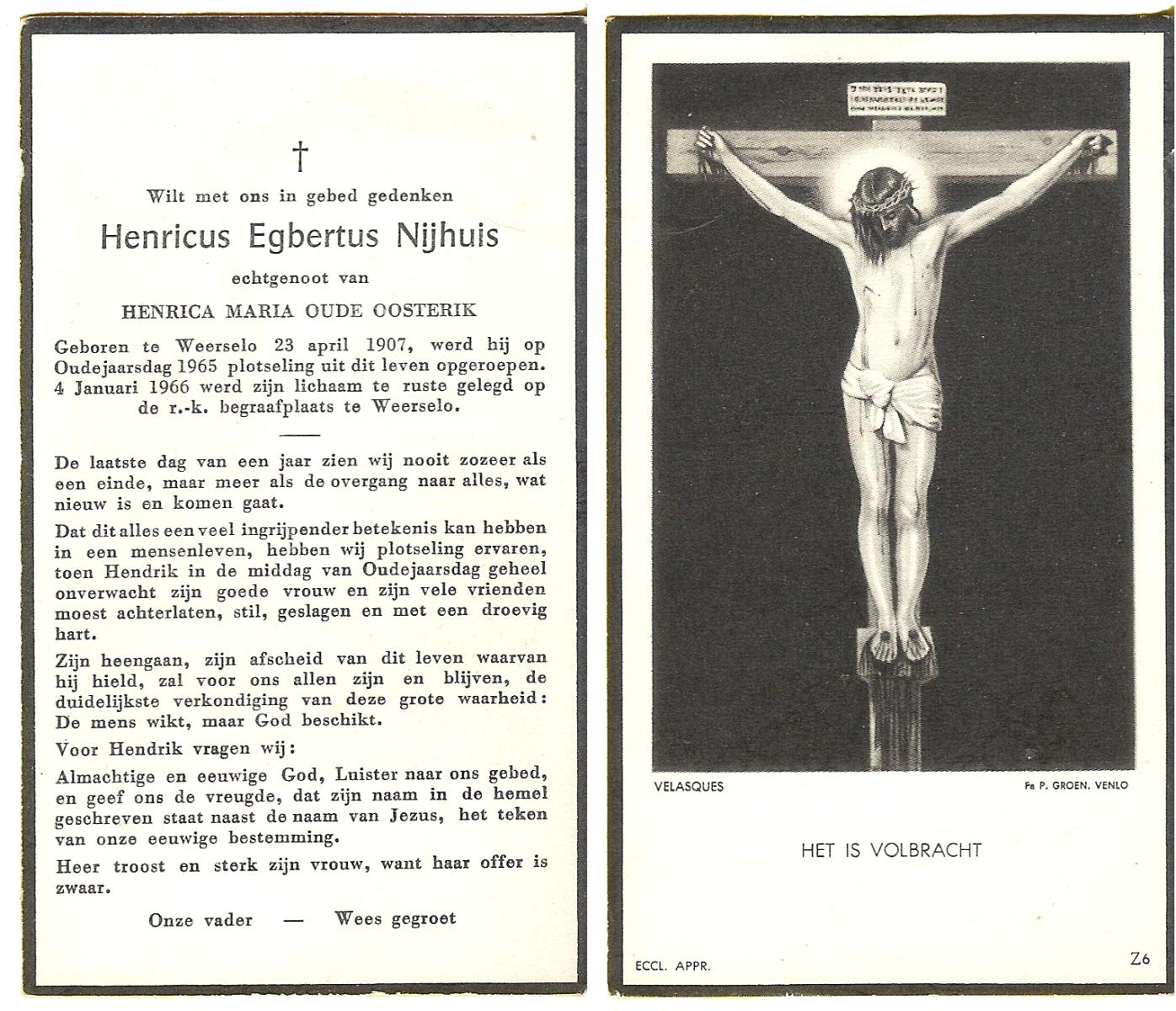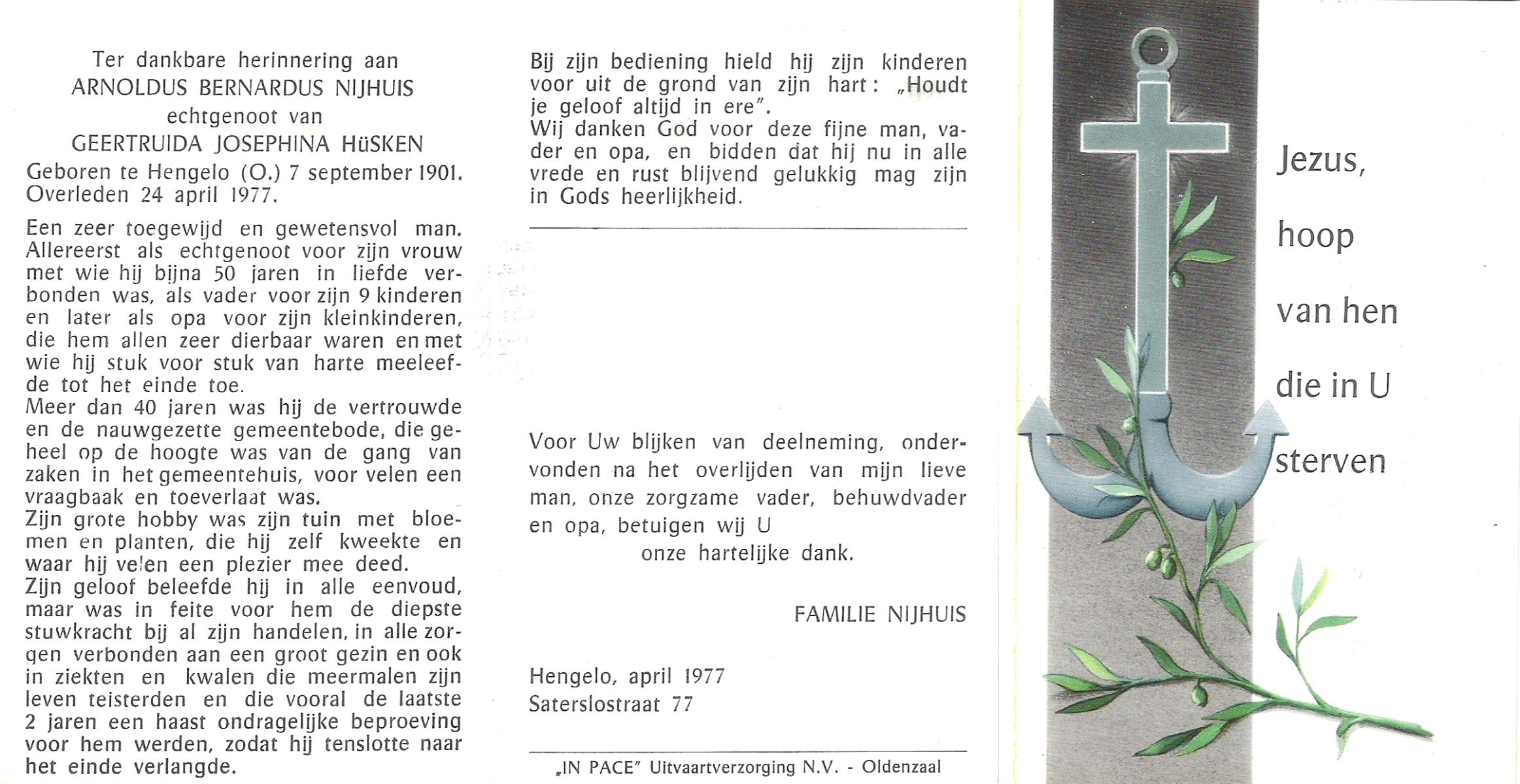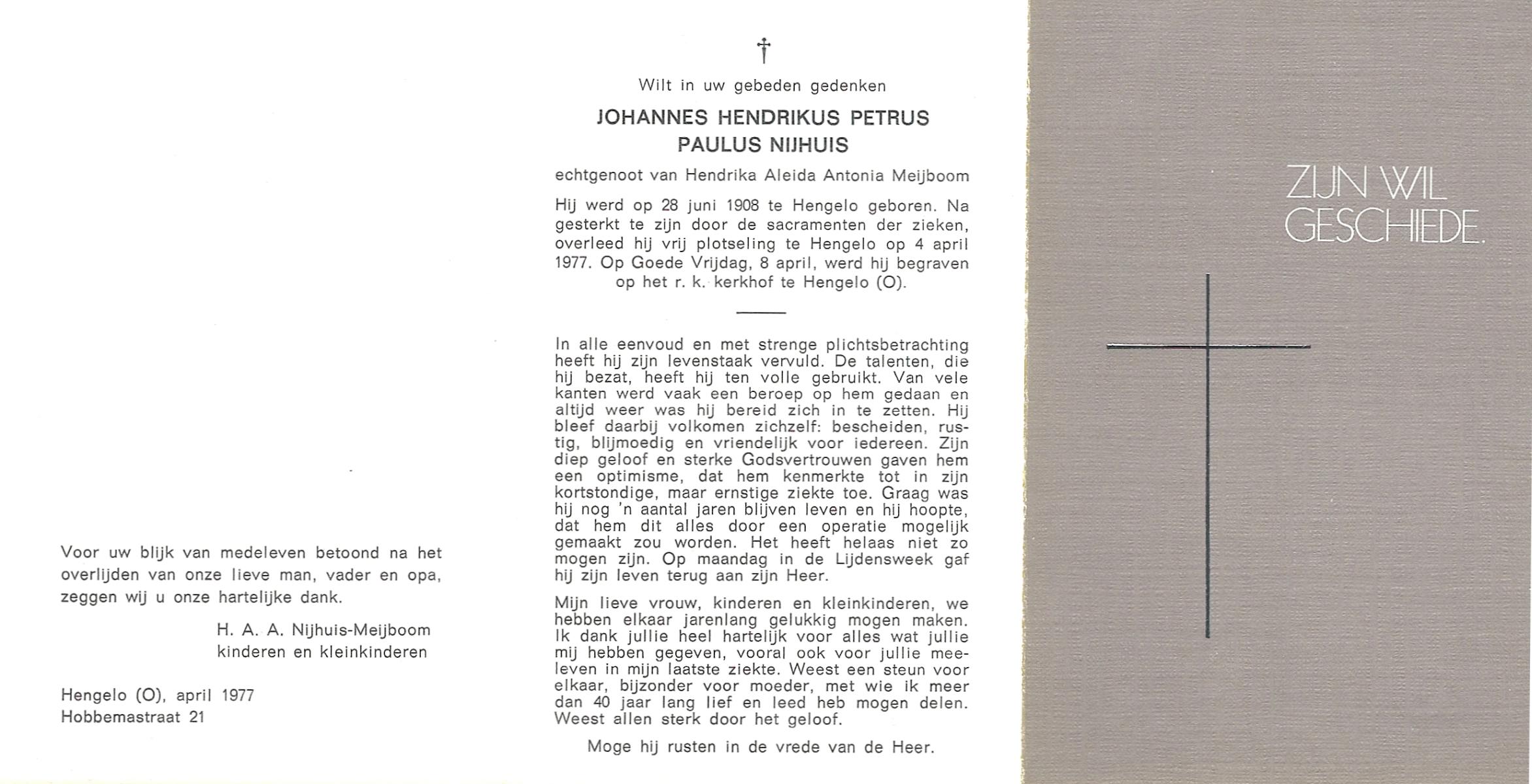 NIJHUIS, Johannes Hendrikus Petrus Paulus, geboren op 28-6-1908 te Hengelo (O), overleden op 4-4-1977 te Hengelo (Ov.) op 68-jarige leeftijd, begraven op 8-4-1977 te Hengelo (Ov.).