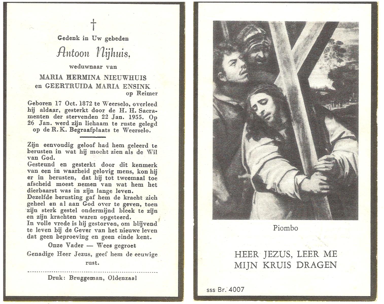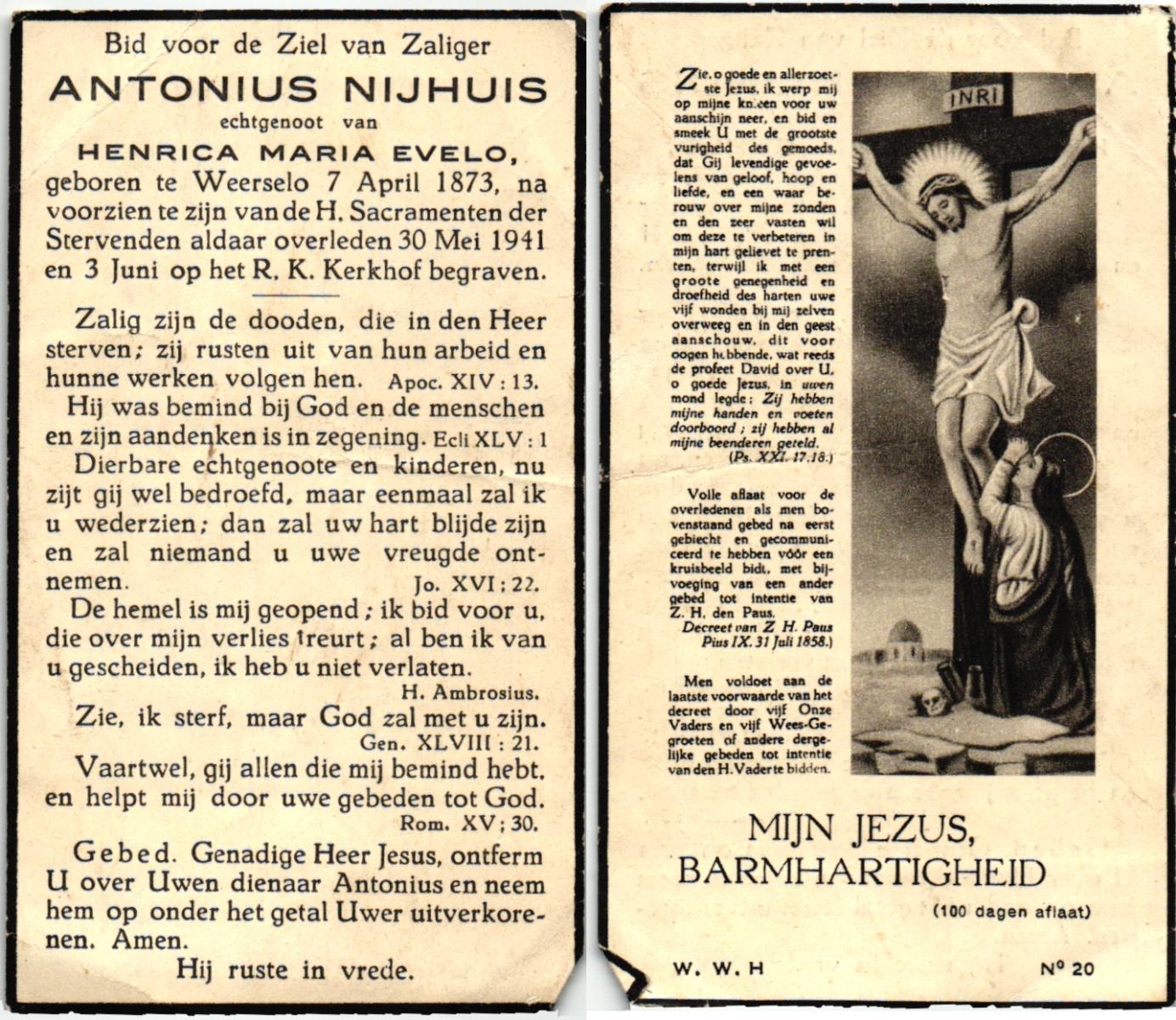 NIJHUIS, , Antonius, geboren op 07-04-1873 te Weerselo, overleden op 30-5-1941 te Weerselo op 68-jarige leeftijd, begraven op 3-6-1941 te Weerselo.