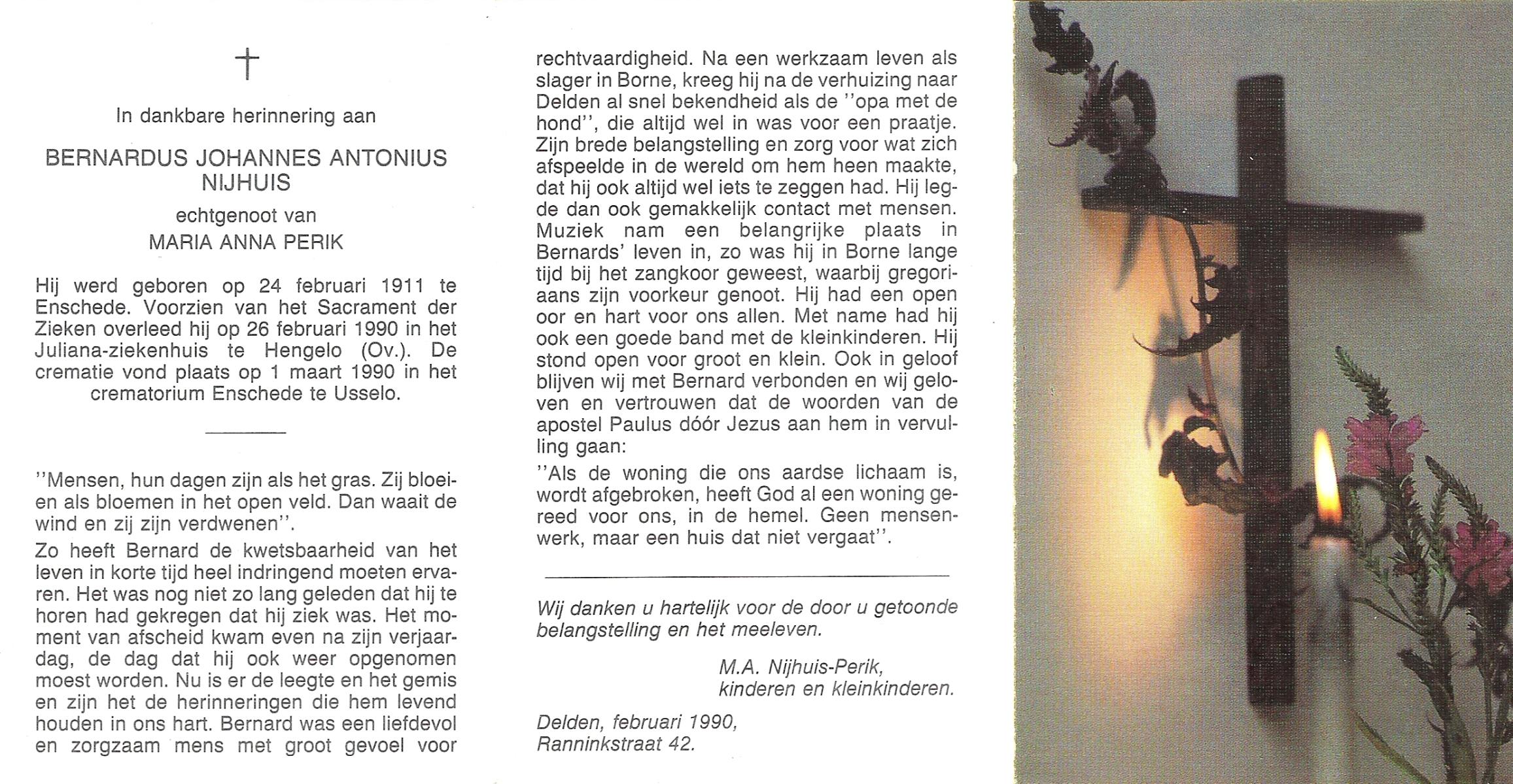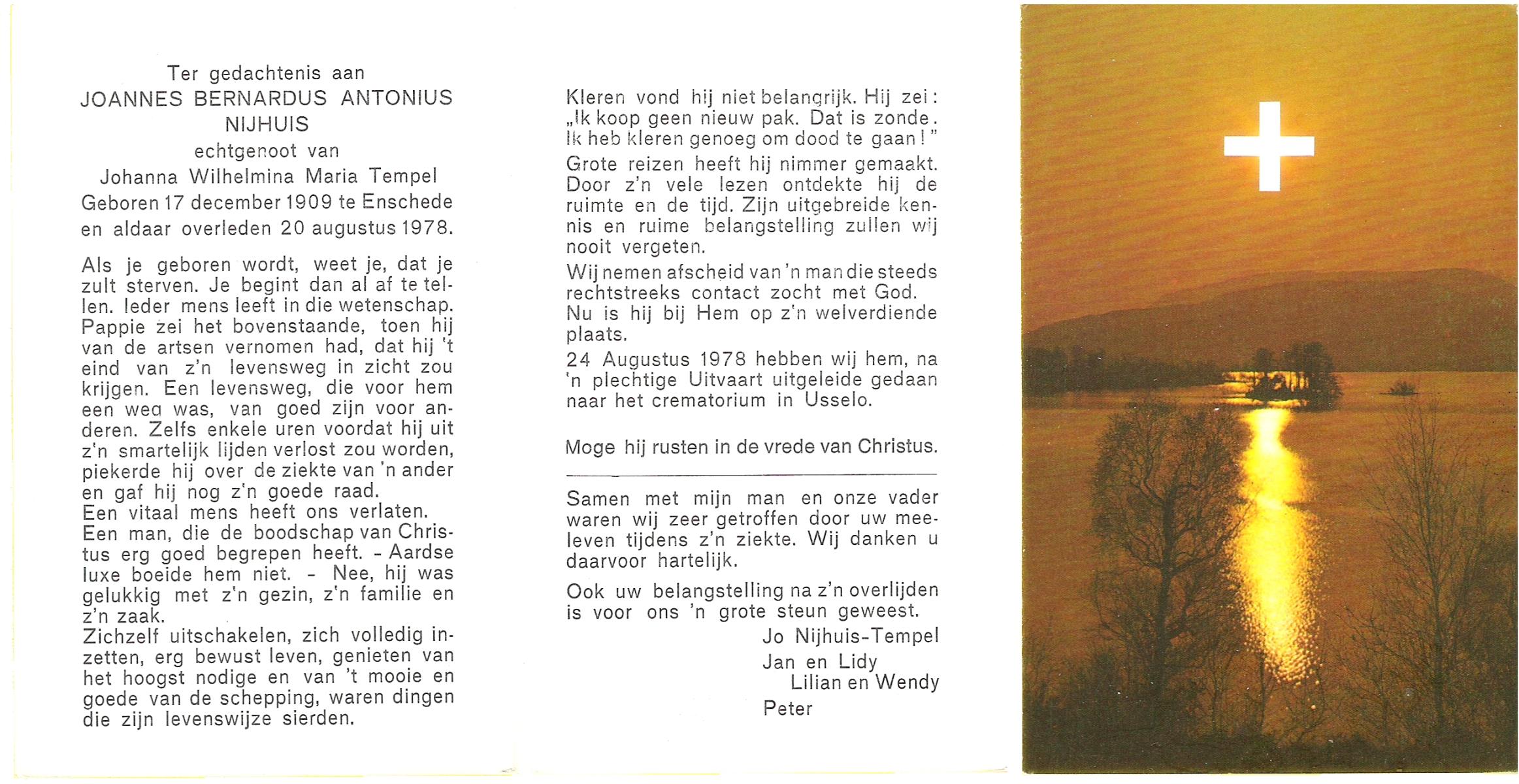 NIJHUIS, Joannes Bernardus Antonius, geboren op 17-12-1909 te Enschede, overleden op 20-8-1978 te Enschede op 68-jarige leeftijd, gecremeerd op 24-8-1978 te Usselo.