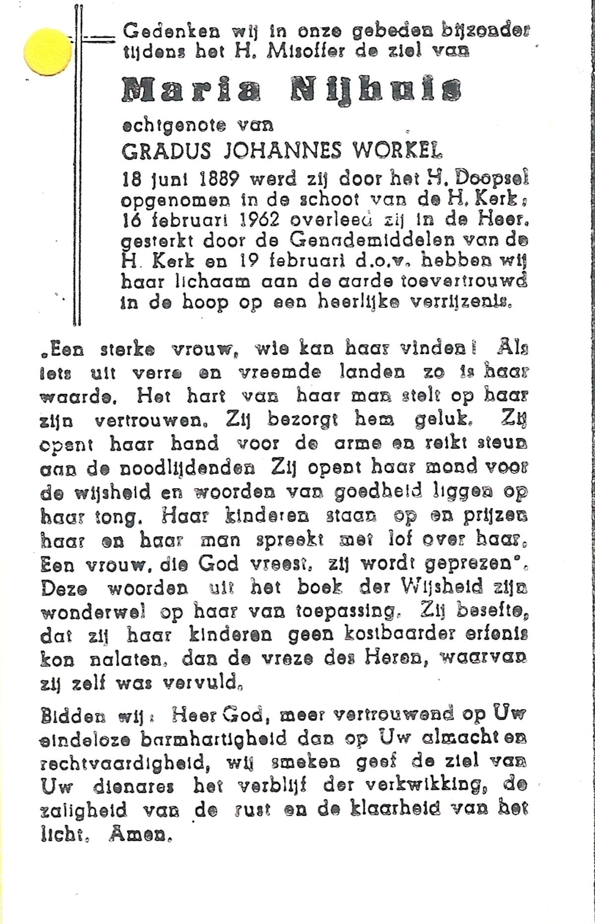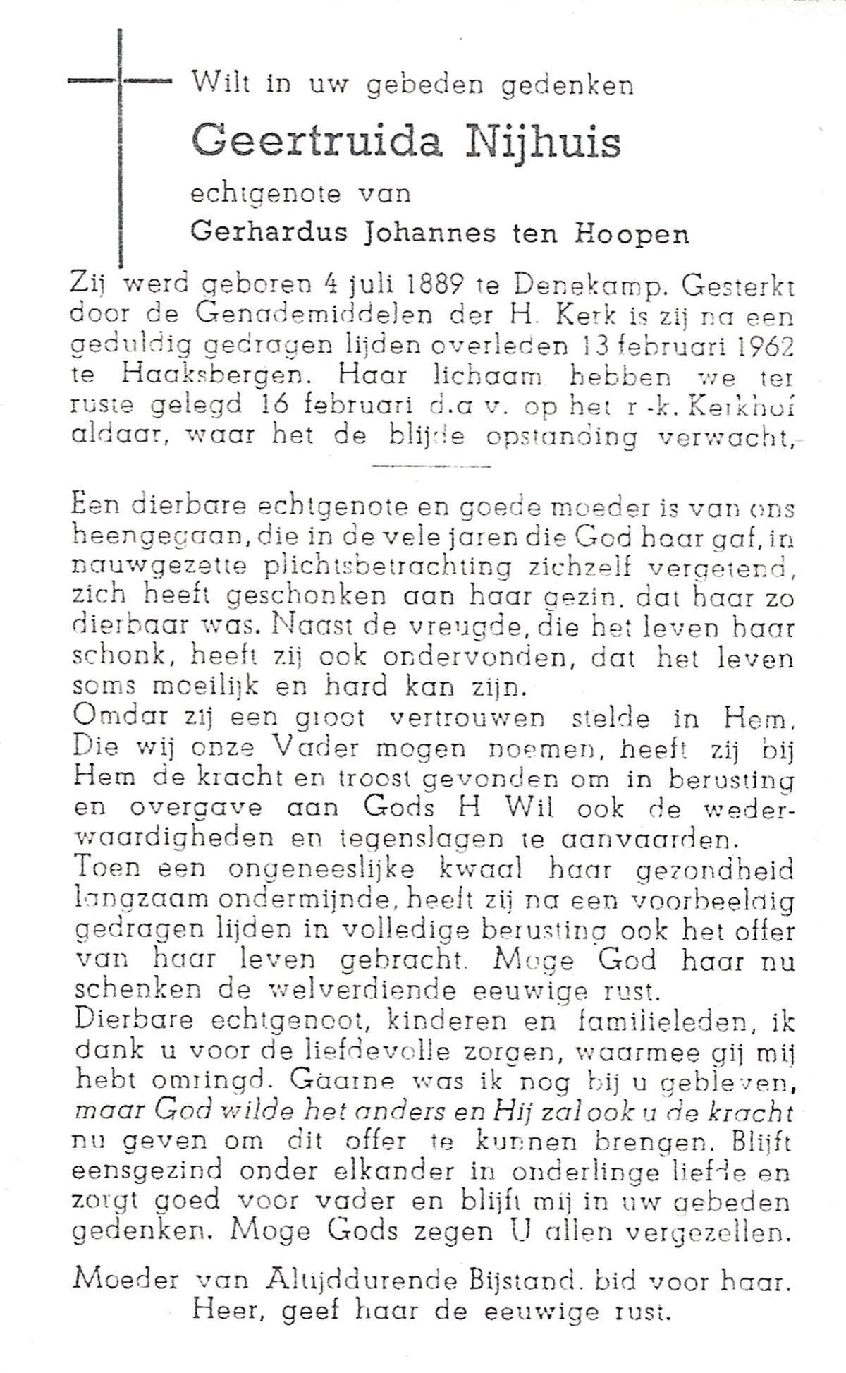 NIJHUIS, Maria, geboren op 18-06-1889, overleden op 16-2-1962 op 72-jarige leeftijd, begraven op 19-2-1962.