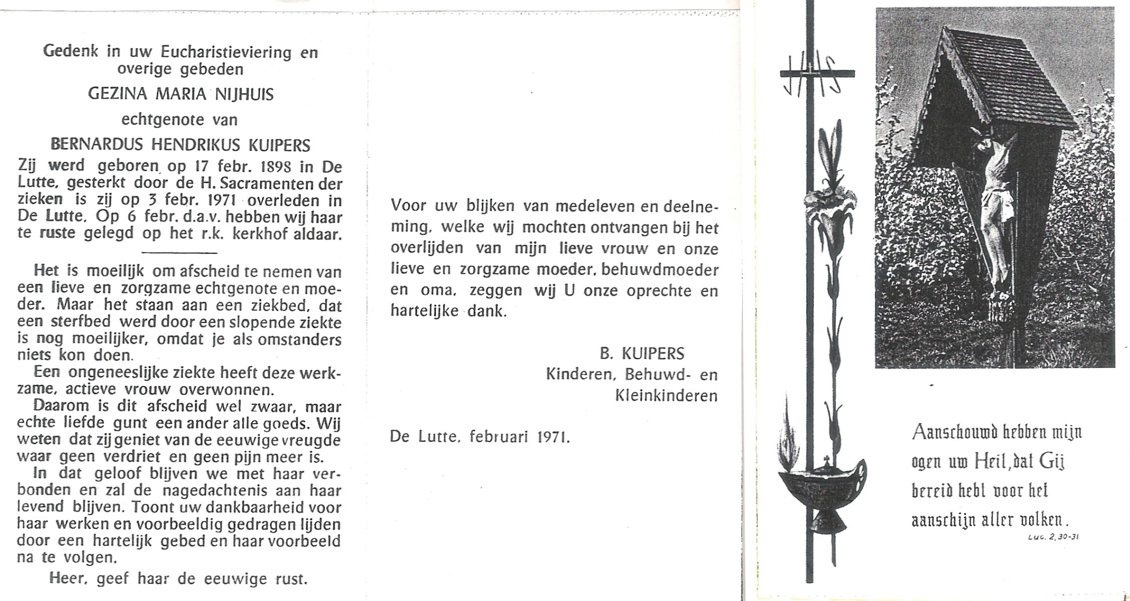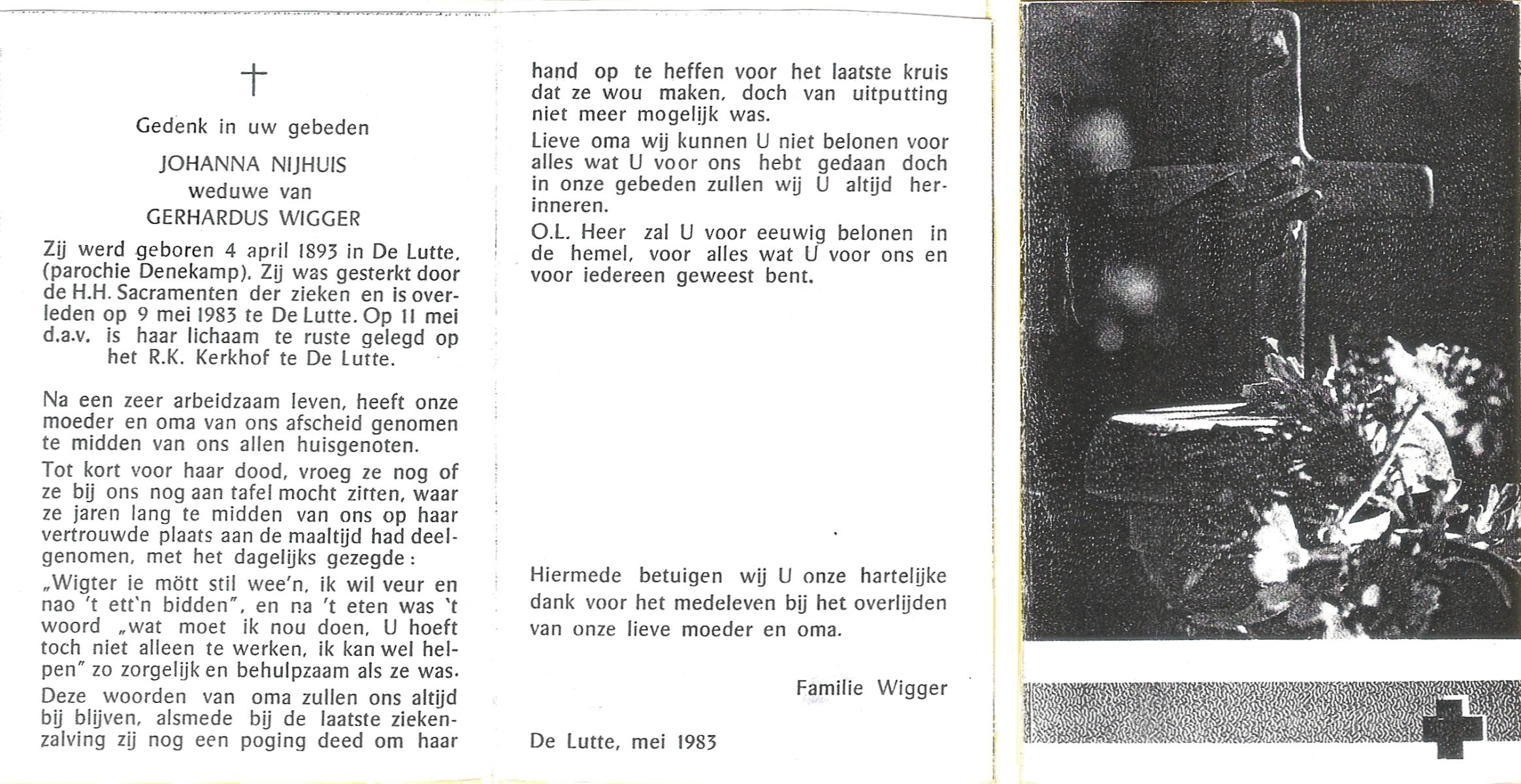 NIJHUIS, Johanna, geboren op 04-04-1893 te De Lutte, overleden op 9-5-1983 te De Lutte op 90-jarige leeftijd, begraven op 11-5-1983 te de Lutte R.K.kerkhof.