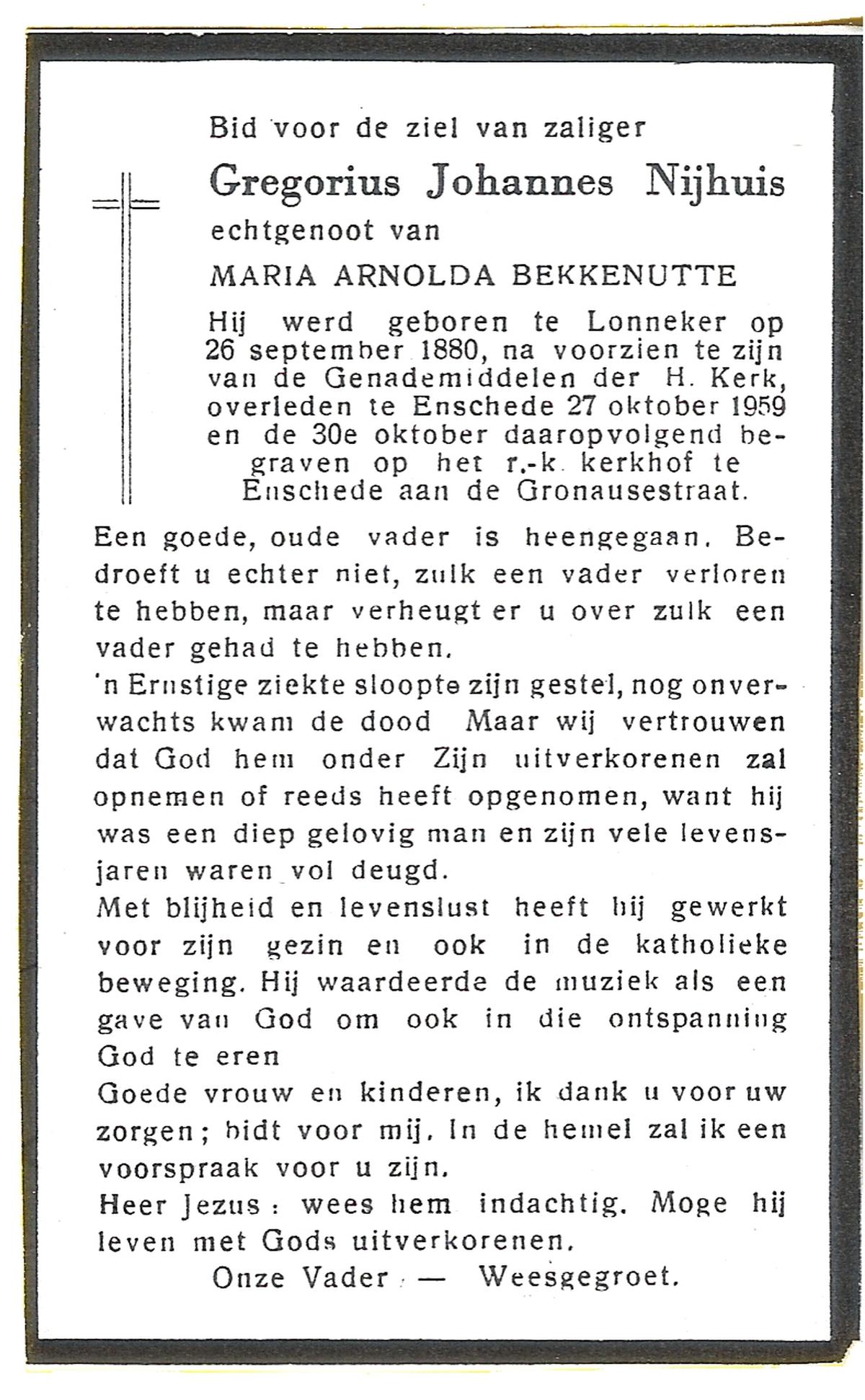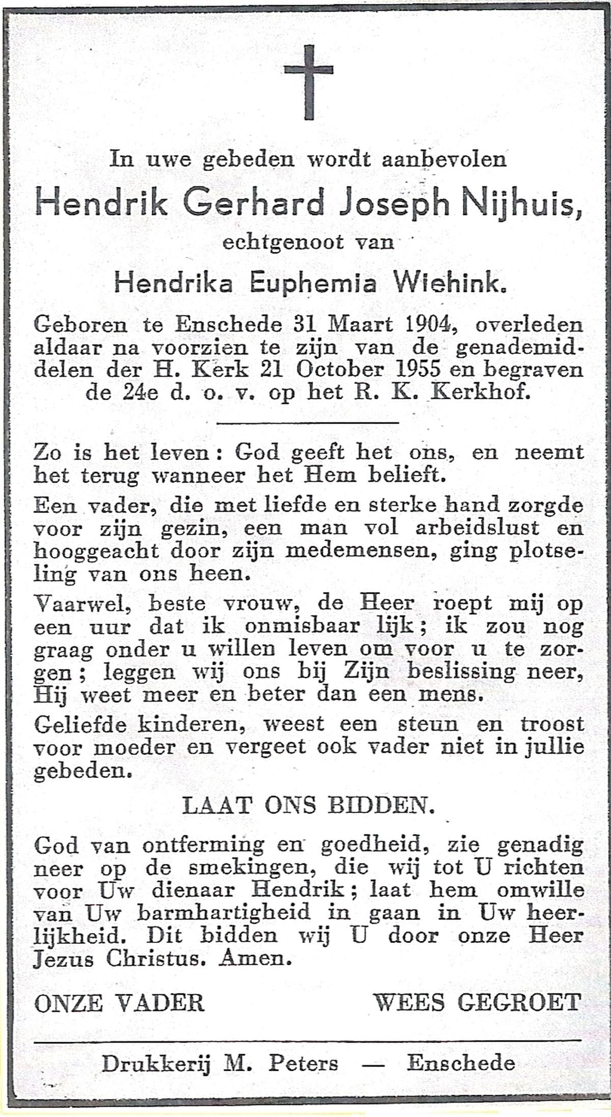 NIJHUIS, Johannes Wilhelmus Gerhardus, geboren op 27-06-1883 te Lonneker, overleden op 26-10-1952 te Enschede op 69-jarige leeftijd, begraven op 29-10-1952 te Enschede.