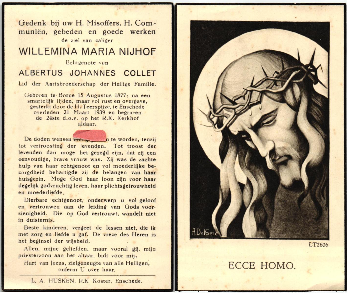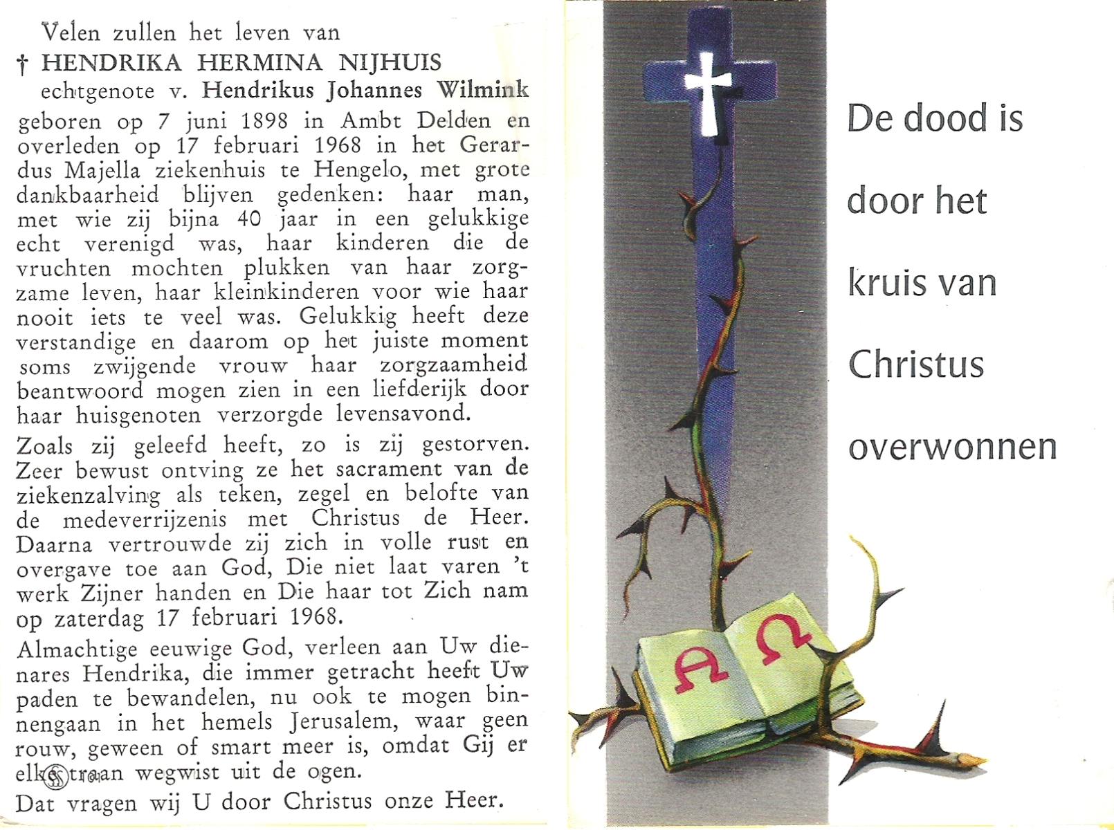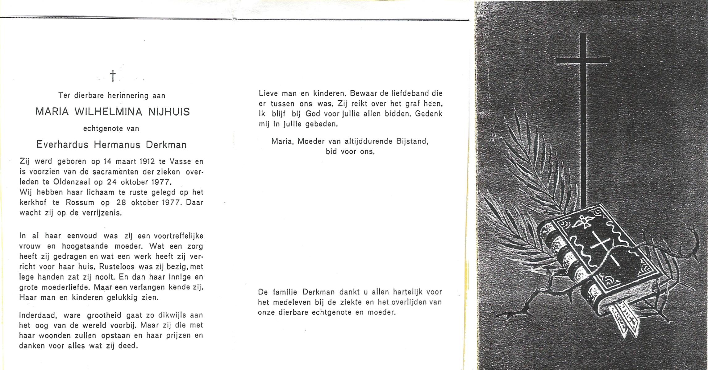 NIJHUIS, Maria Wilhelmina, geboren op 14-3-1912 te Vasse, overleden op 24-10-1977 te Oldenzaal op 65-jarige leeftijd, begraven op 28-10-1977 te Rossum.