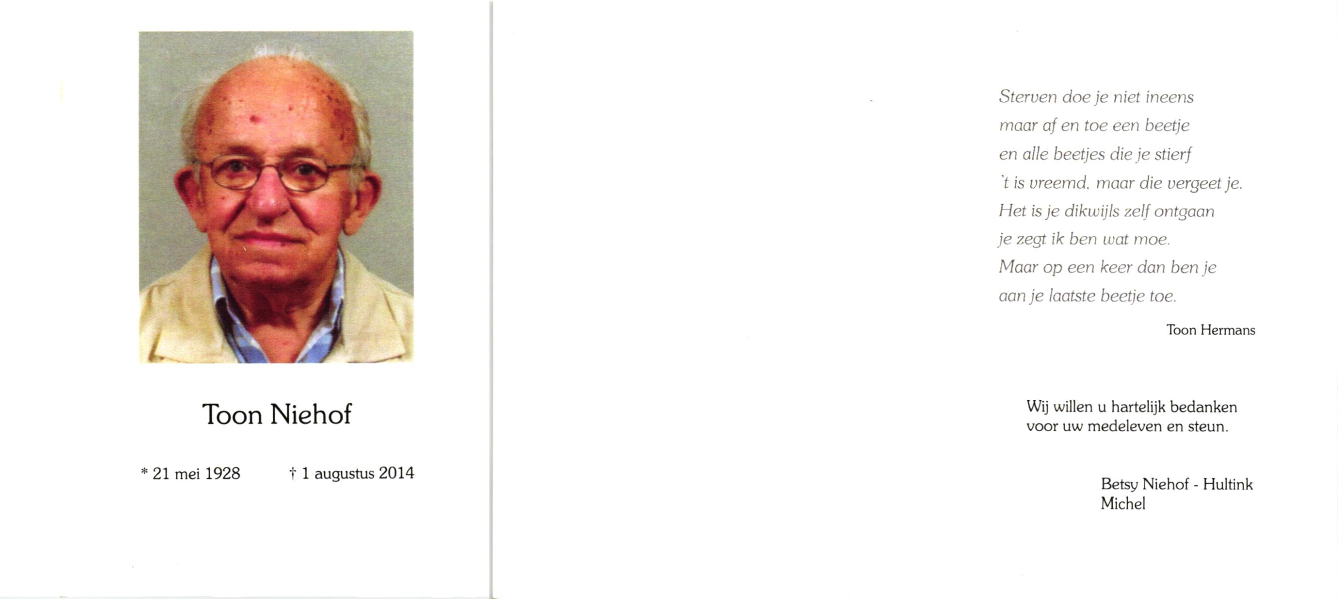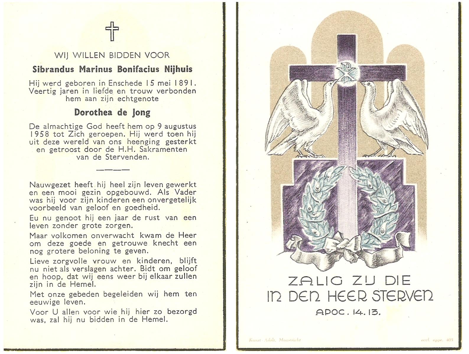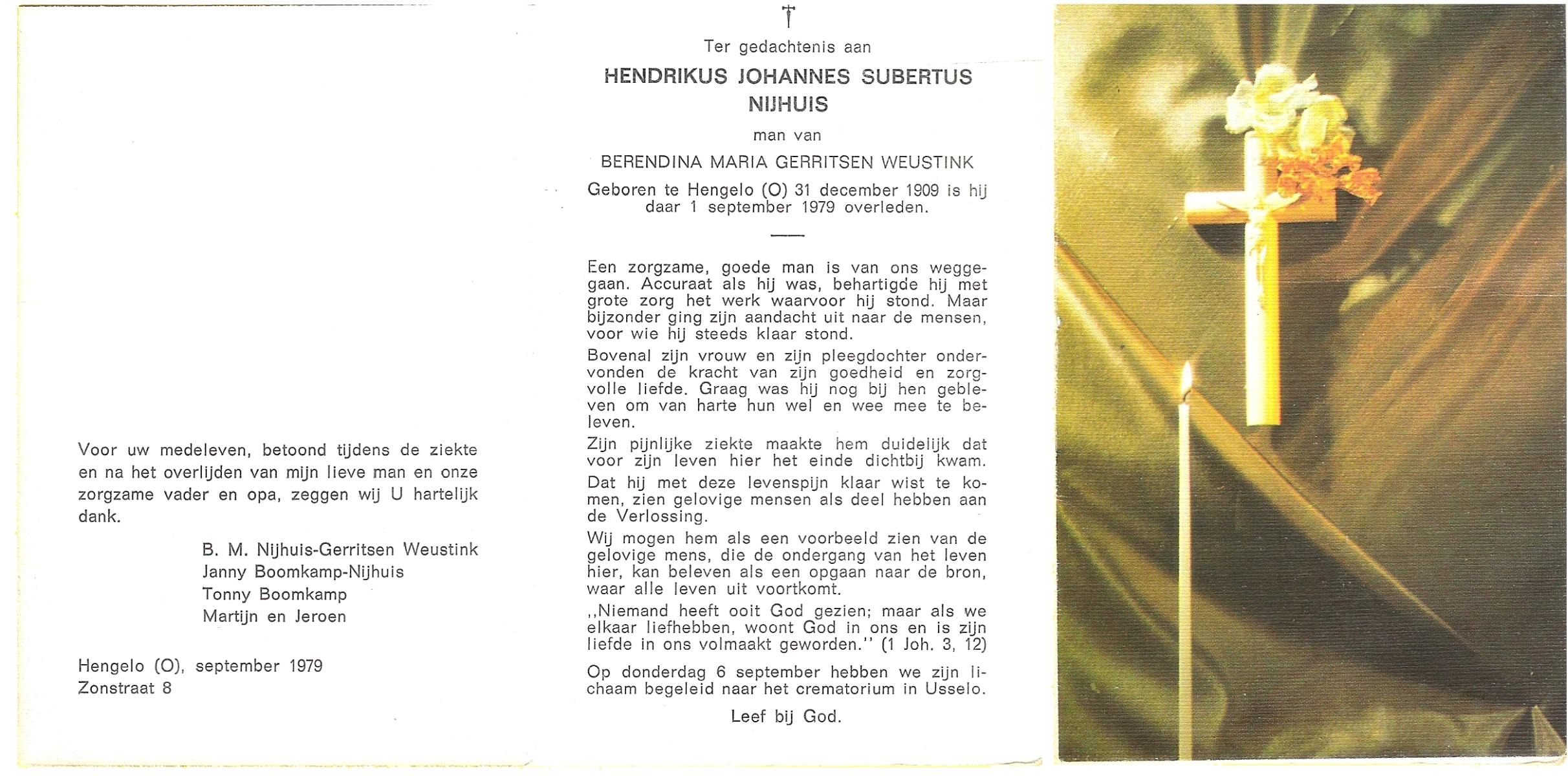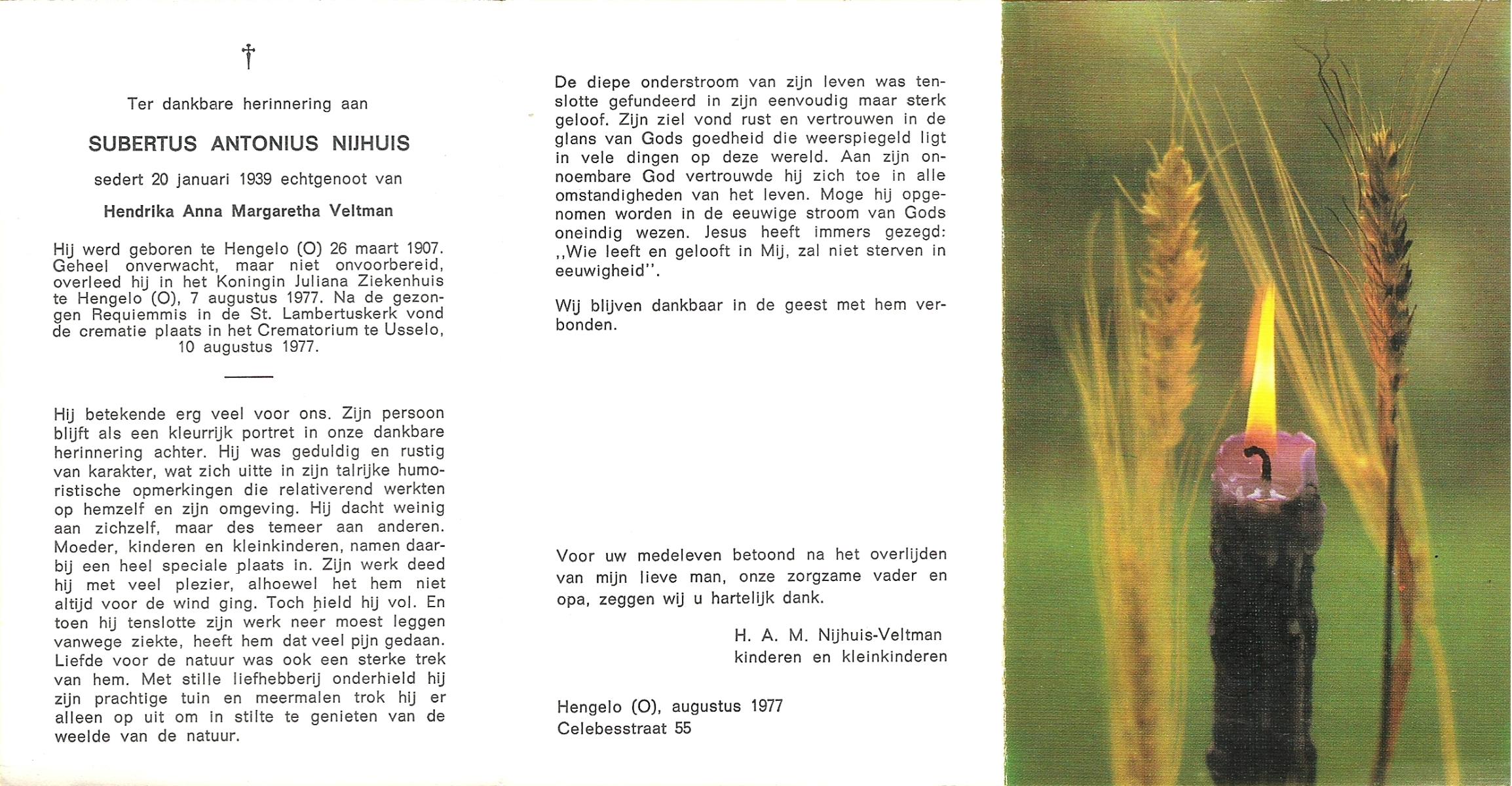 NIJHUIS, Subertus Antonius, geboren op 26-3-1907 te Hengelo (O), overleden op 7-8-1977 te Hengelo (Ov.) op 70-jarige leeftijd, gecremeerd op 10-8-1977 te Usselo.