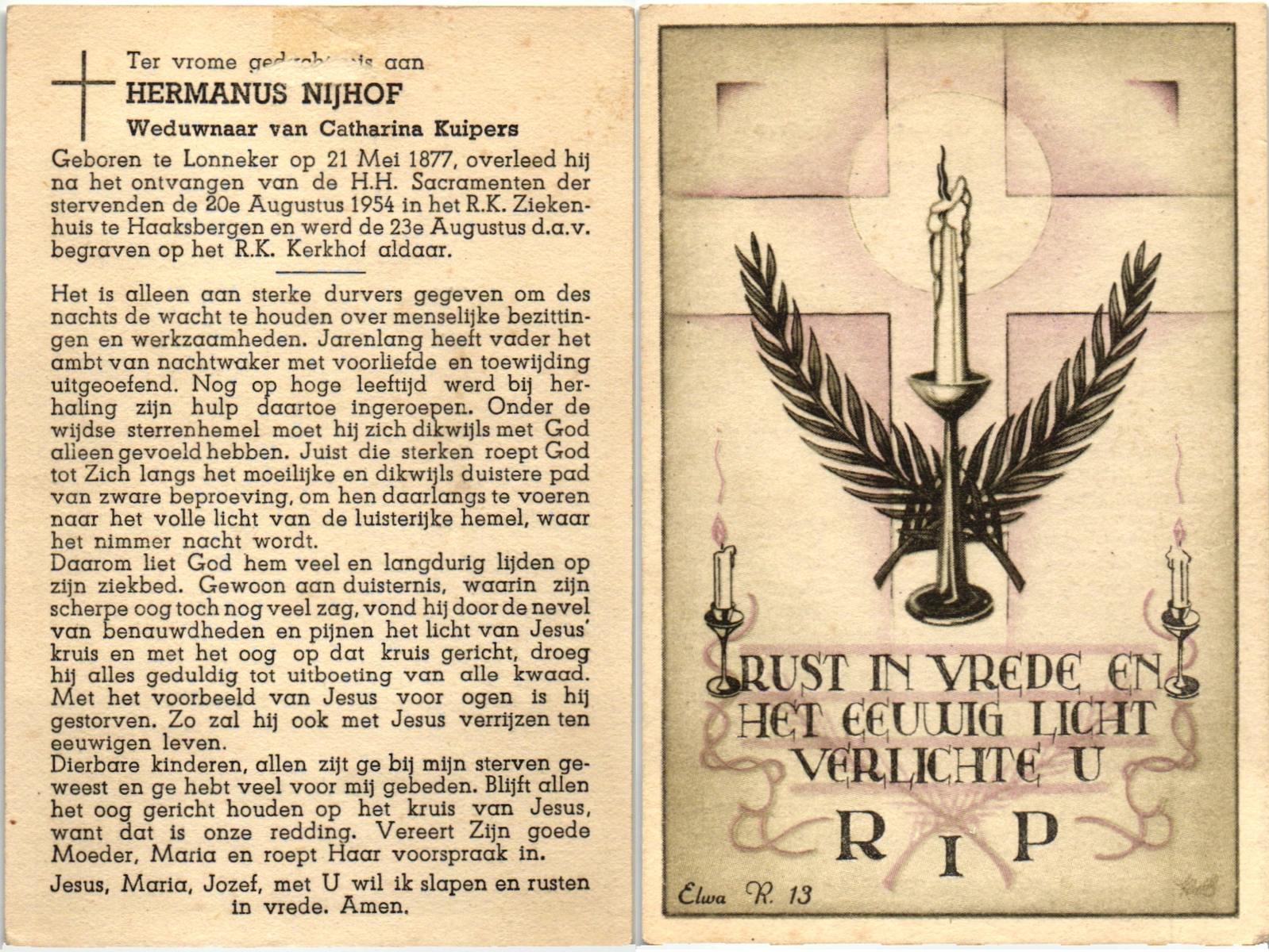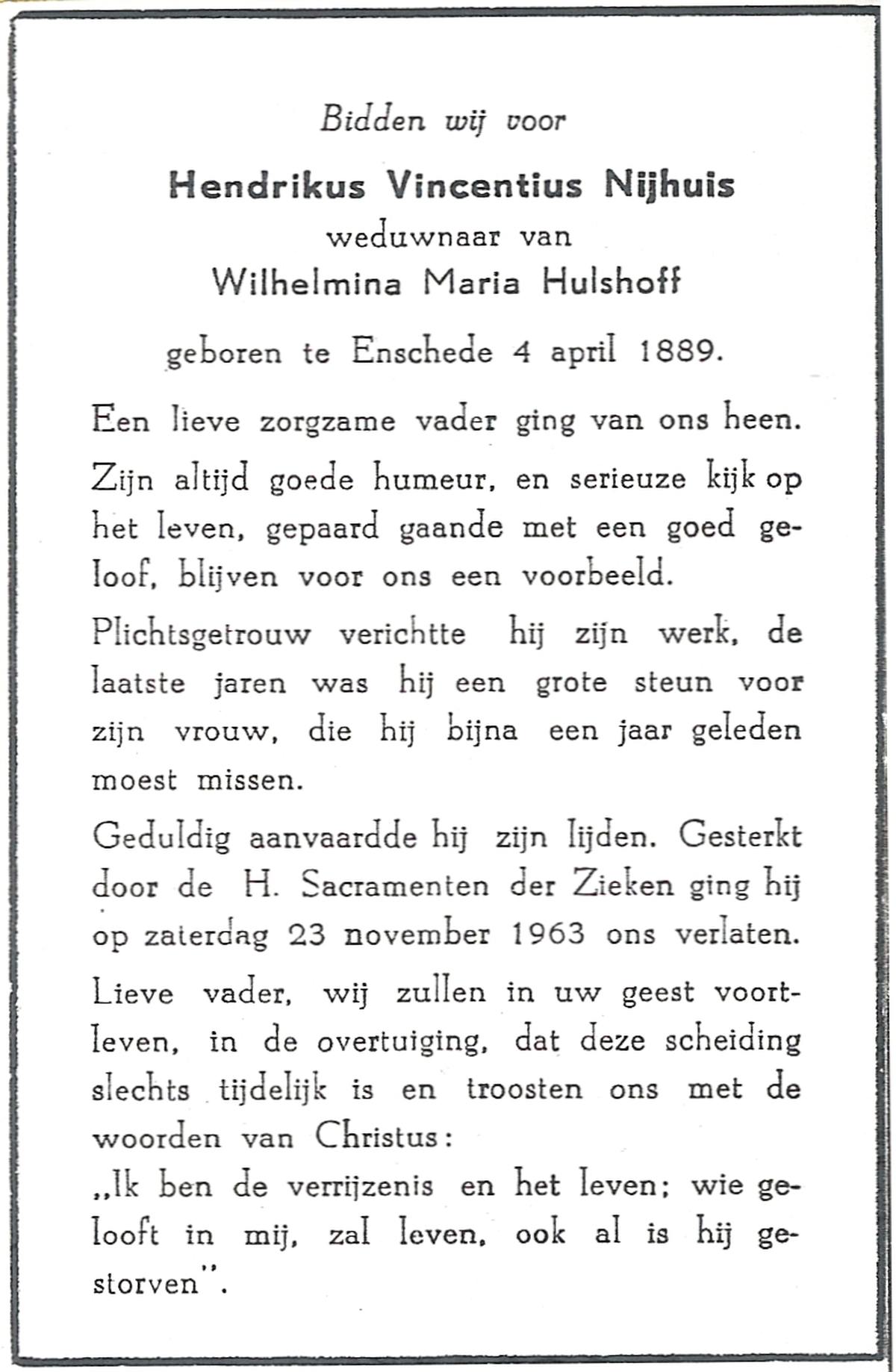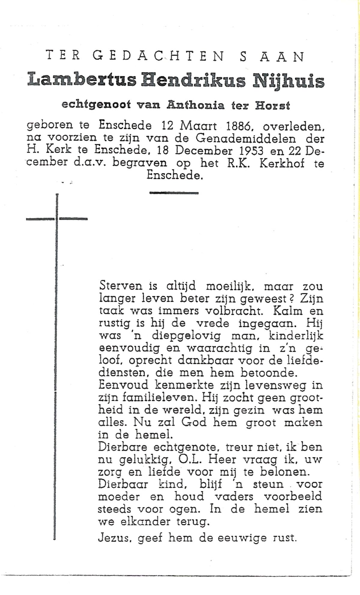NIJHUIS, Lambertis Hendrikus, geboren op 12-03-1886 te Enschede, overleden op 18-12-1953 te Enschede op 67-jarige leeftijd, begraven op 22-12-1953 te Enschede.