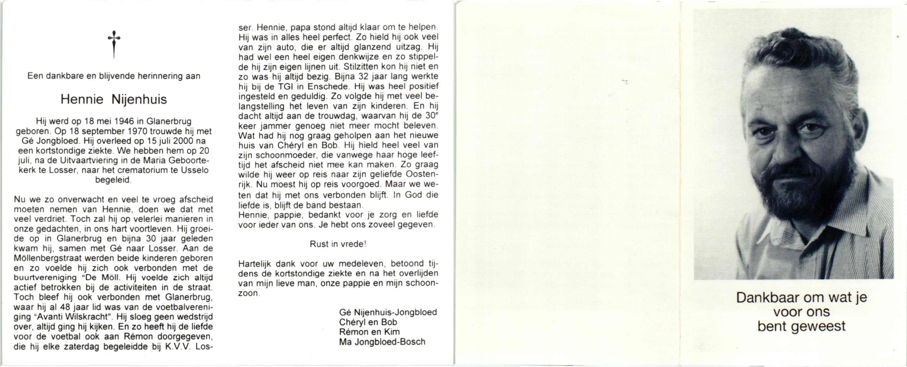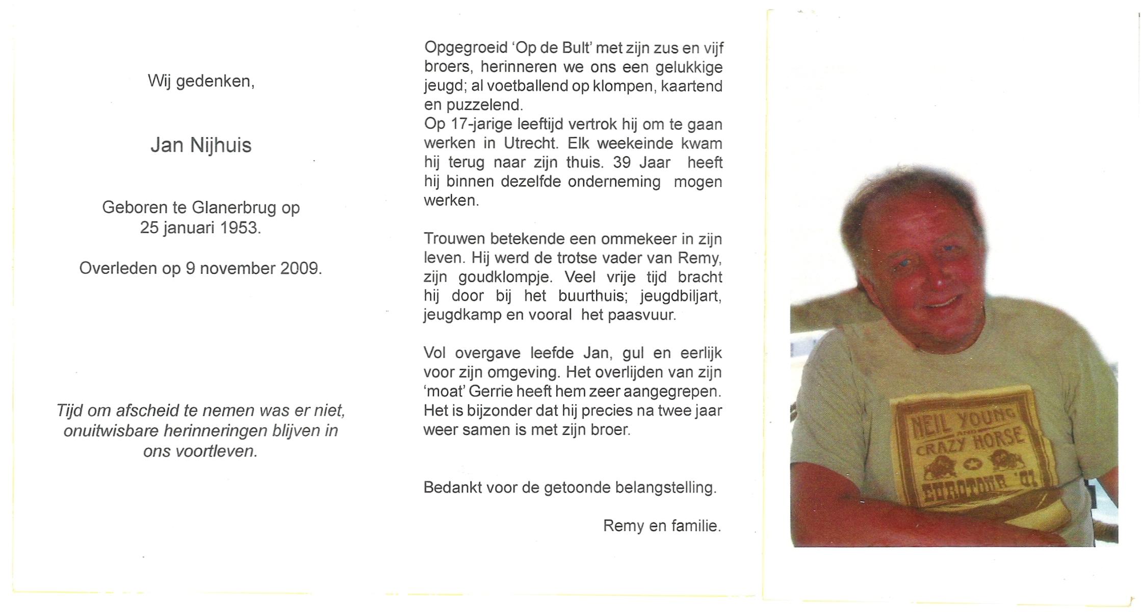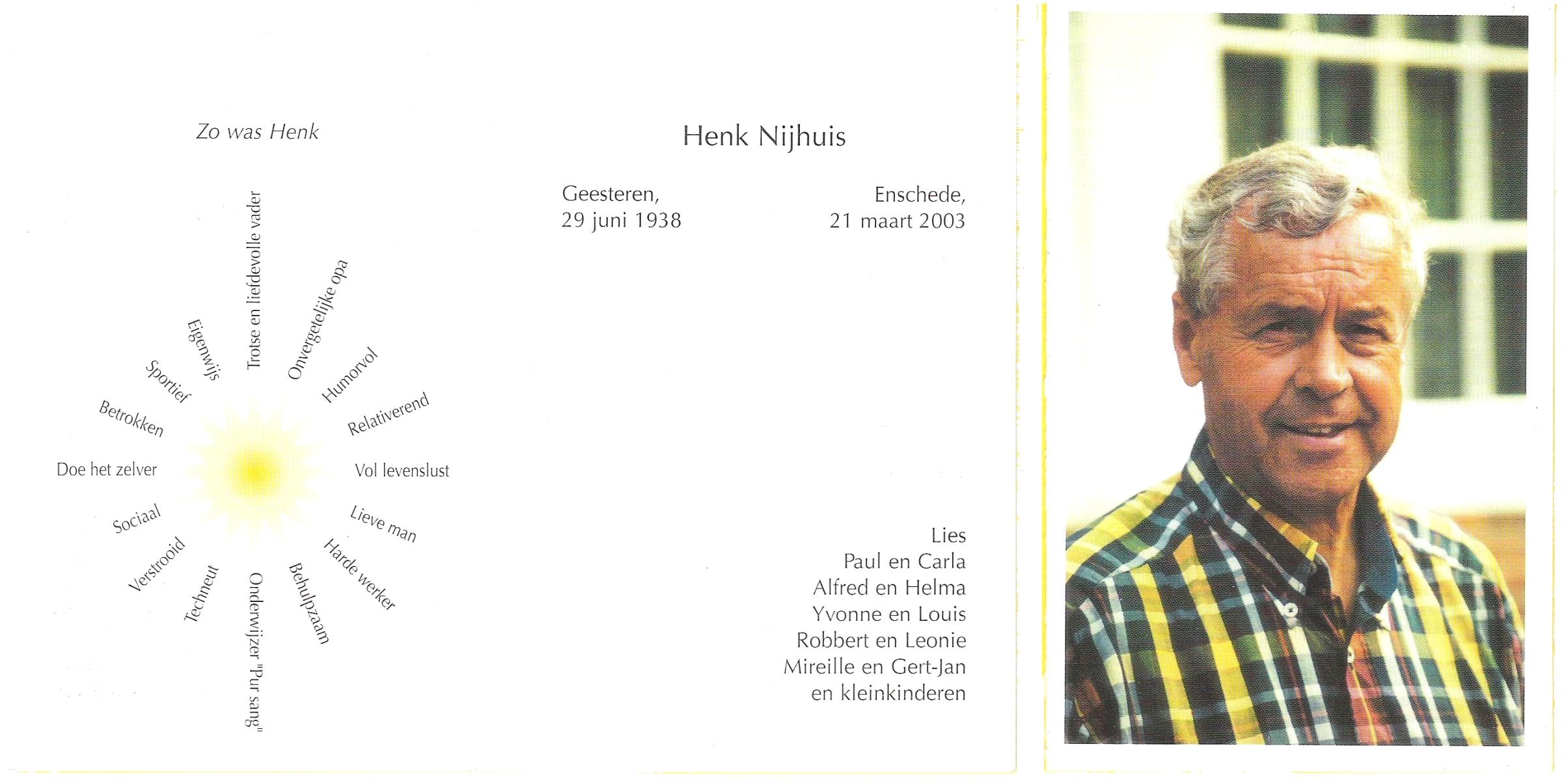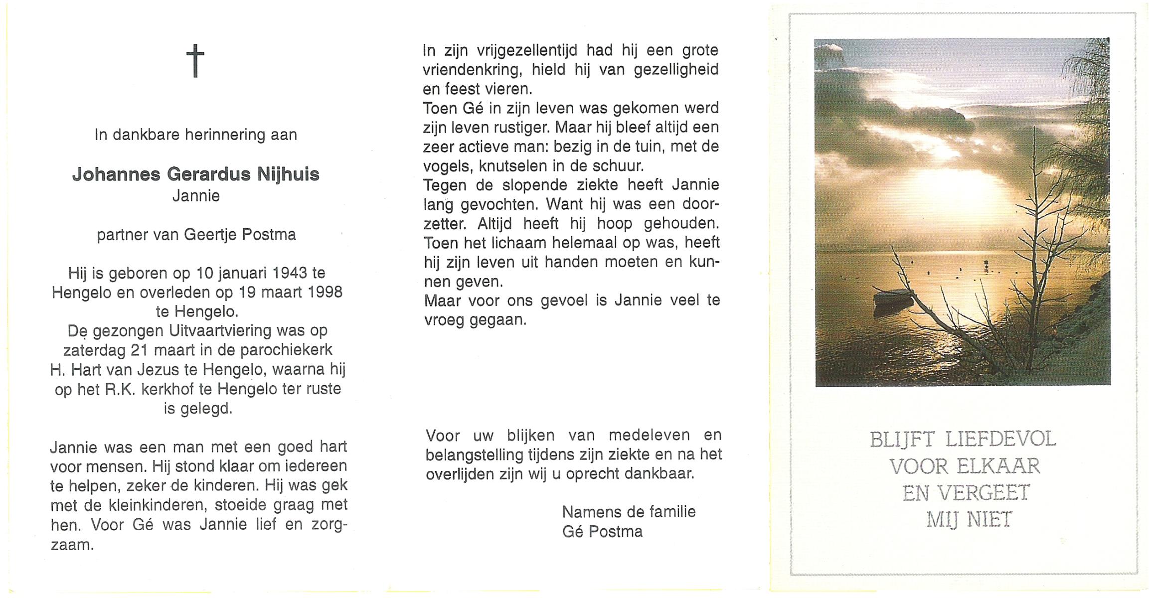 NIJHUIS, Johannes Gerardus (Jannie), geboren op 10-1-1943 te Hengelo (O), overleden op 19-3-1998 te Hengelo (Ov.) op 55-jarige leeftijd, begraven op 21-3-1998 te Hengelo (Ov.).