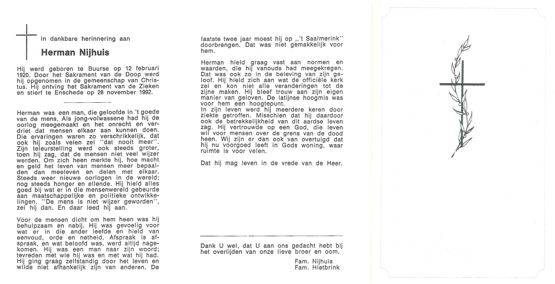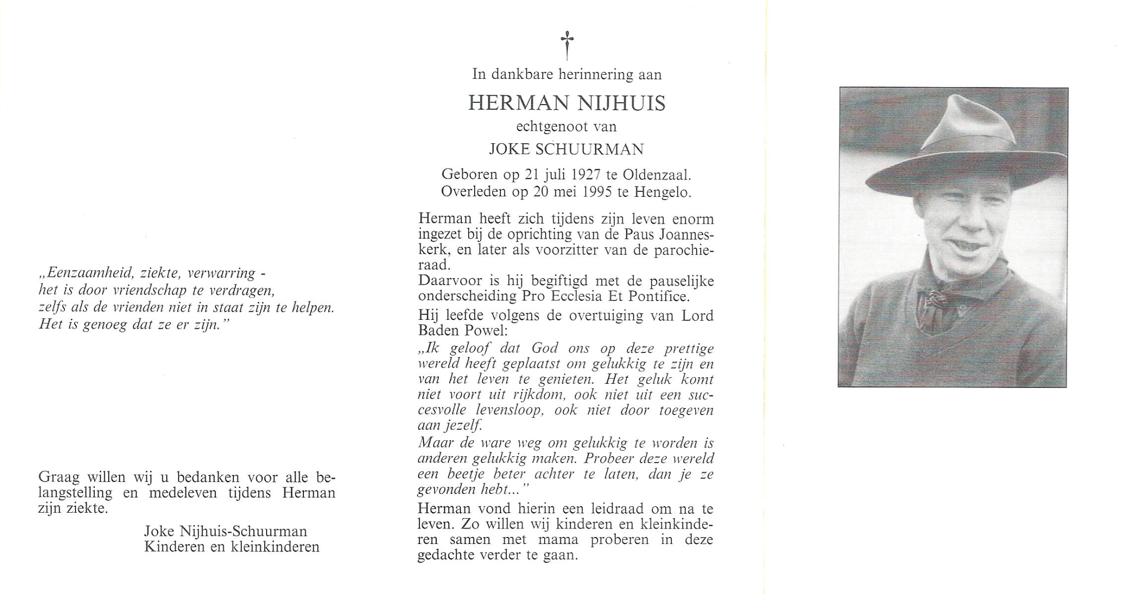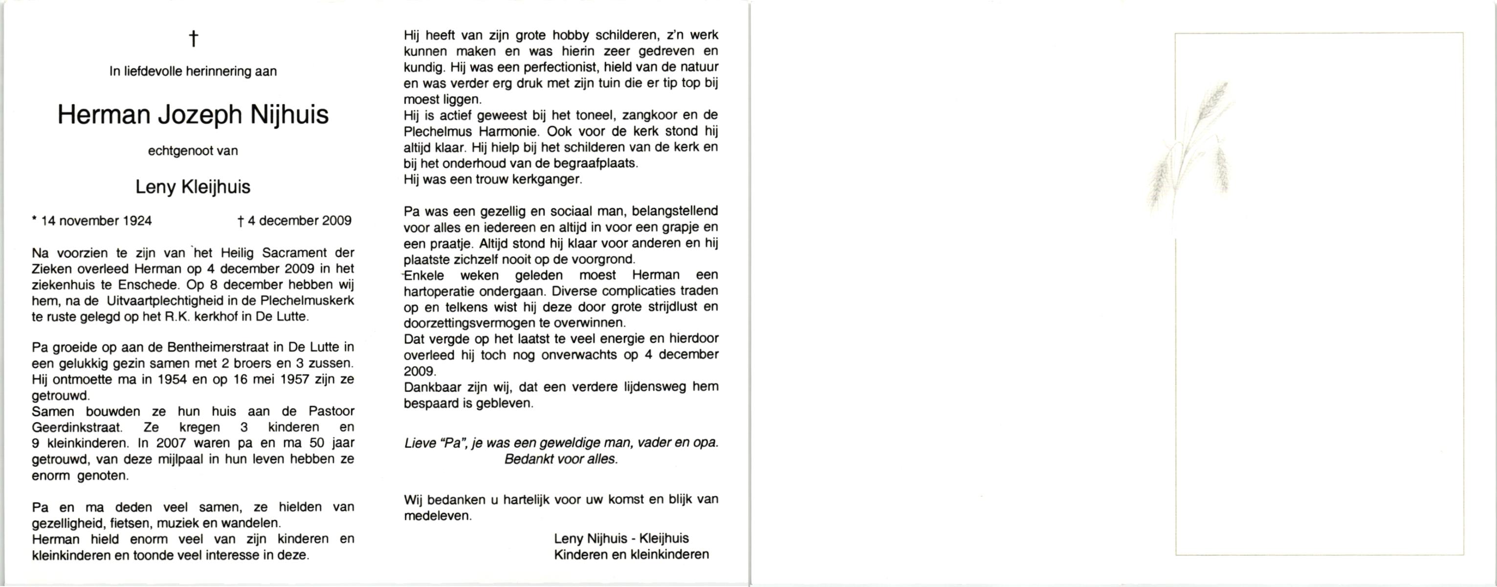 NIJHUIS, , Herman Jozeph, geboren op 14-11-1924 te De Lutte, overleden op 4-12-2009 te Enschede op 85-jarige leeftijd, begraven op 8-12-2009 te De Lutte.