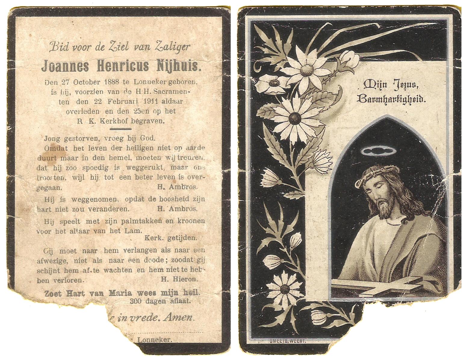 NIJHUIS, Joannes Henricus, geboren op 27-10-1888 te Lonneker, overleden op 22-2-1911 te Lonneker op 22-jarige leeftijd, begraven op 25-2-1911 te Lonneker.