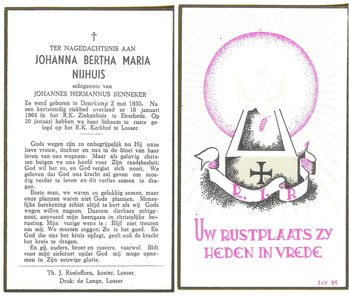 NIJHUIS, Johanna Bertha Maria, geboren op 2-5-1930 te Denekamp, overleden op 16-1-1964 te Enschede op 33-jarige leeftijd, begraven op 20-1-1964 te Losser.