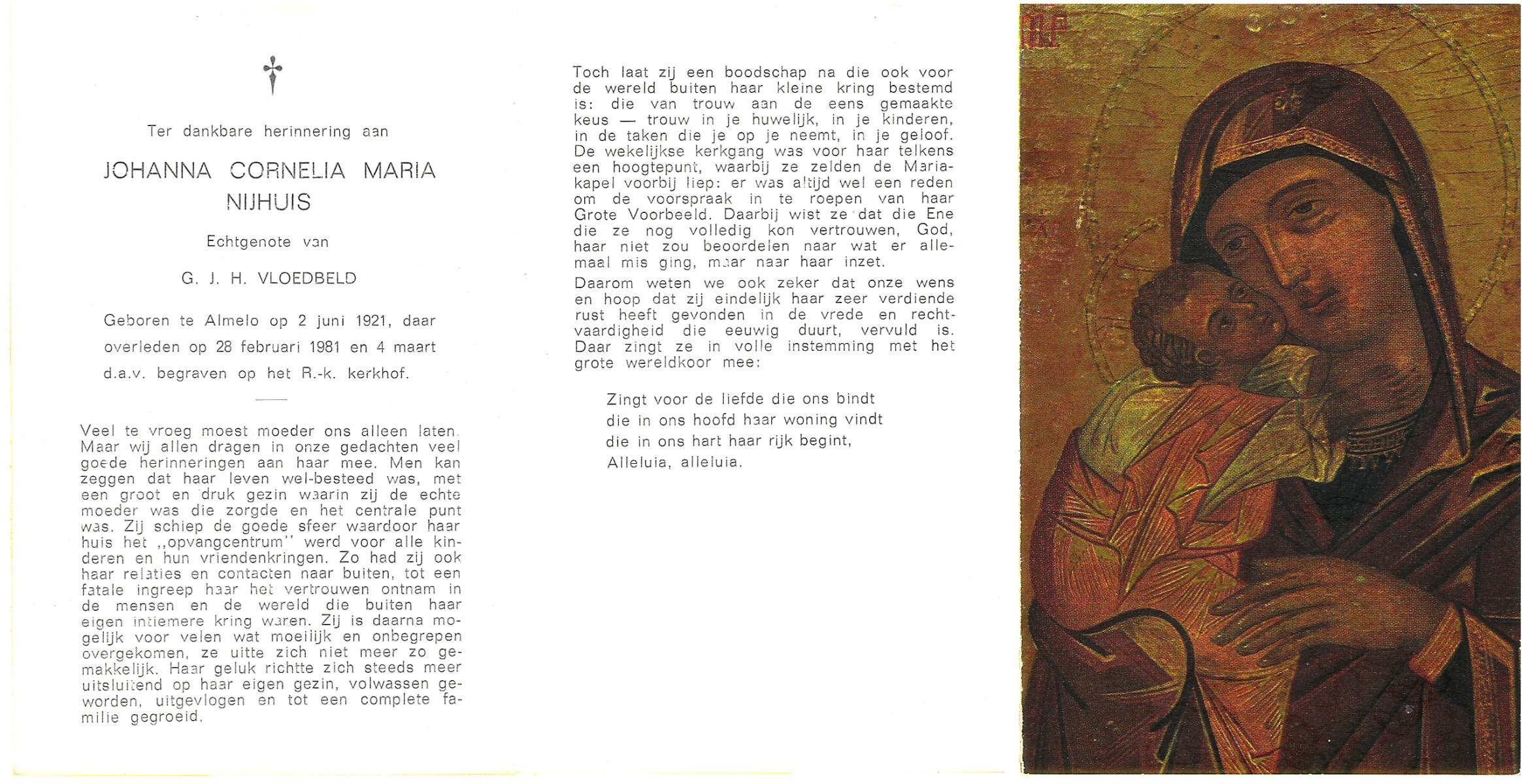 NIJHUIS, Johanna Cornelia Maria, geboren op 2-6-1921 te Almelo, overleden op 28-2-1981 op 59-jarige leeftijd, begraven op 4-3-1981 te Almelo.