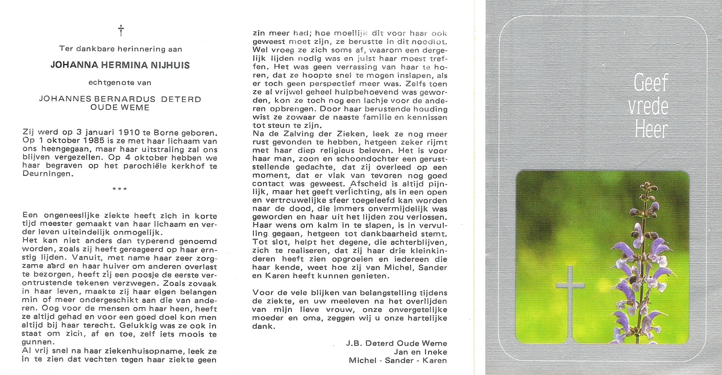 NIJHUIS, Johanna Hermina, geboren op 3-1-1910 te Borne, overleden op 1-10-1985 op 75-jarige leeftijd, begraven op 4-10-1985 te Deurningen.