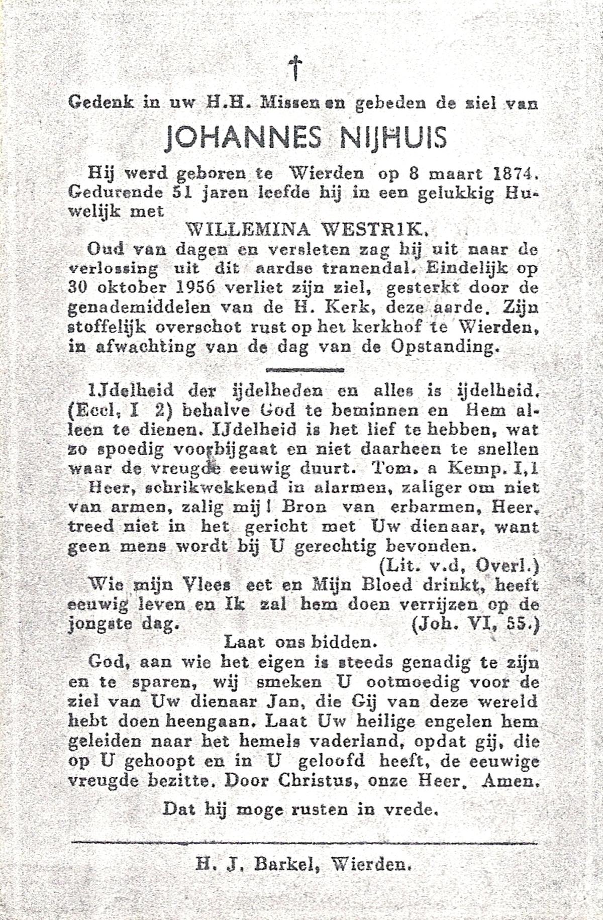 NIJHUIS, Johannes, geboren op 08-03-1874 te Wierden, overleden op 30-10-1956 te Wierden op 82-jarige leeftijd, begraven te Wierden.