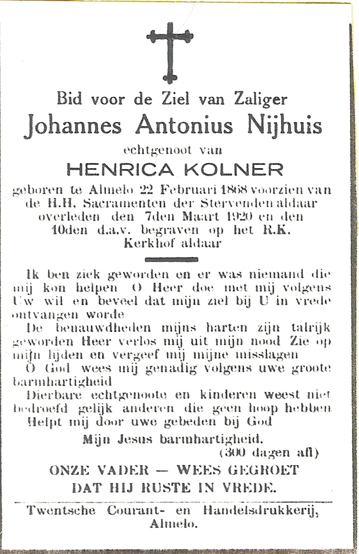 NIJHUIS, Johannes Antonius, geboren op 22-02-1868 te Almelo, overleden op 7-3-1920 te Almelo op 52-jarige leeftijd, begraven op 10-3-1920 te Almelo.