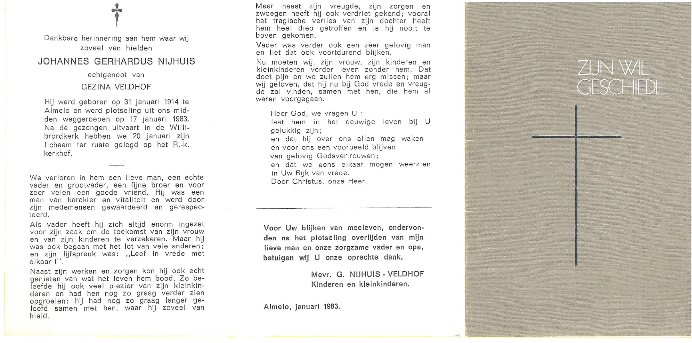 NIJHUIS, Johannes Gerhardus, geboren op 31-1-1914 te Almelo, overleden op 17-1-1983 op 68-jarige leeftijd, begraven op 20-1-1983 te Almelo.