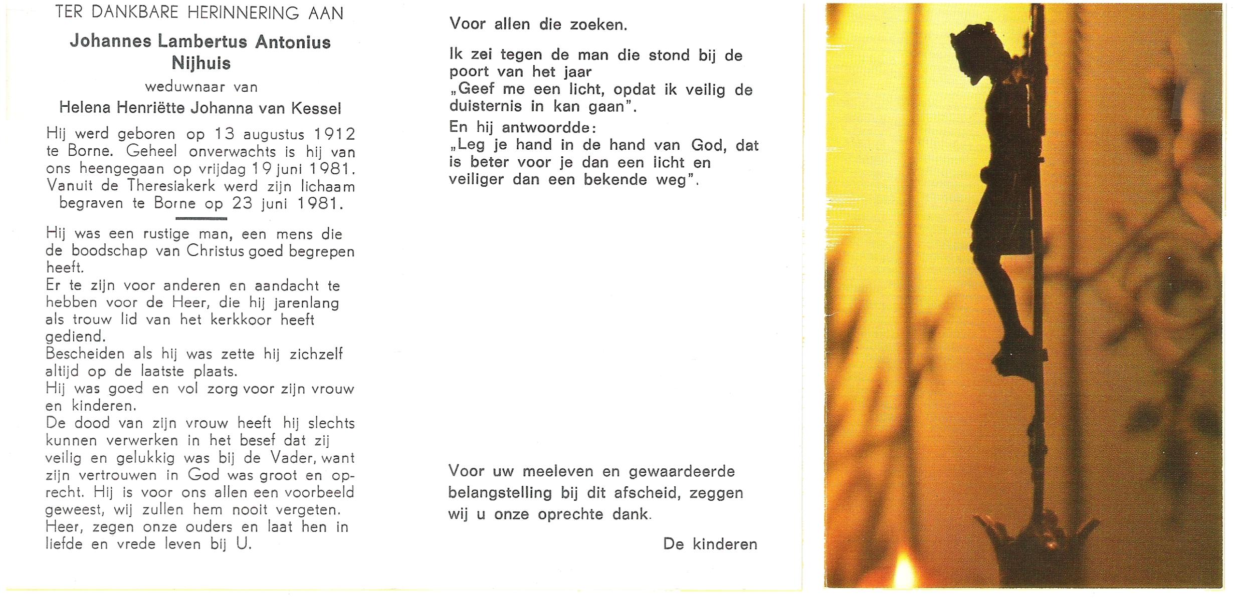 NIJHUIS, Johannes Lambertus Antonius, geboren op 13-8-1912 te Borne, overleden op 19-6-1981 op 68-jarige leeftijd, begraven op 23-6-1981 te Borne.