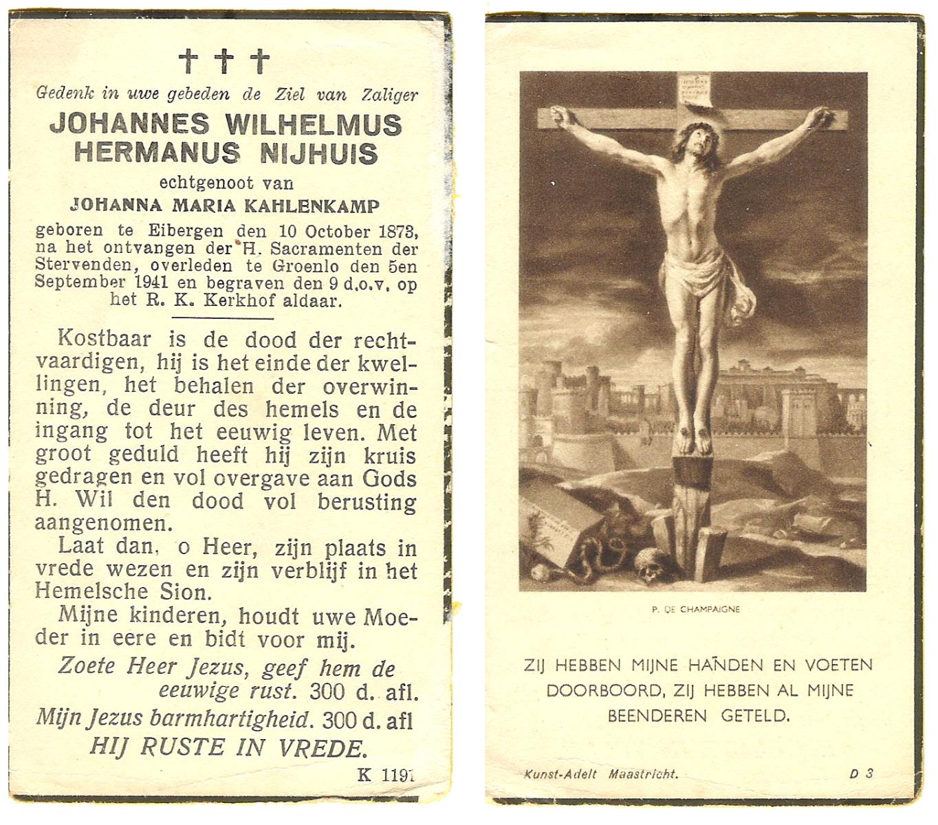 NIJHUIS, Johannes Wilhelmus Hermanus, geboren op 10-12-1878 te Eibergen, overleden op 5-9-1941 te Groenlo op 62-jarige leeftijd, begraven op 9-9-1941 te Groenlo.