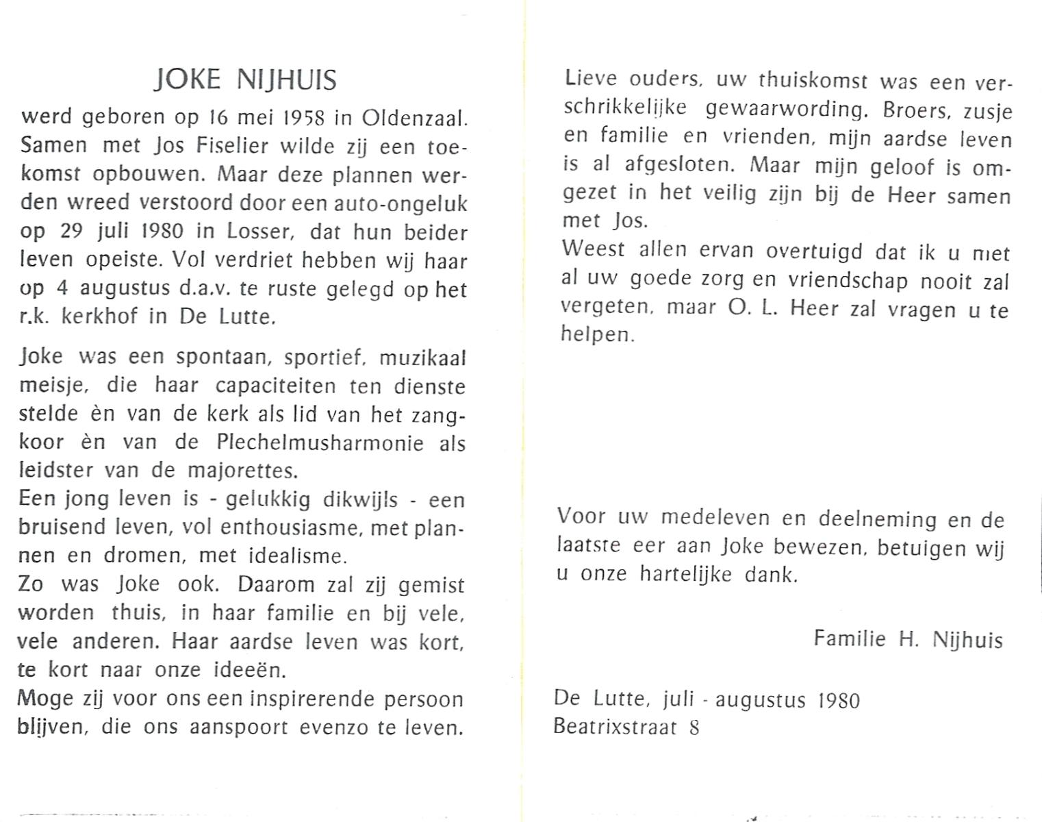 NIJHUIS, Joke, geboren op 16-5-1958 te Oldenzaal, overleden op 29-7-1980 te Losser op 22-jarige leeftijd, begraven op 4-8-1980 te 0.