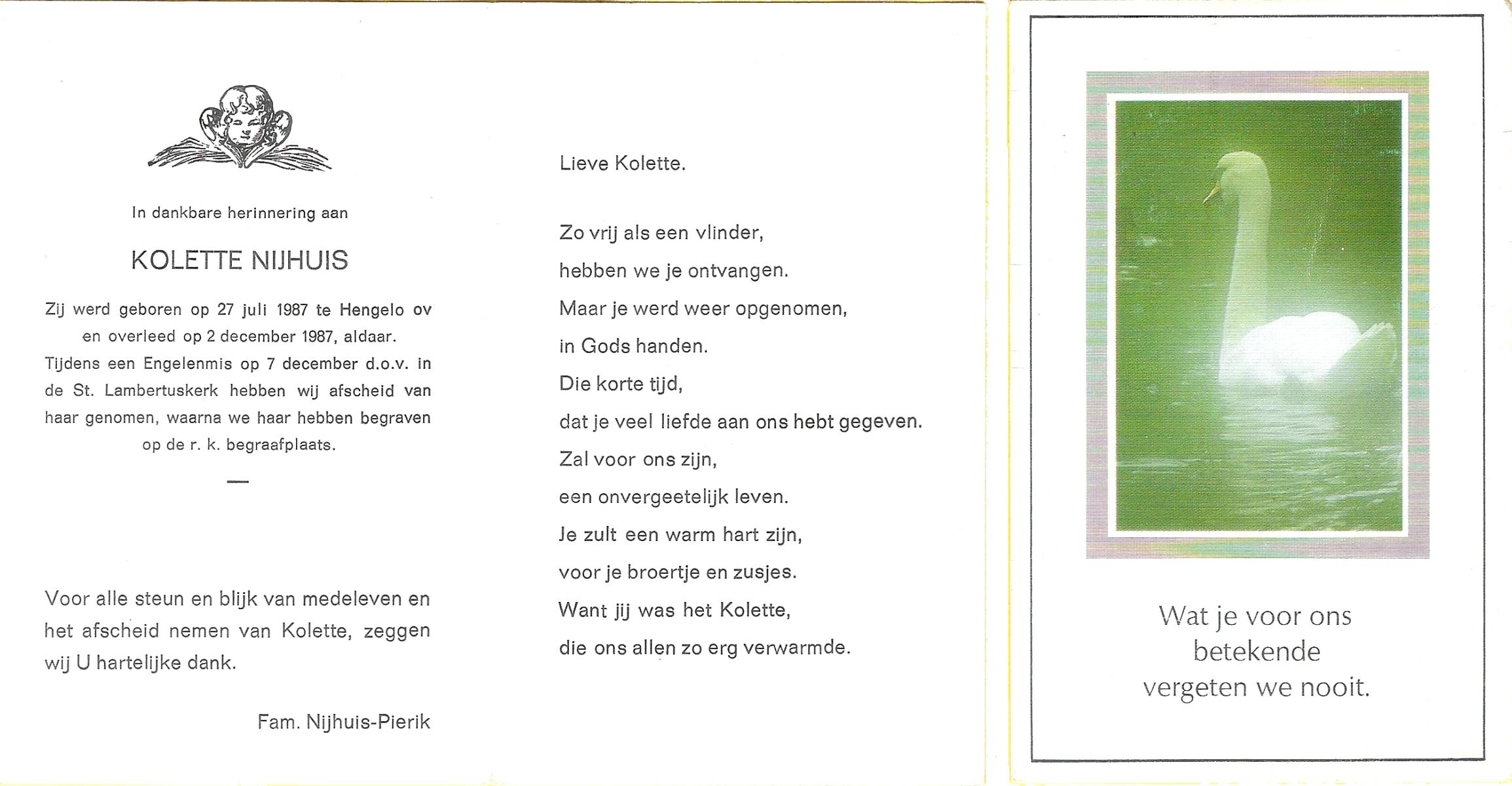 NIJHUIS, Kolette, geboren op 27-7-1987 te Hengelo (O), overleden op 2-12-1987 te Hengelo (Ov.) op 0-jarige leeftijd, begraven op 7-12-1987 te Hengelo (Ov.).
