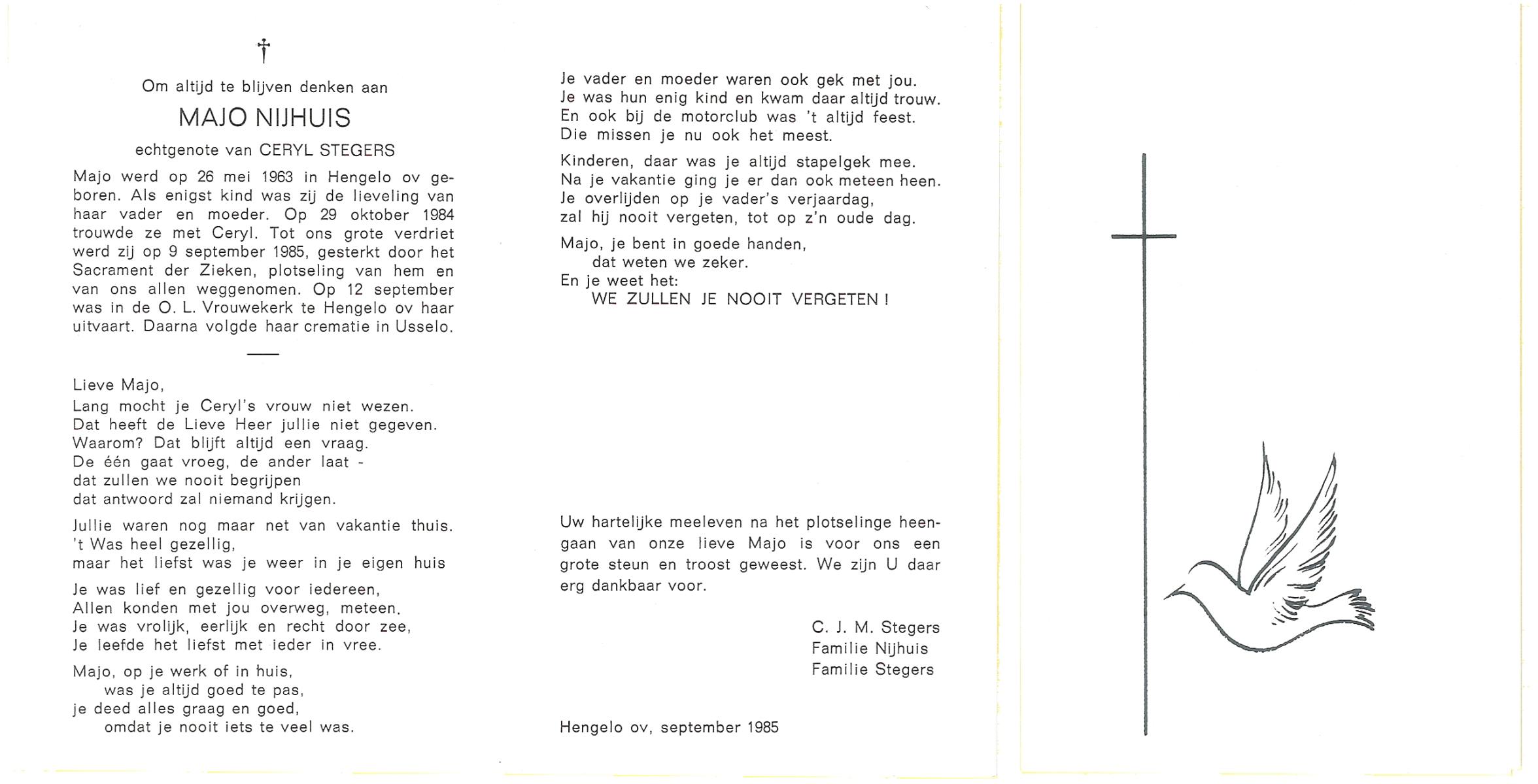 NIJHUIS, Majo, geboren op 26-5-1963 te Hengelo (O), overleden op 9-9-1985 op 22-jarige leeftijd, begraven op 12-9-1985 te Usselo.