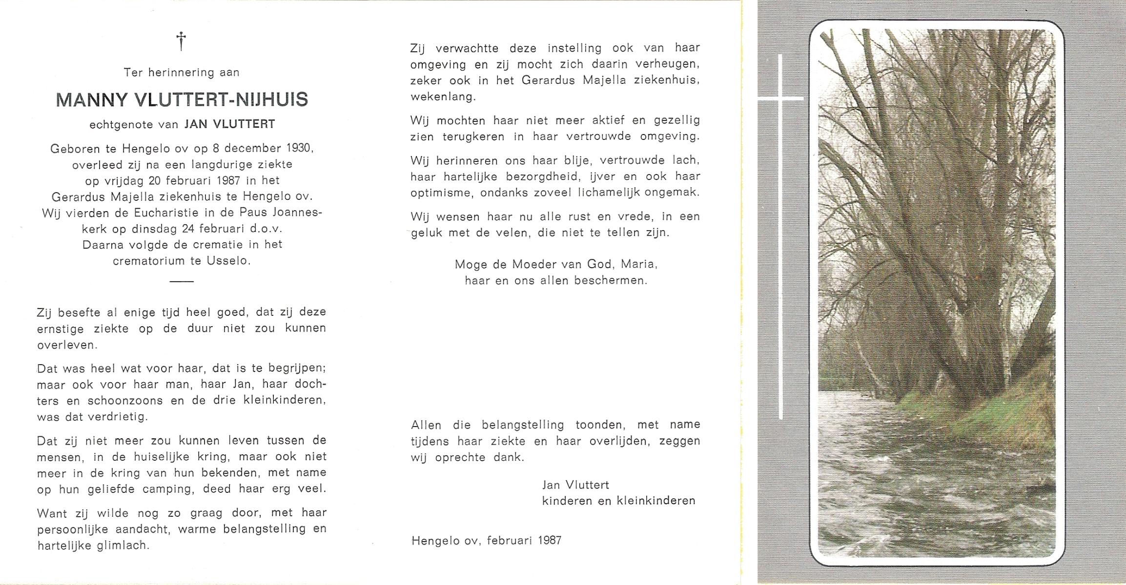 NIJHUIS, Manny, geboren op 8-12-1930 te Hengelo (O), overleden op 20-2-1987 te Hengelo (Ov.) op 56-jarige leeftijd, gecremeerd op 24-2-1987 te Usselo.