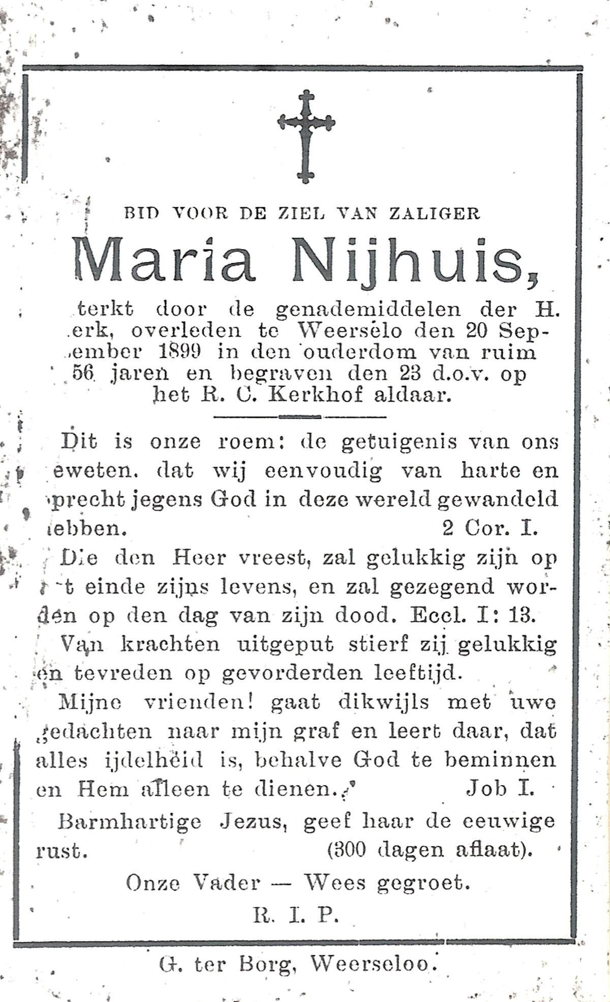 NIJHUIS, Maria, overleden op 20-09-1899 te Weerselo op 56-jarige leeftijd, begraven op 23-09-1899 te Weerselo.
