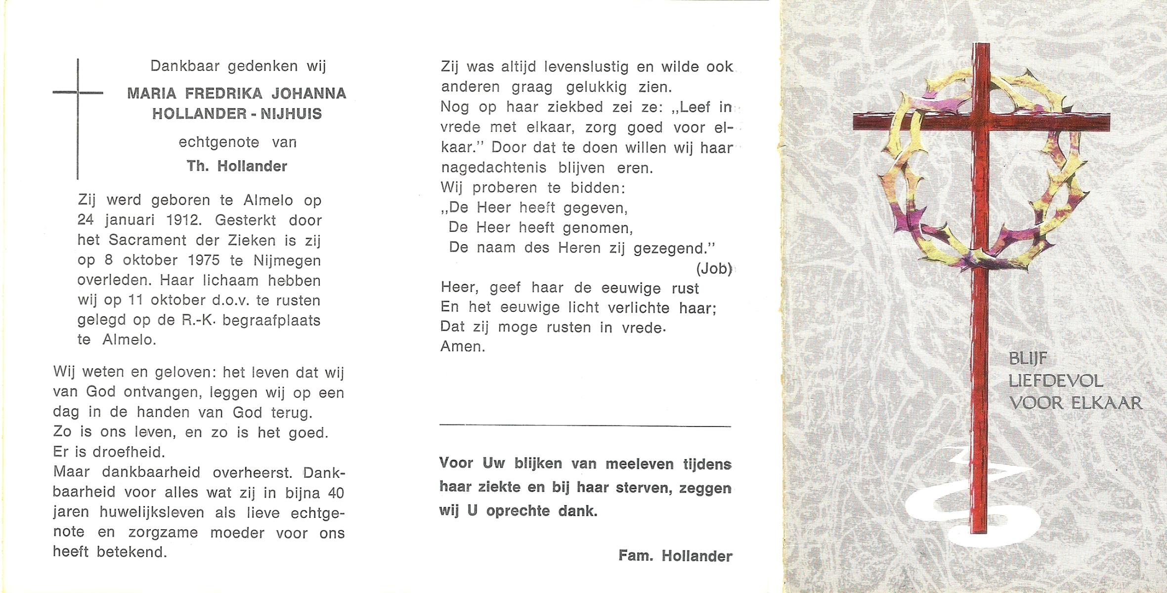 NIJHUIS, Maria Fredrika Johanna, geboren op 24-1-1912 te Almelo, overleden op 8-10-1975 te Nijmegen op 63-jarige leeftijd, begraven op 11-10-1975 te Almelo.