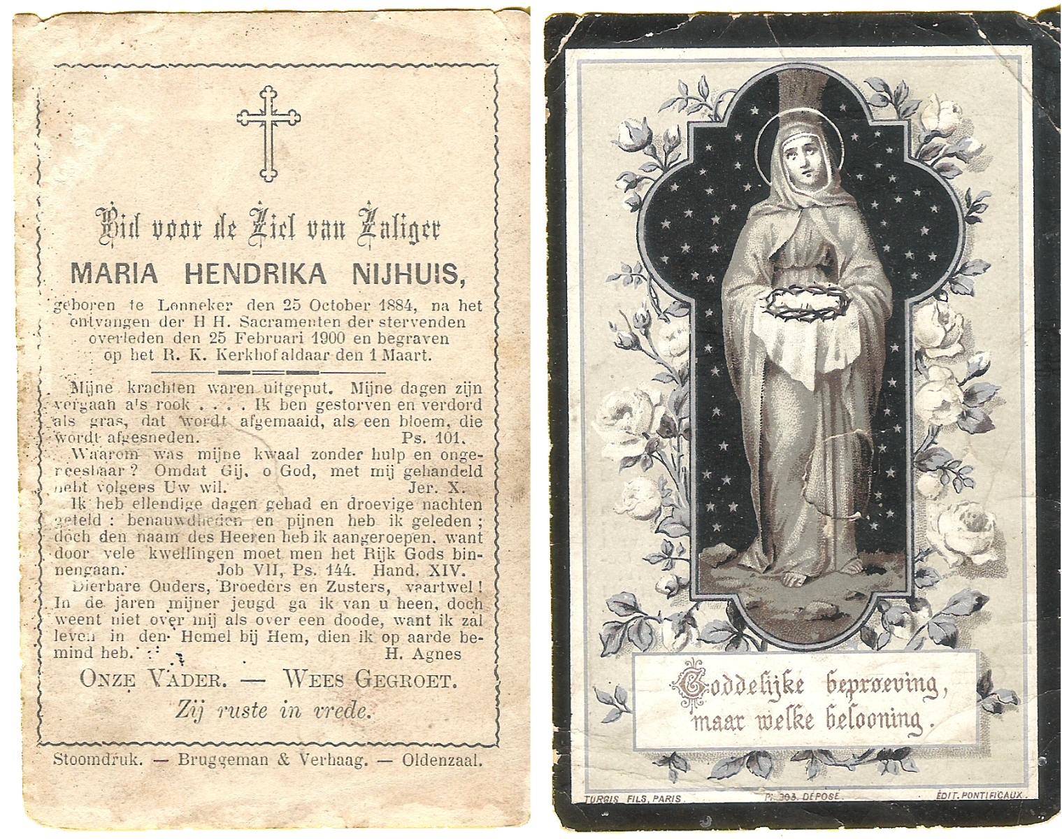 NIJHUIS, Maria Hendrika, geboren op 25-10-1884 te Lonneker, overleden op 25-2-1900 op 15-jarige leeftijd, begraven op 1-3-1900 te Lonneker.