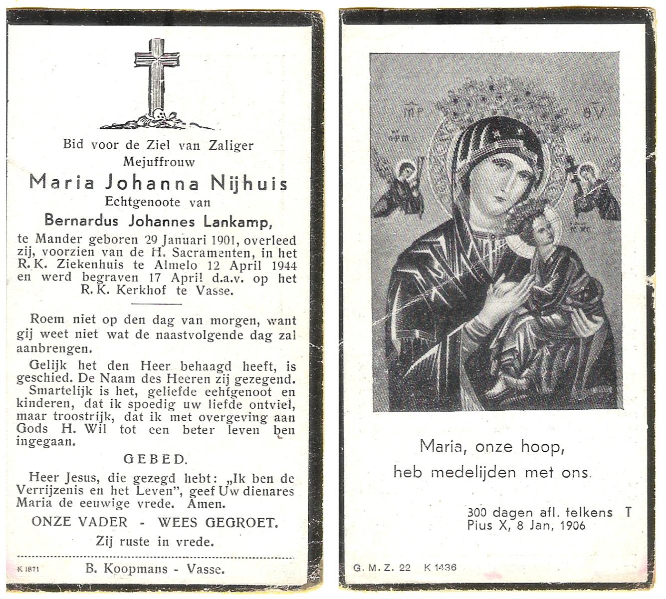 NIJHUIS, Maria Johanna, geboren op 29-1-1901 te Mander, overleden op 12-4-1944 te Almelo op 43-jarige leeftijd, begraven op 17-4-1944 te Vasse.