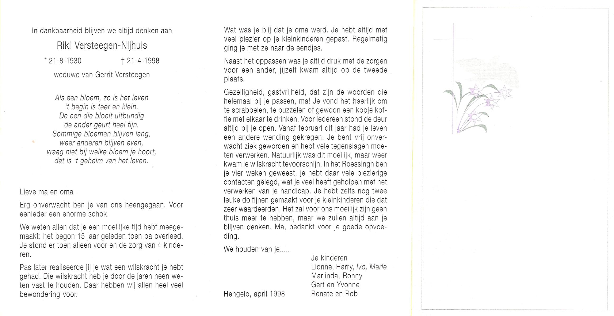 NIJHUIS, Riki, geboren op 21-8-1930, overleden op 21-4-1998 op 67-jarige leeftijd.