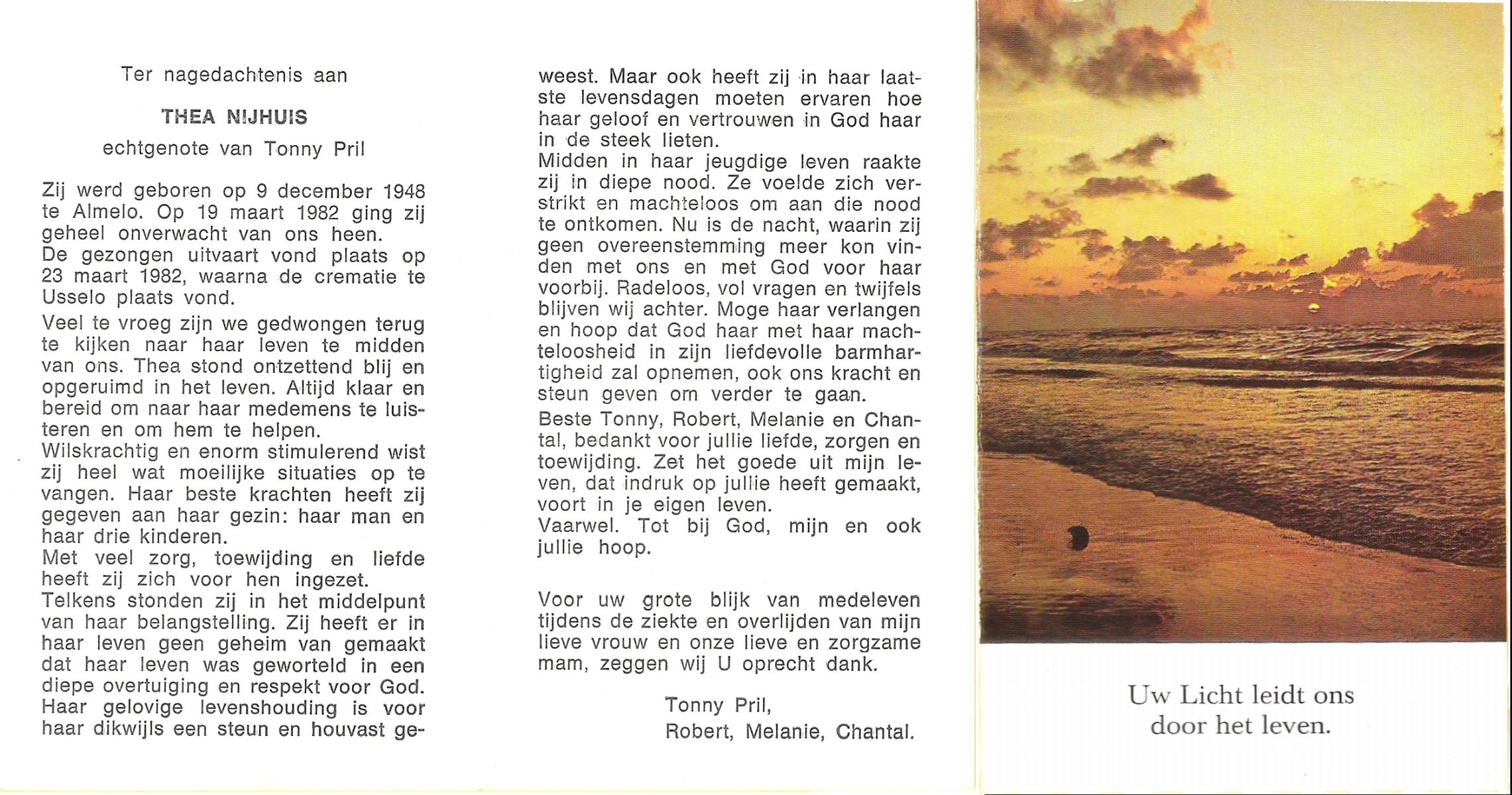 NIJHUIS, Thea, geboren op 9-12-1948 te Almelo, overleden op 19-3-1982 op 33-jarige leeftijd, gecremeerd op 23-3-1982 te Usselo.