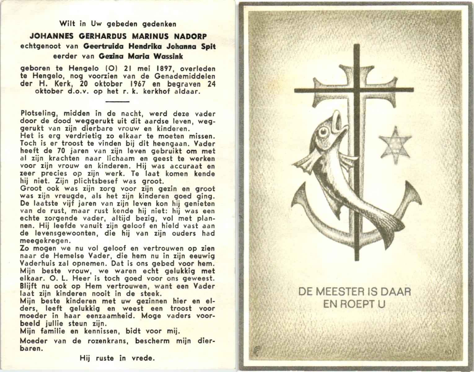 NADORP, , Johannes Gerhardus Marinus, geboren op 21-05-1897 te Hengelo (O), overleden op 20-10-1967 te Hengelo (O) op 70-jarige leeftijd, begraven op 24-10-1967 te Hengelo.