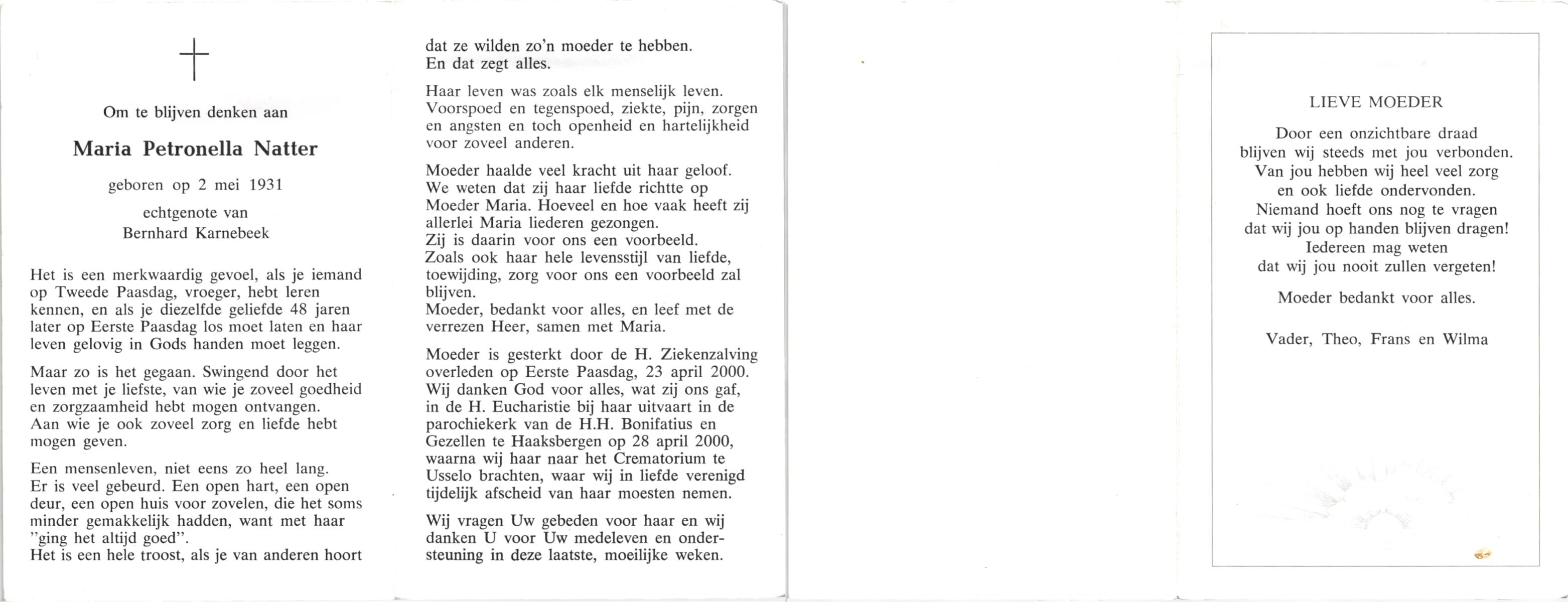 NATTER, , Maria Petronella, geboren op 2-5-1931, overleden op 23-4-2000 te Haaksbergen op 68-jarige leeftijd, gecremeerd op 28-4-2000 te Usselo.
