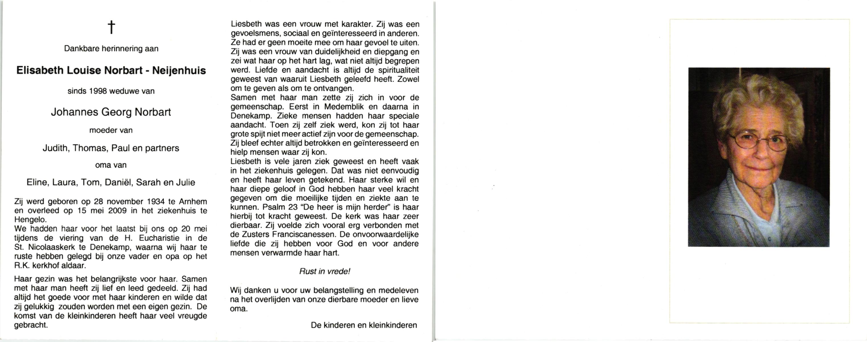 NEIJENHUIS, , Elisabeth Louise, geboren op 28-11-1934 te Arnhem, overleden op 15-5-2009 te Hengelo (O) op 74-jarige leeftijd, begraven op 20-5-2009 te Denekamp.